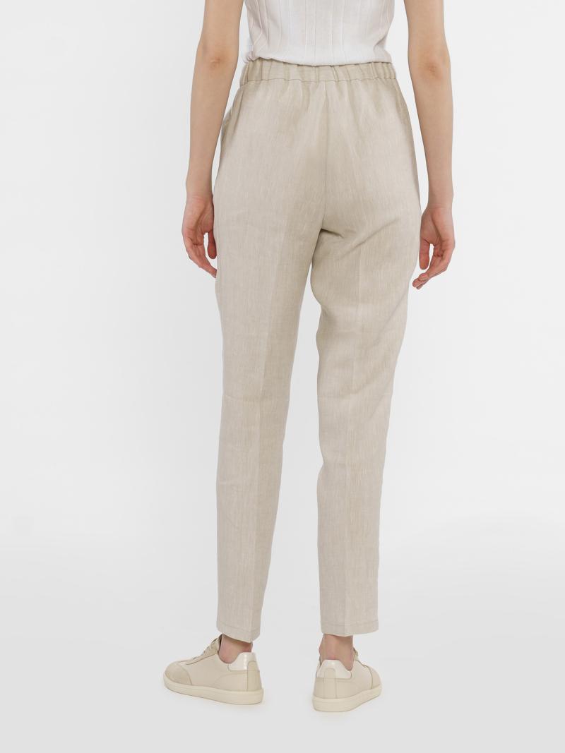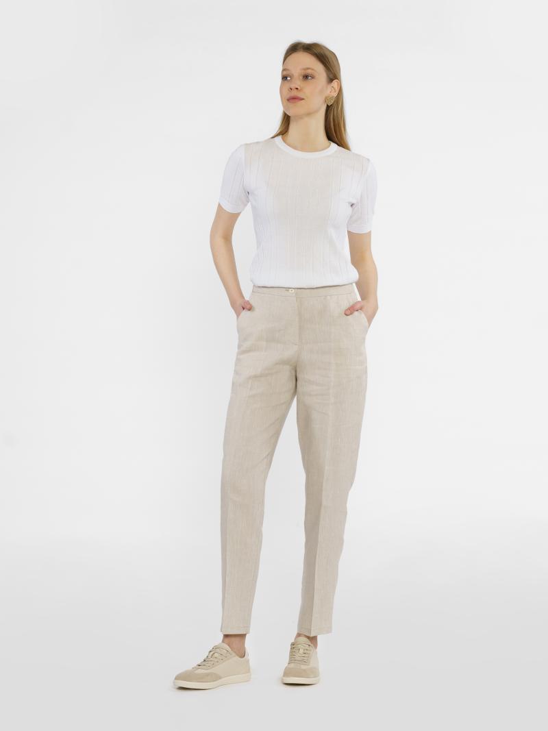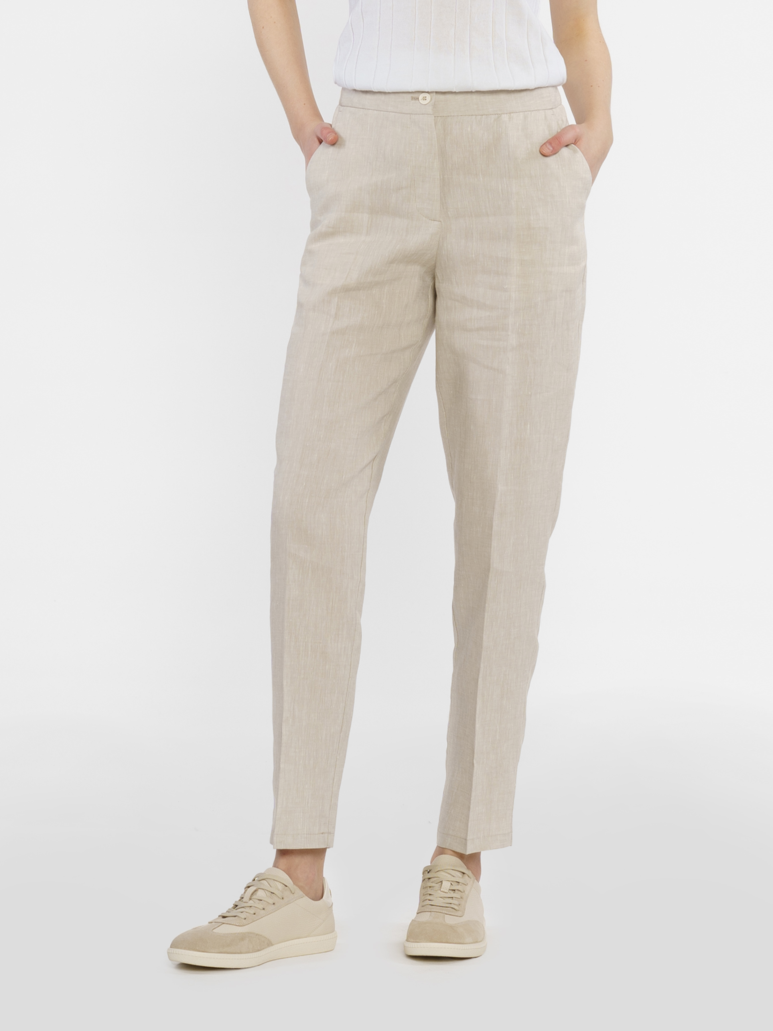 Жіночі бежеві штани Arber з натуральної екологічно льняної тканини - це ідеальне поєднання комфорту і витонченого повсякденного стилю. Завдяки властивостям натуральної тканини та розслабленому крою зі зручним поясом на гумці ззаду, модель дуже комфортна, що створює безтурботну привабливість. Штани завужені до низу, з двома похилими бічними кишенями. Вдало поєднуються з льняними жакетами, сорочками й трикотажем. Для комплекту можна поєднувати з жакетом з такої ж тканини W02.12.16.424.