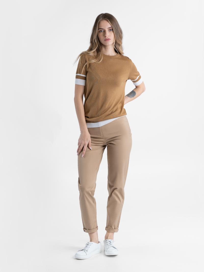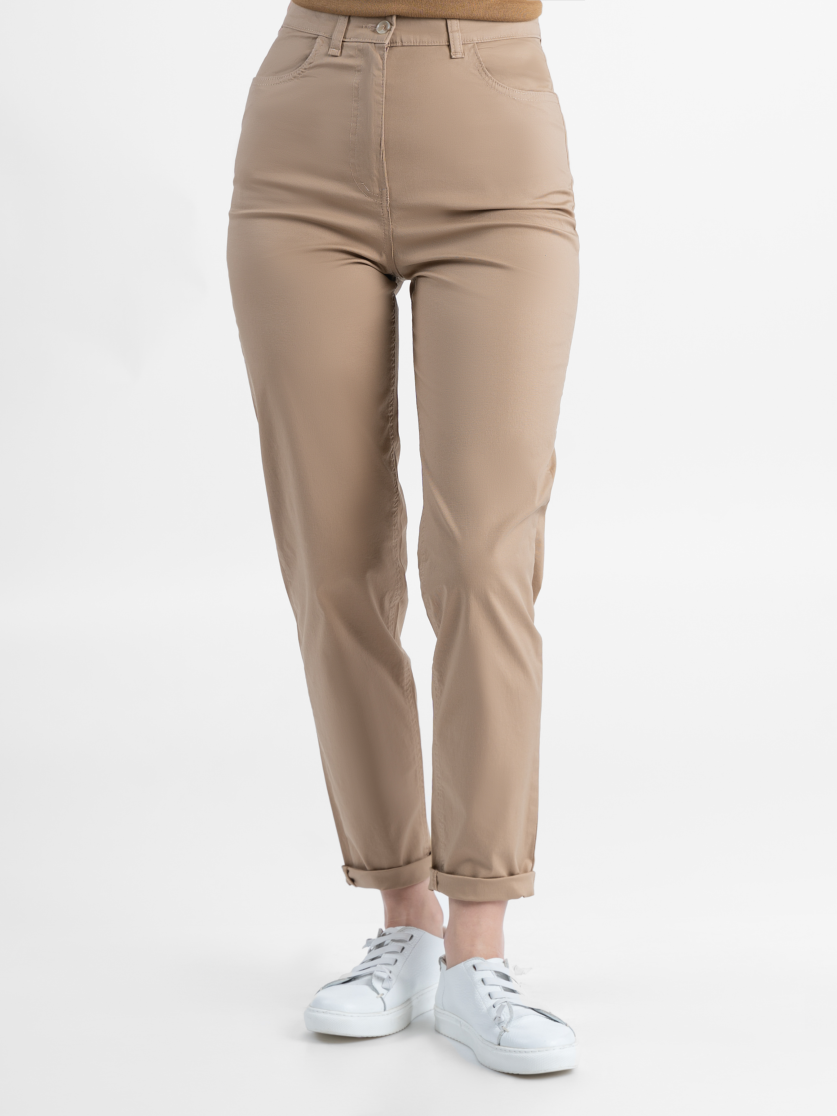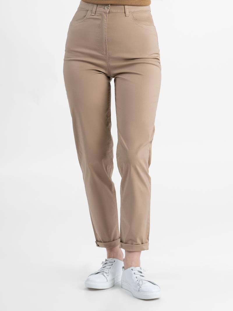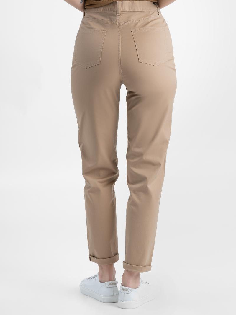 Бежеві брюки MOM Arber з бавовняної тканини. Модель джинсова, з п'ятьма кишенями, завужена до низу, комфорт забезпечує добавка эластана. Застібка на блискавку і гудзик. Виріб прекрасно доповнить повсякденний гардероб у поєднанні з блейзером, трикотажем або сорочками casual.