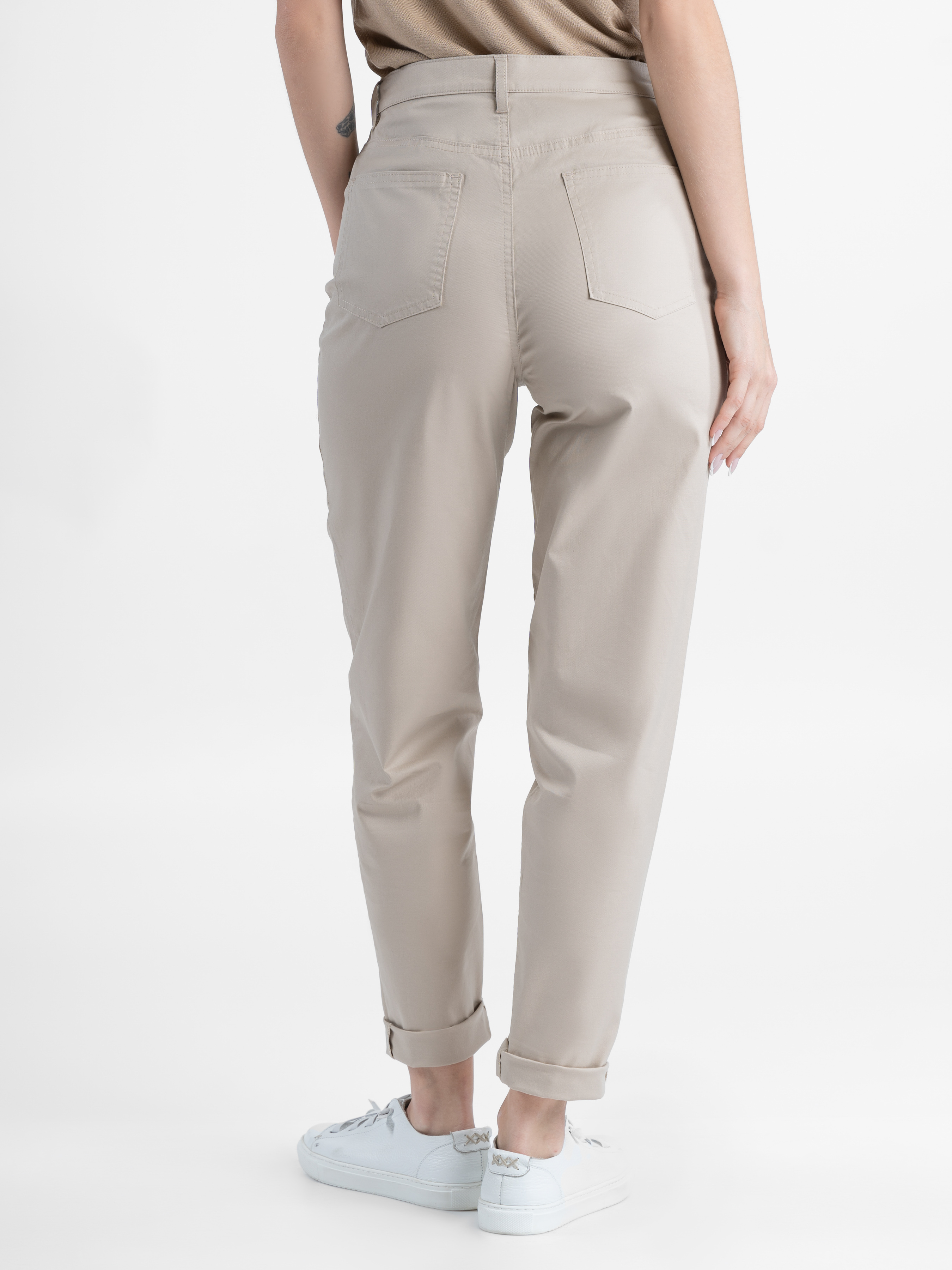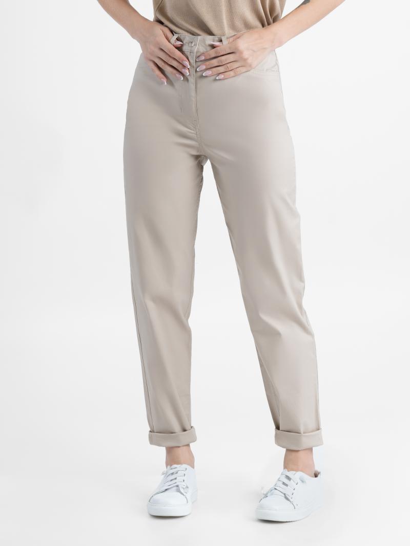 Бежеві брюки MOM Arber з бавовняної тканини. Модель джинсова, з п'ятьма кишенями, завужена до низу, комфорт забезпечує добавка эластана. Застібка на блискавку і гудзик. Виріб прекрасно доповнить повсякденний гардероб у поєднанні з блейзером, трикотажем або сорочками casual.