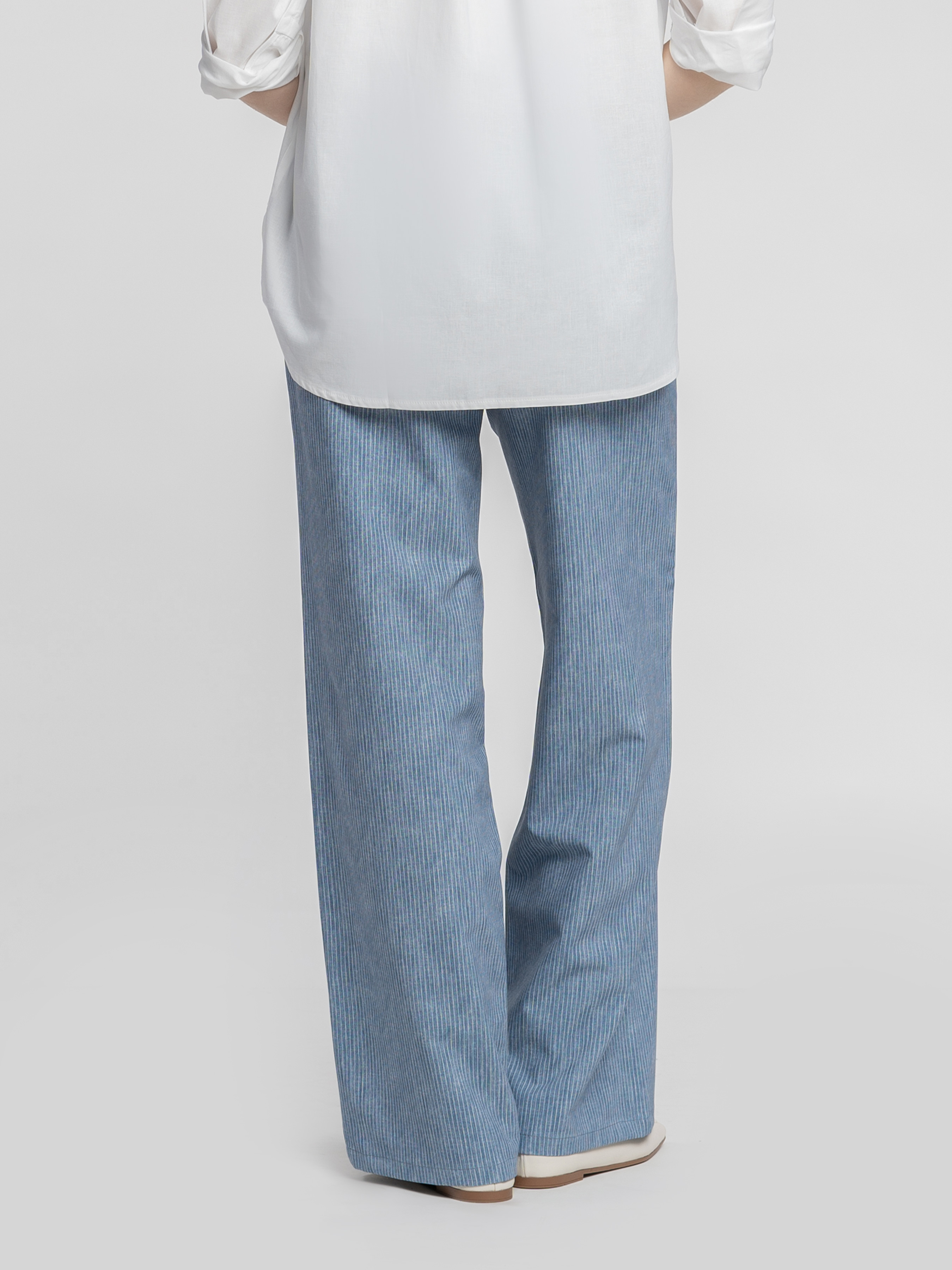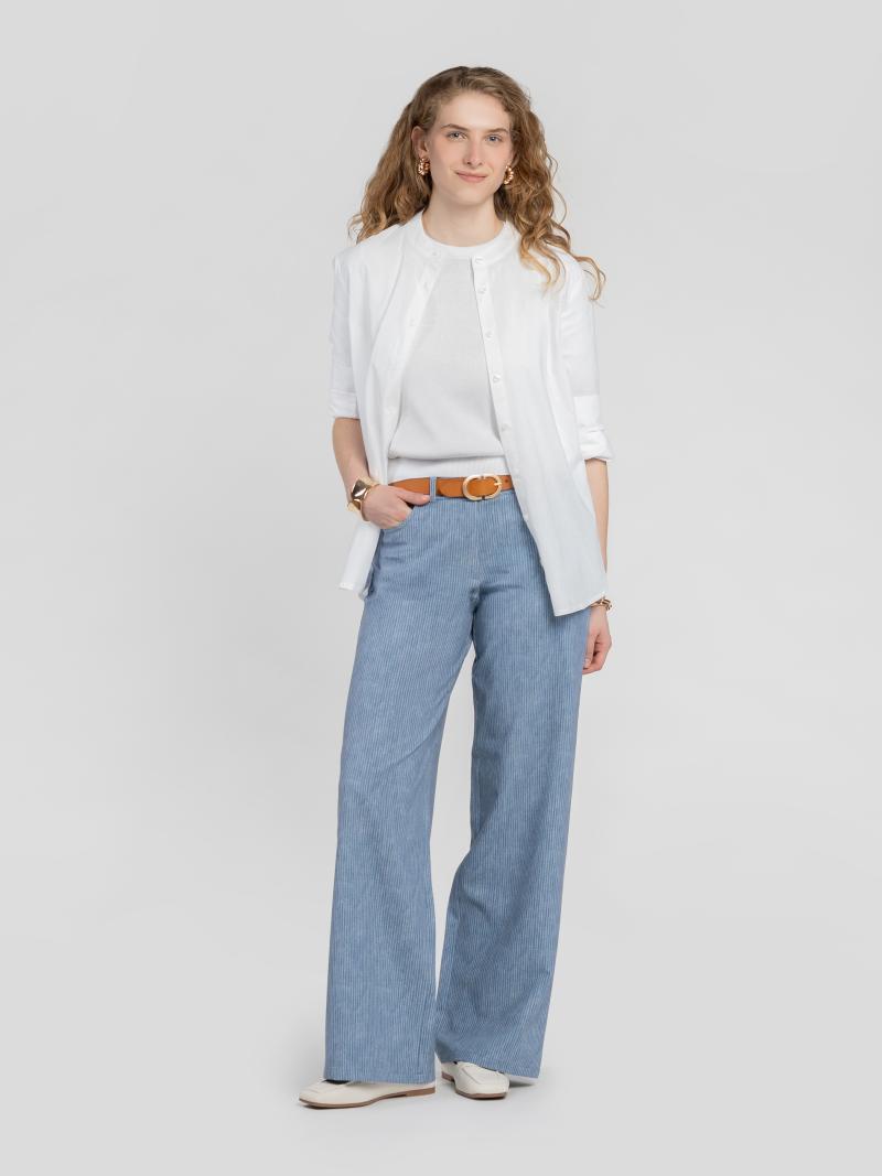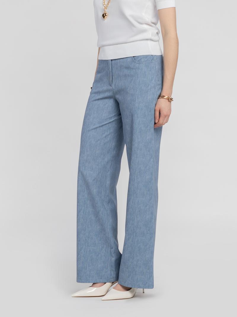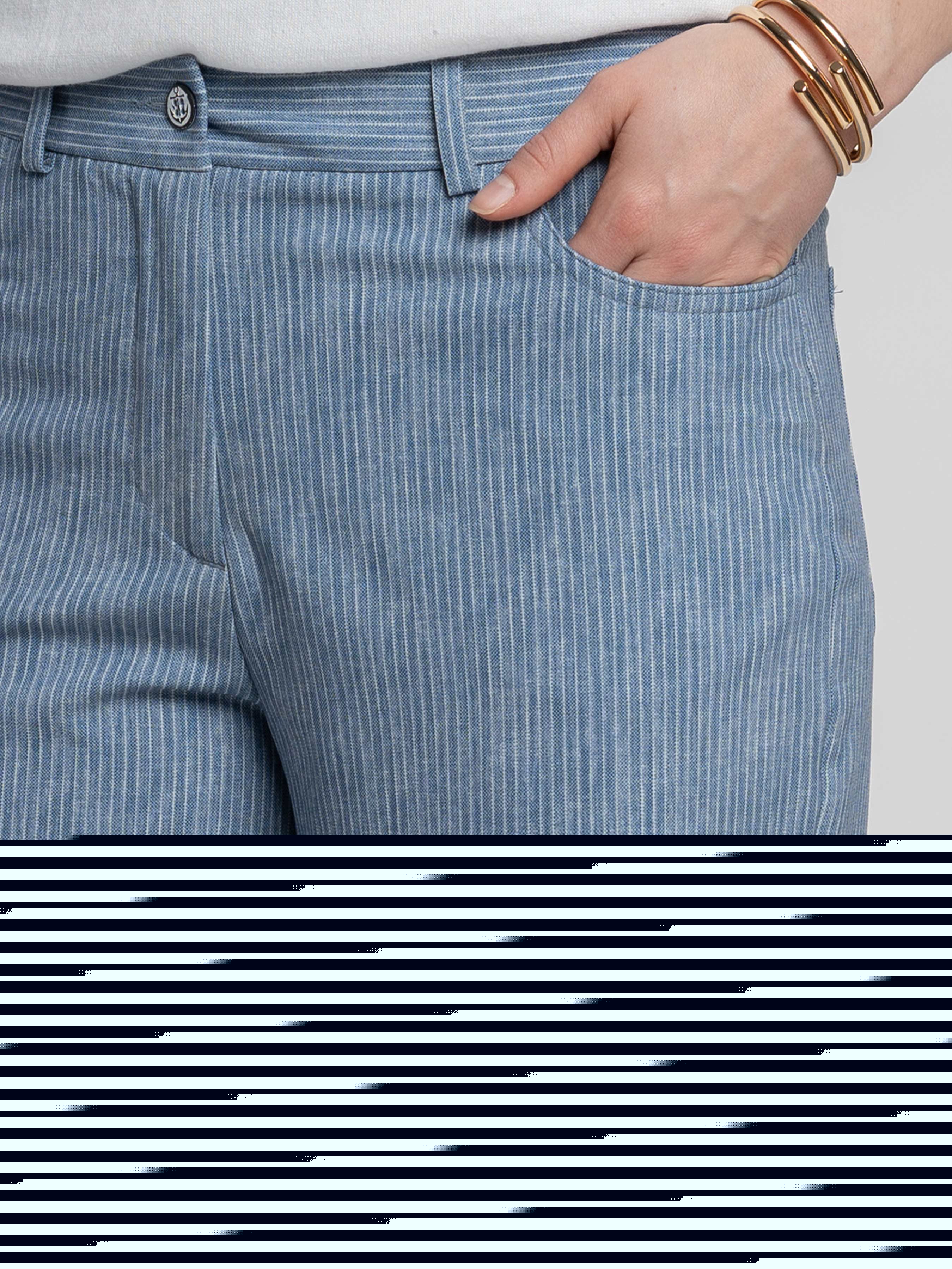 Women's blue Arber trousers made of innovative fabric with viscose and elastane. The five-pocket design has a high fit and a slightly extended cut to the bottom. The classic five-pocket design adds comfort and makes these trousers a versatile choice for casual and office looks. Model pictured in size 42. Height: 176 cm. Parameters: 90/64/94