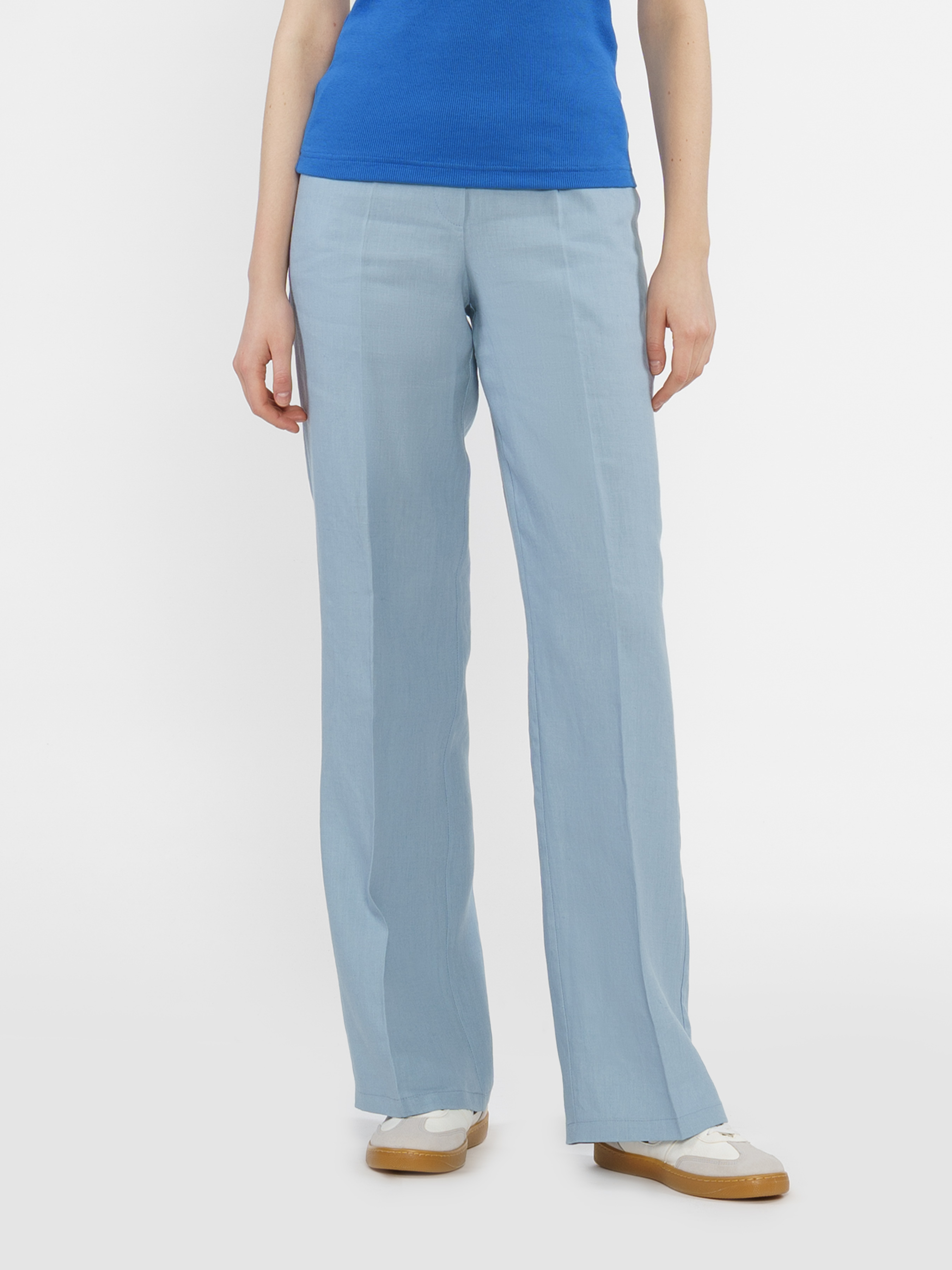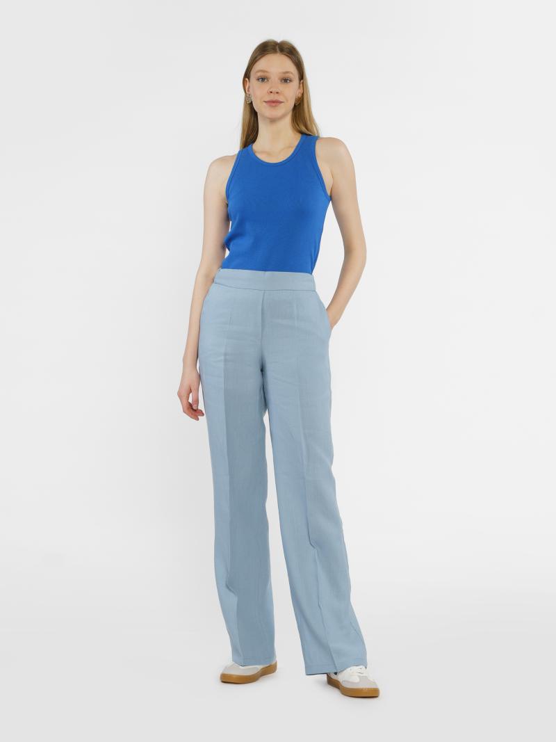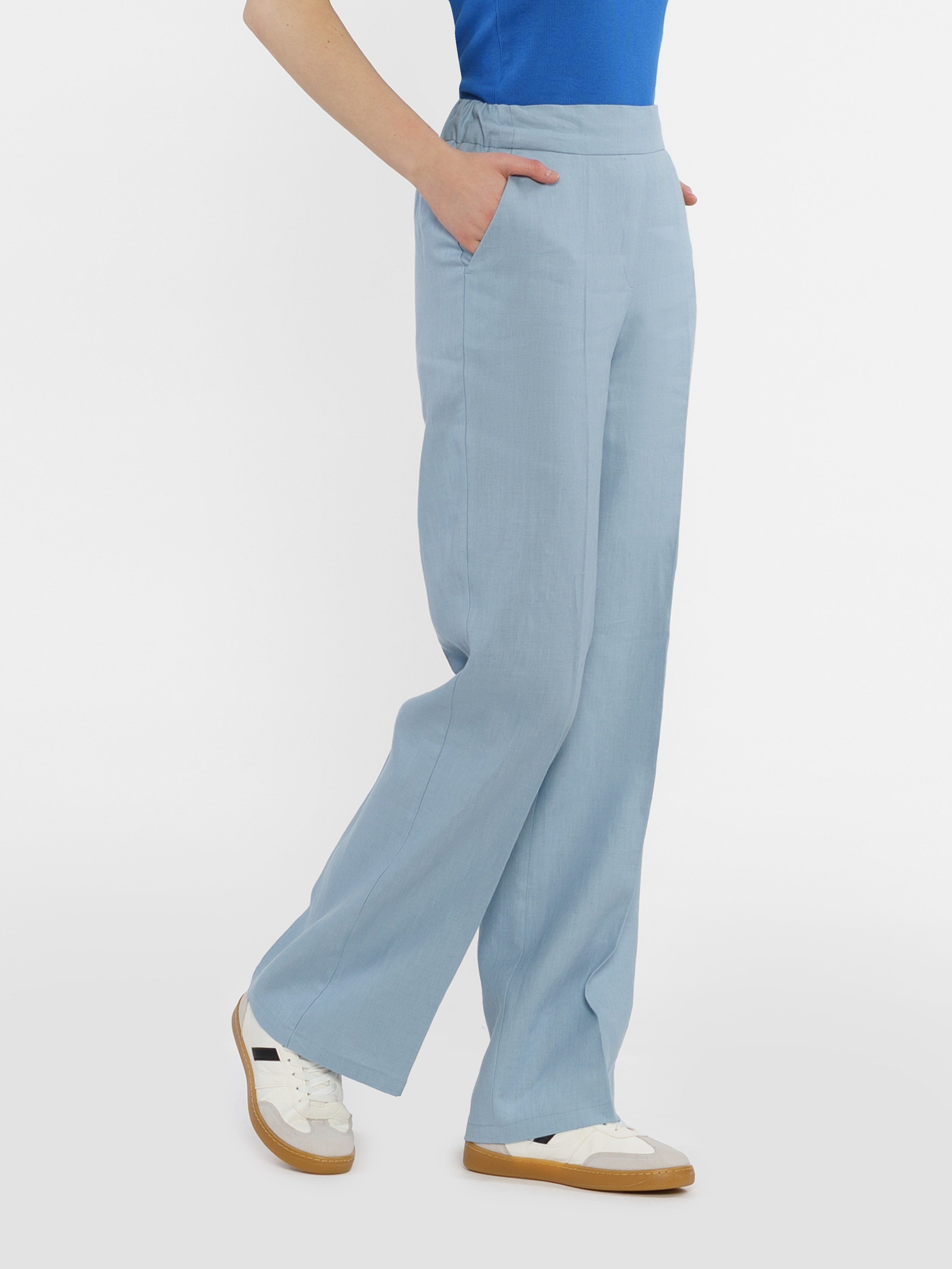 Жіночі брюки Arber блакитного кольору створені з лляної тканини. Висока посадка, прямого крою, зі стрілками, з двома похилими кишенями з боків та поясом на резинці. Штани можна поєднувати з жакетом W02.11.23.422 та жилетом W20.05.23.422 з такої самої тканини.
