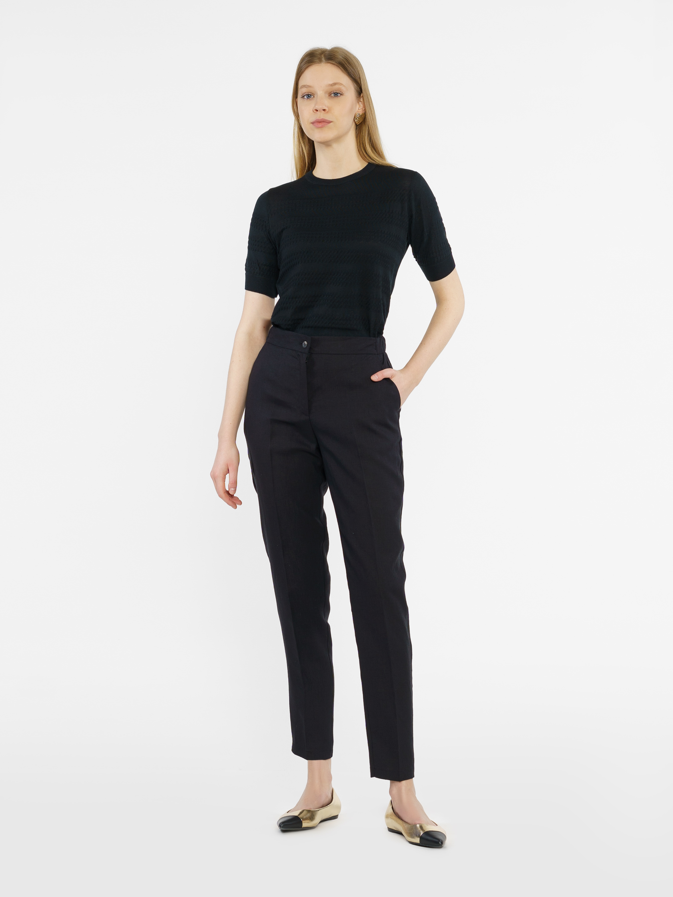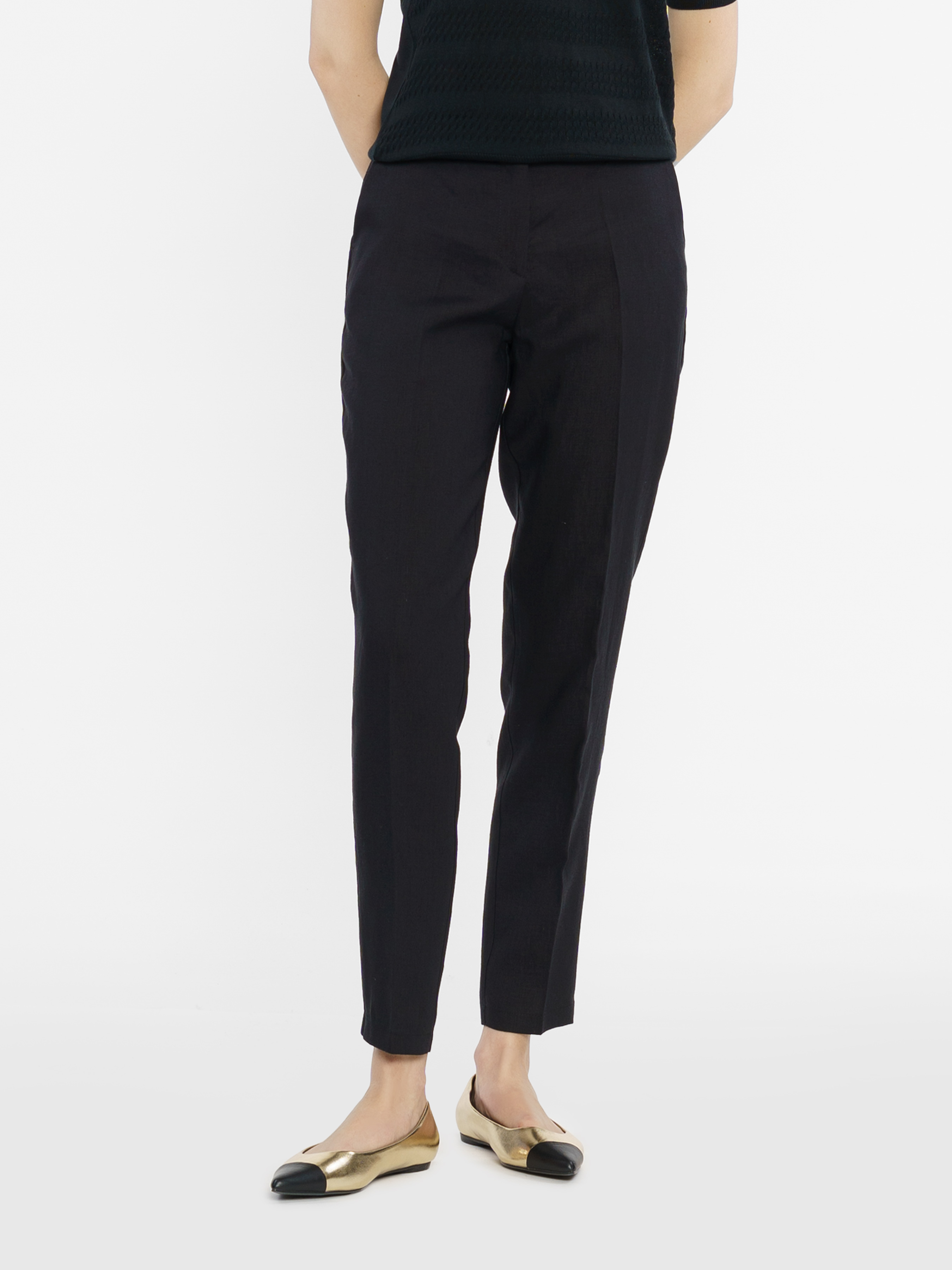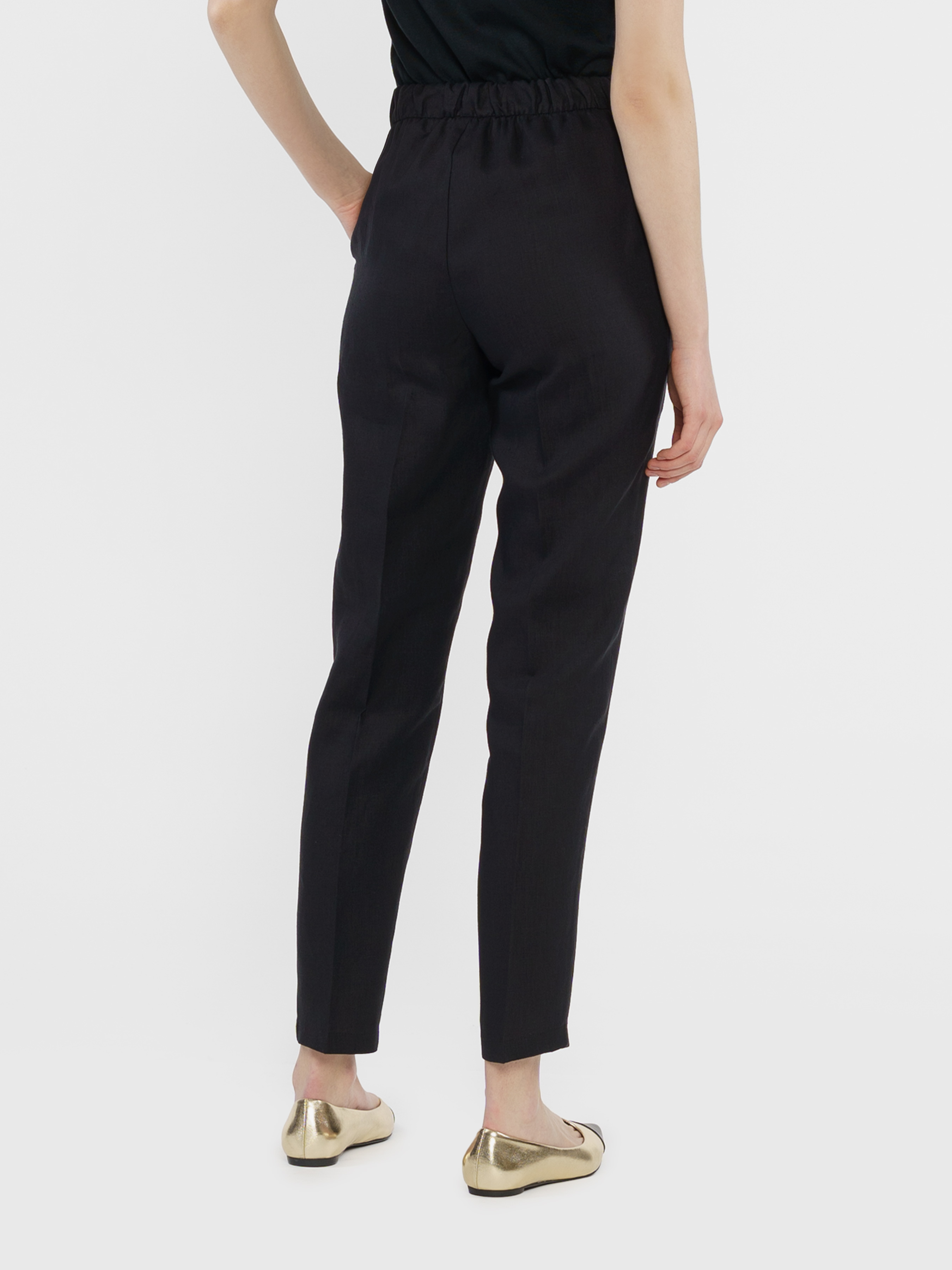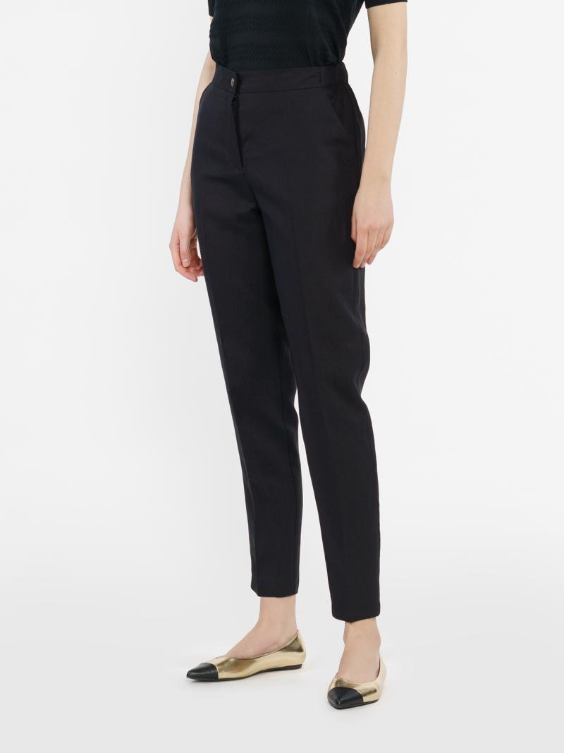 Женские брюки Arber черного цвета, созданные из льняной ткани. Высокая посадка зауженные к низу, с двумя наклонными карманами и поясом на резинке. Брюки можно сочетать с жакетом W02.13.02.421 из такой же ткани.