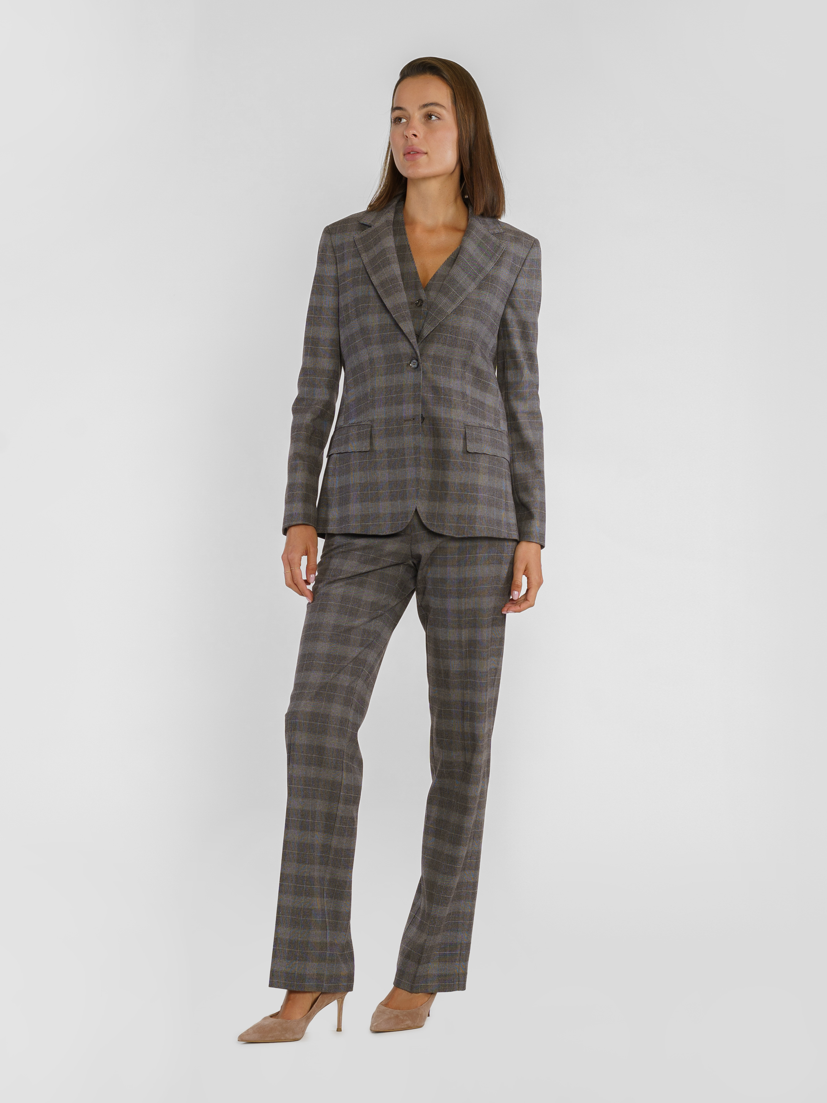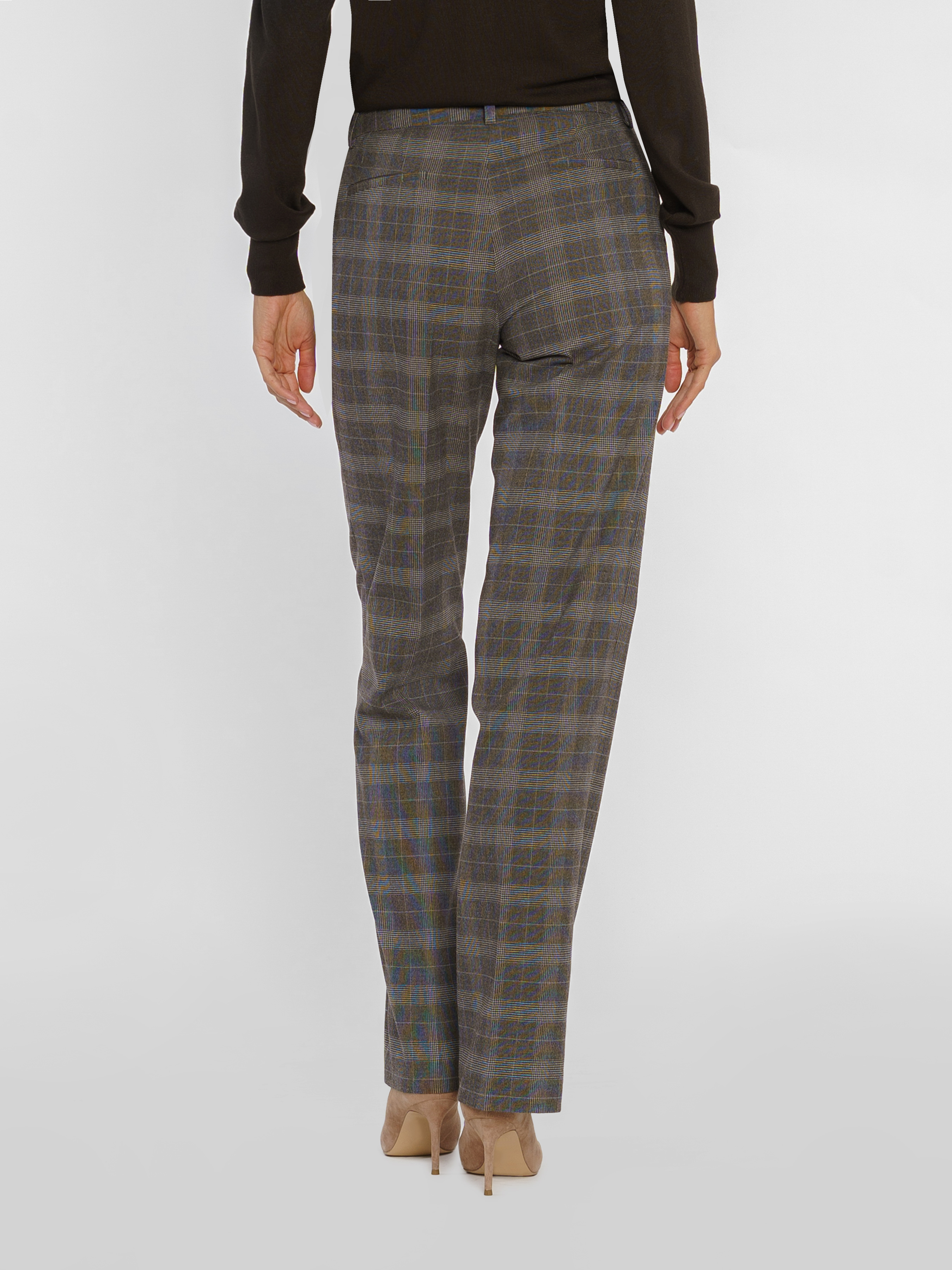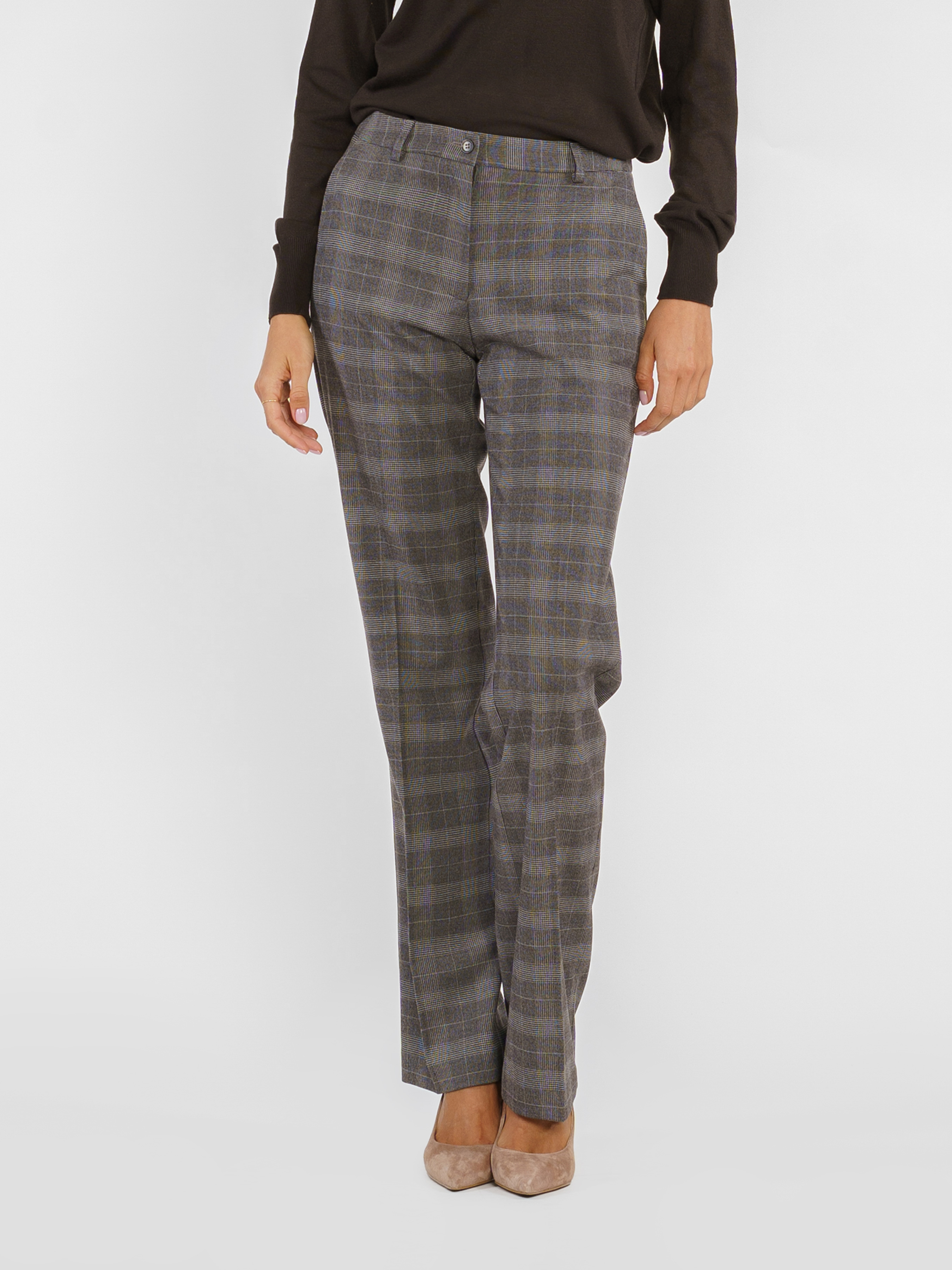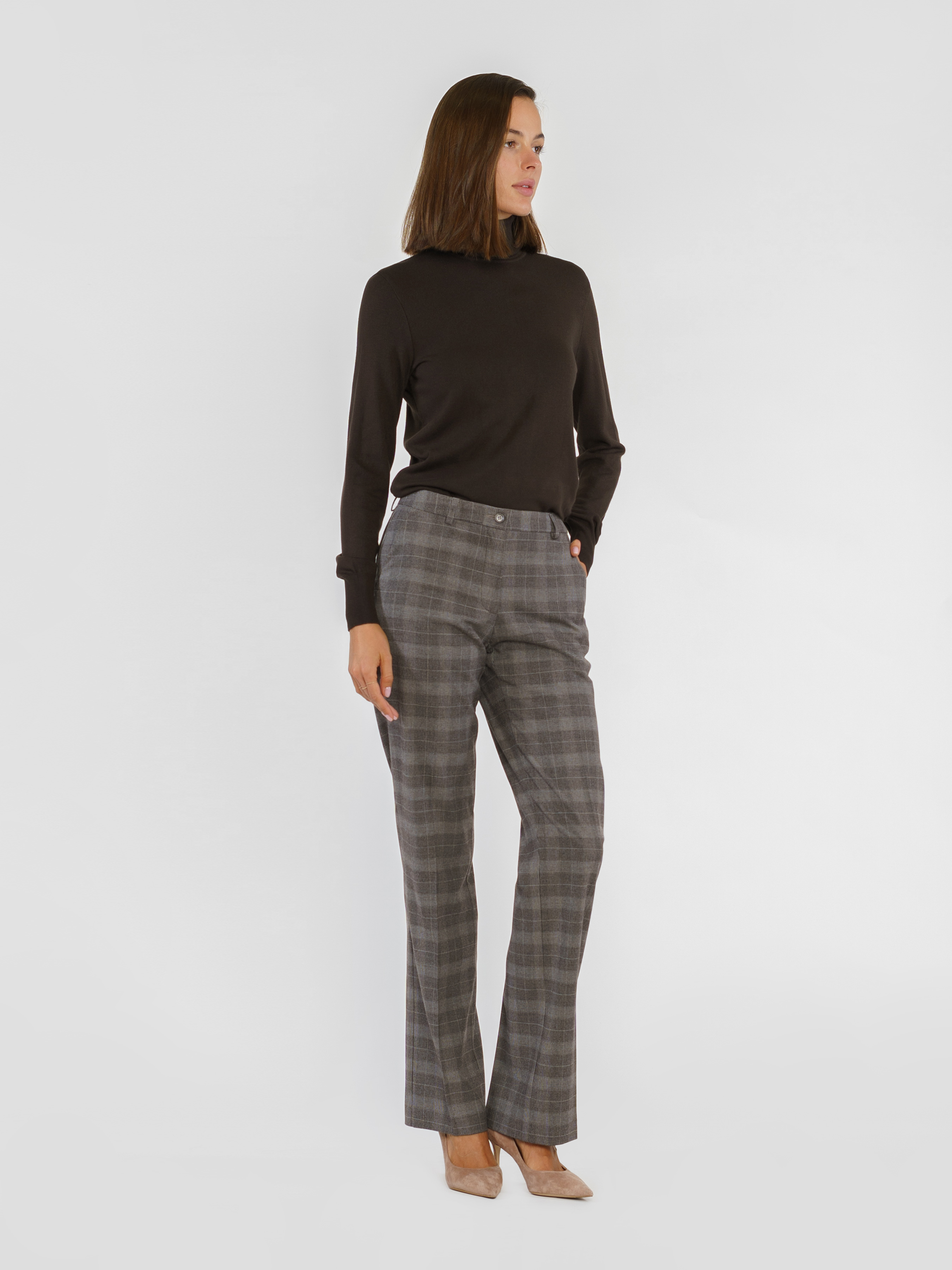 Womens Arber brown checkered pants made of innovative fabric with the addition of silky viscose. They have a mid-rise, straight cut, two pockets and fasten with a zipper. They look great when paired with the classic W02.07.39.431 jacket and W20.02.39.431 vest made of the same fabric. The model on the photo is in size 42. Height: 178 cm. Parameters: 89/60/90