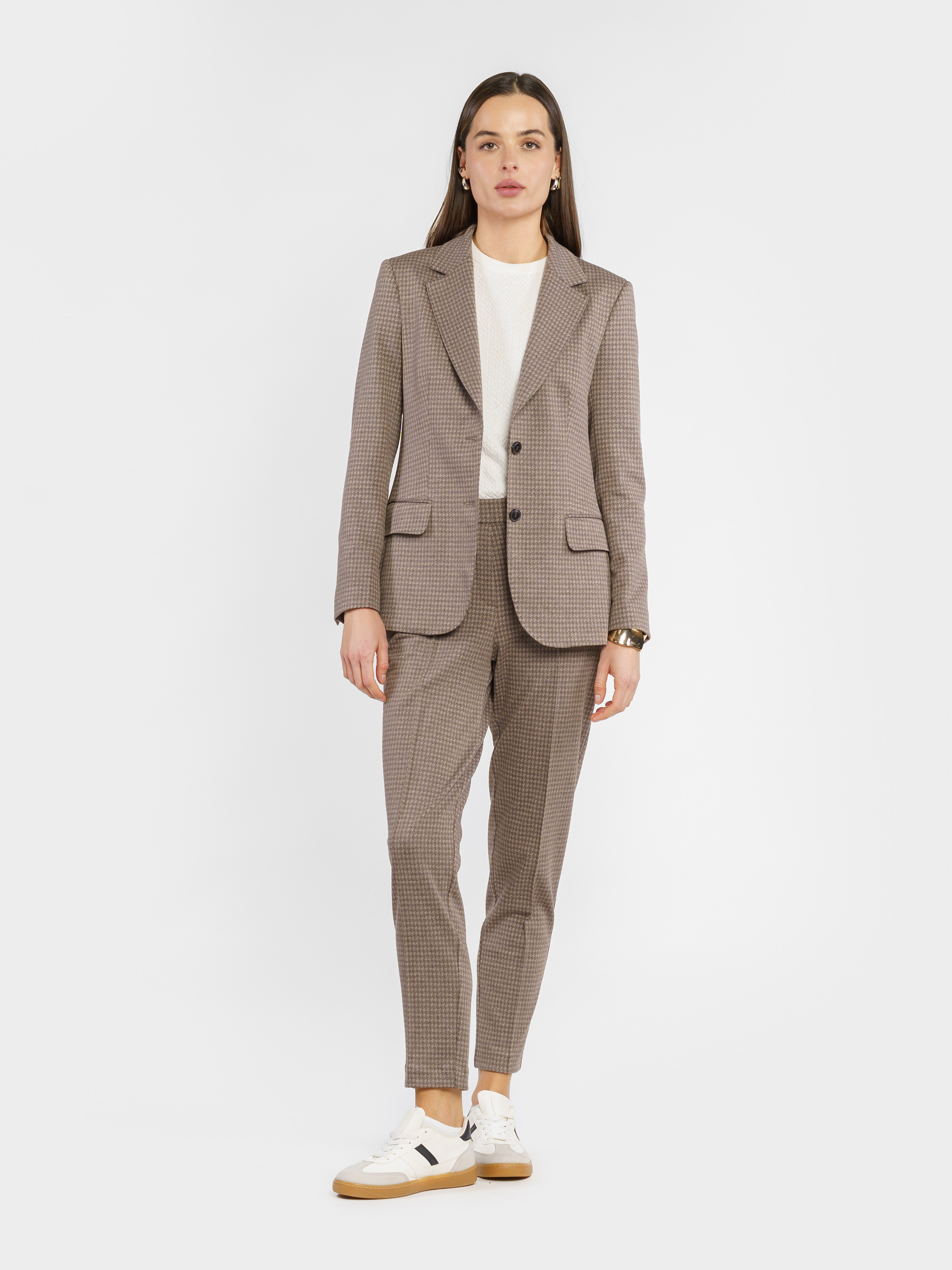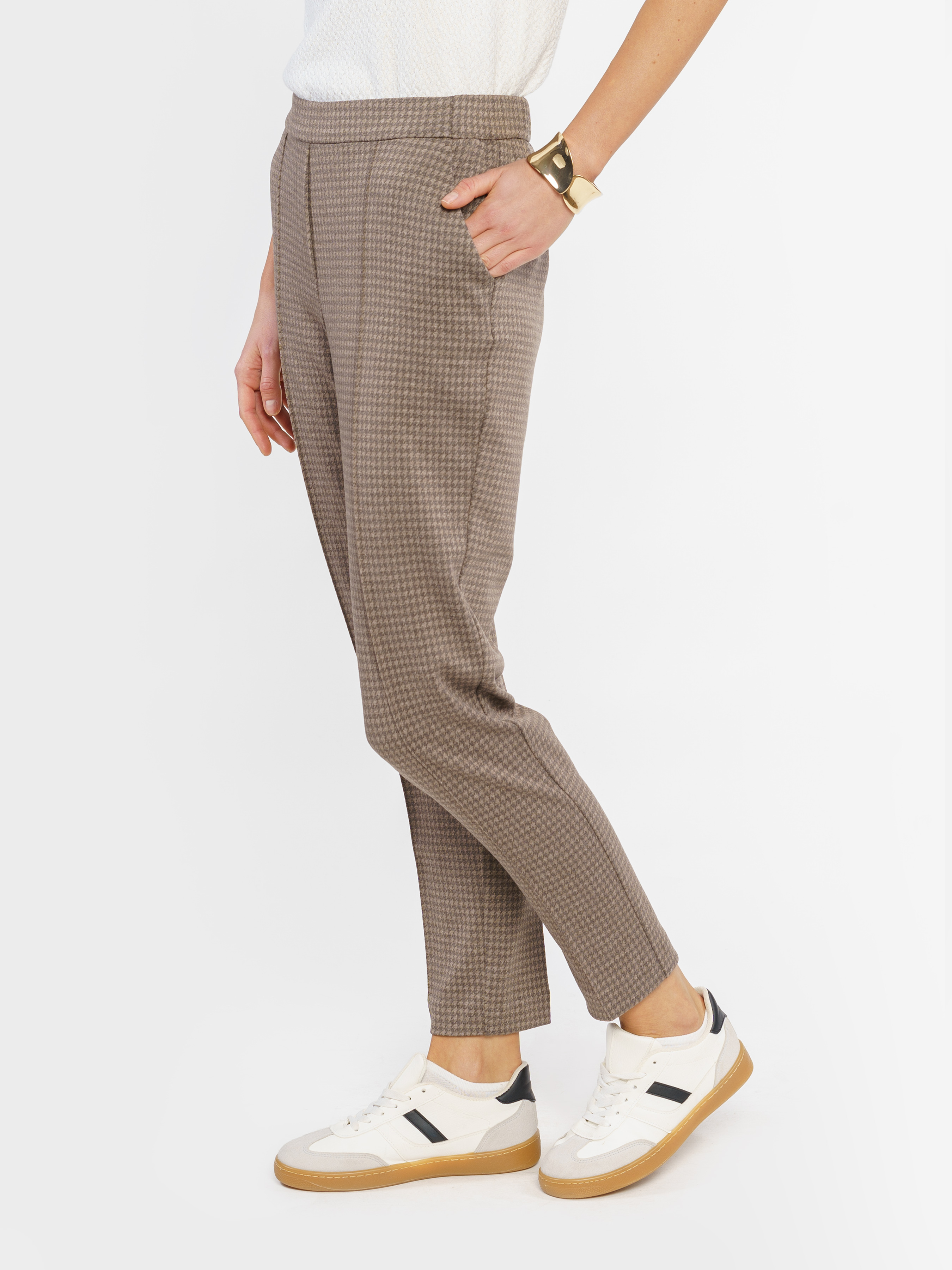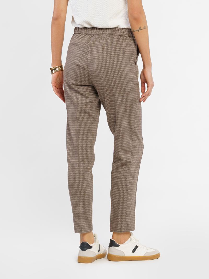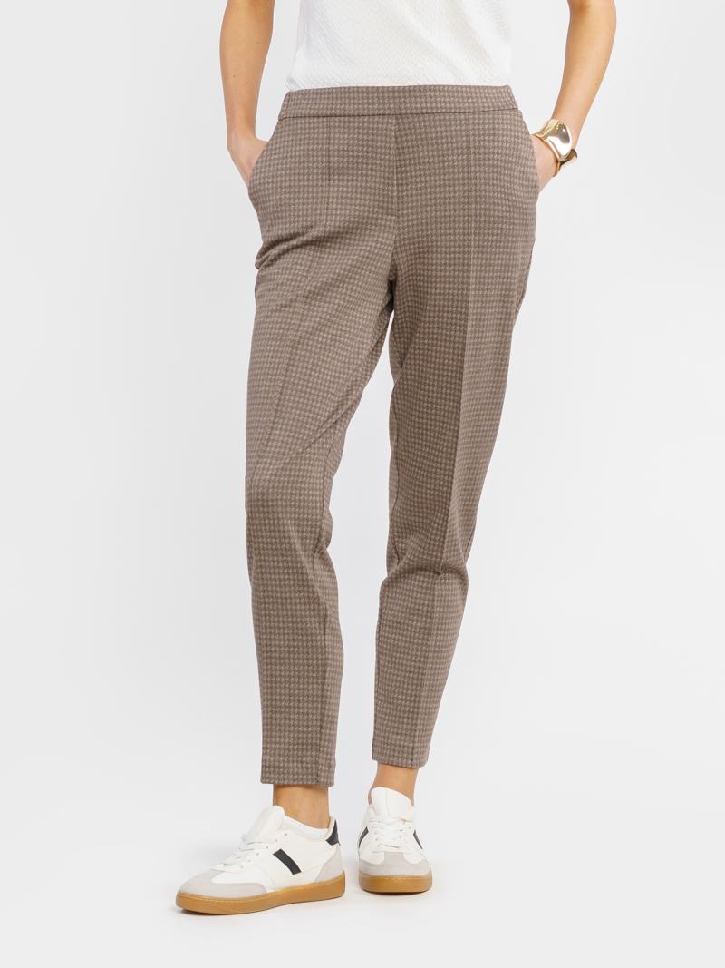 Women's Arber brown checkered knitted pants made of innovative fabric with silky viscose blend comfort and practicality. The model has a medium fit, tapered to the bottom, with a comfortable elastic waistband at the back, and two slanted pockets. They look especially great in a set with a jacket W02.03.39.512 made of the same fabric. The model on the photo is in size 42. Height: 178 cm. Parameters: 89/60/90