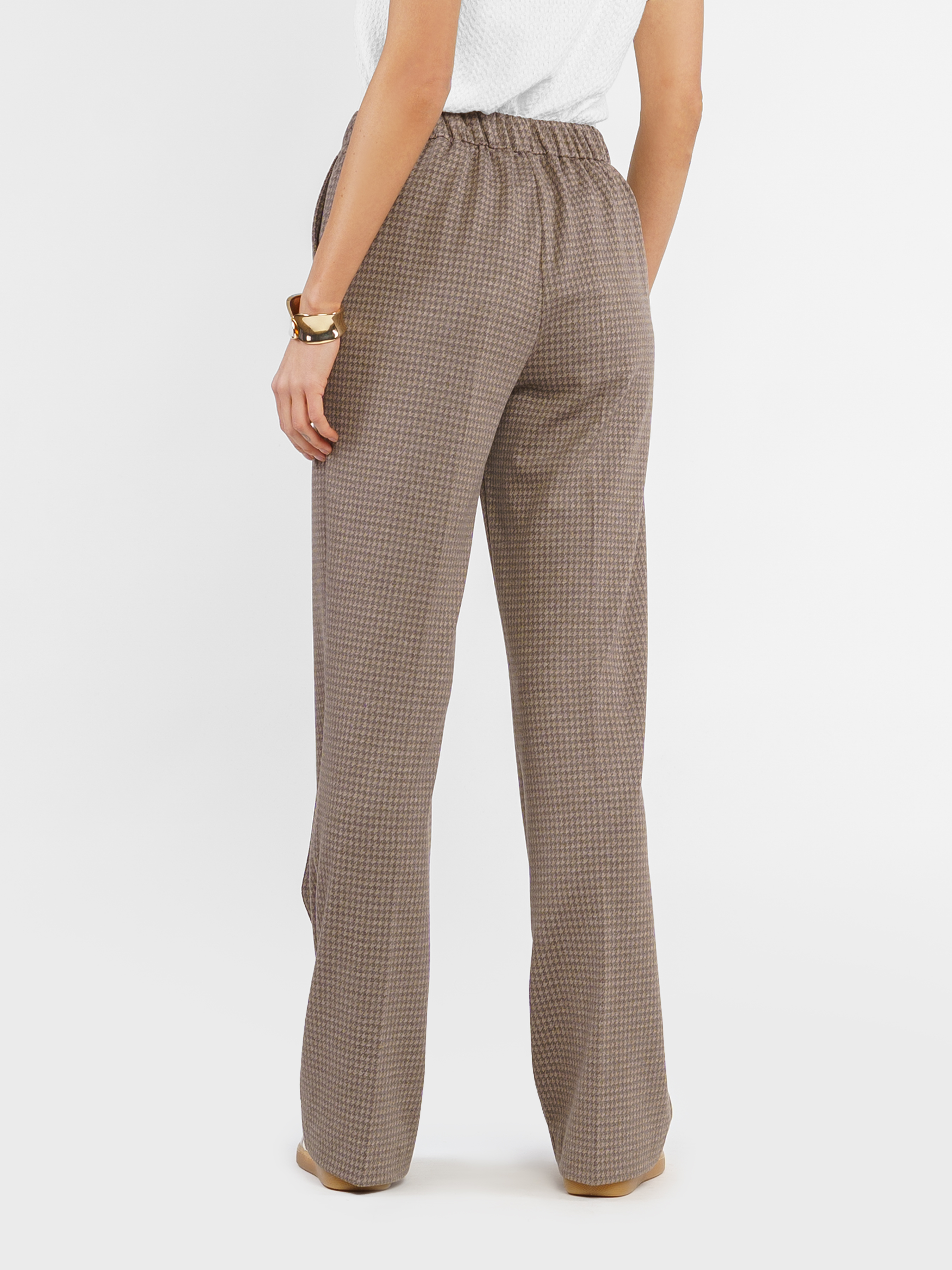 Women's Arber brown checkered knitted pants made of innovative fabric with silky viscose blend comfort and practicality. The model has a medium fit, a loose cut with a comfortable elastic waistband at the back, and two slanted pockets. They look especially great in a set with a jacket W02.03.39.512 made of the same fabric. The model on the photo is in size 42. Height: 178 cm. Parameters: 89/60/90