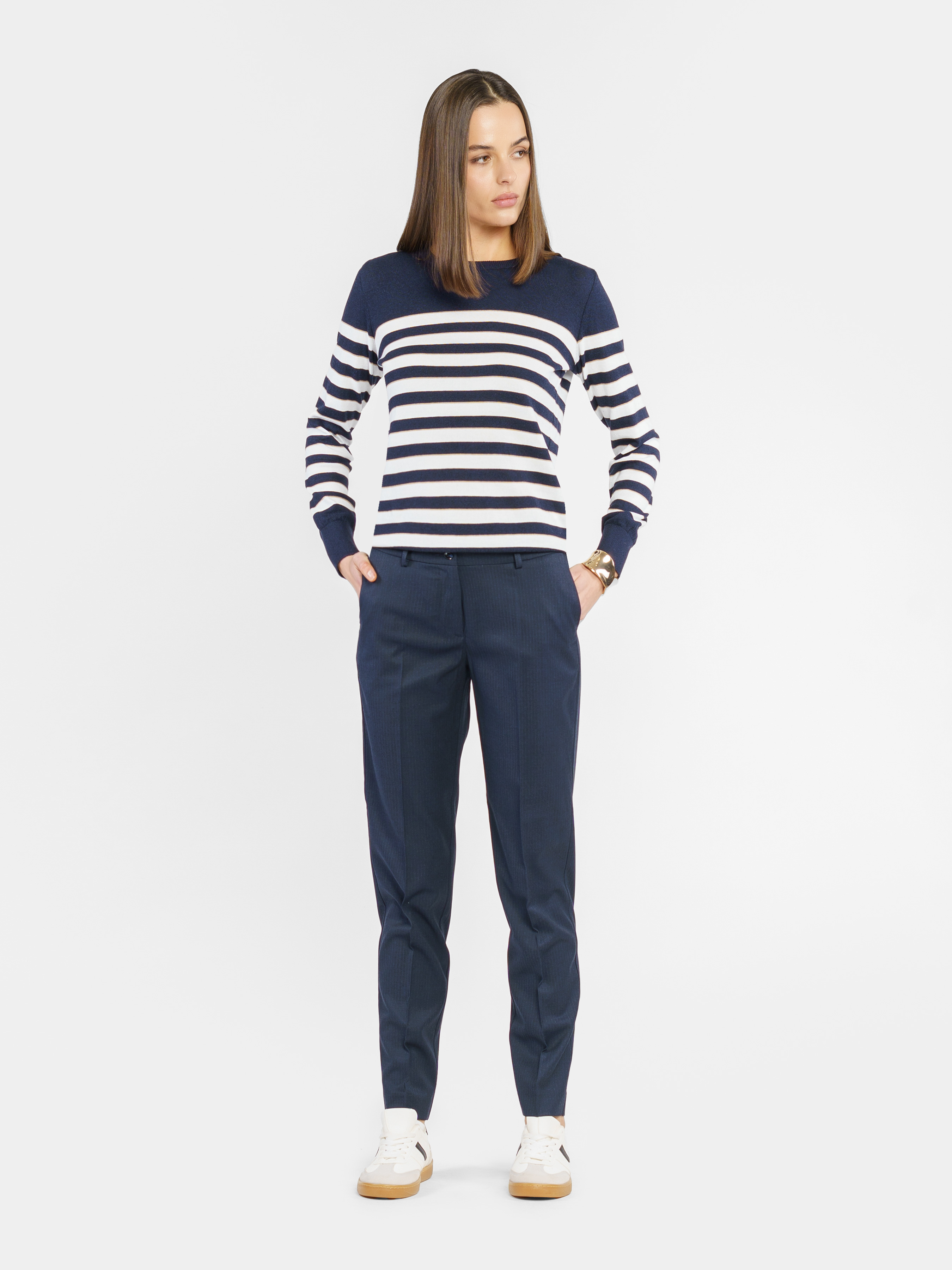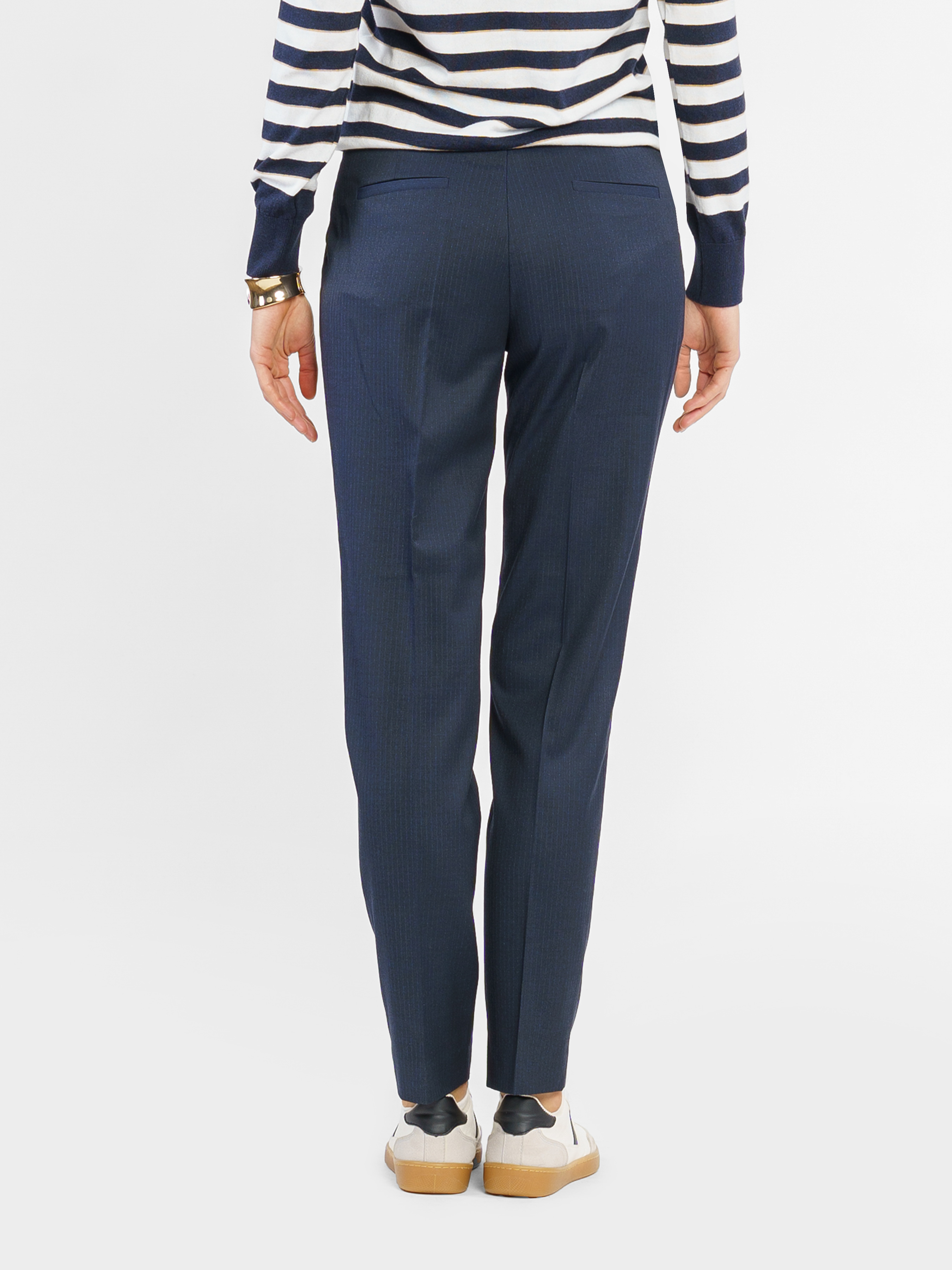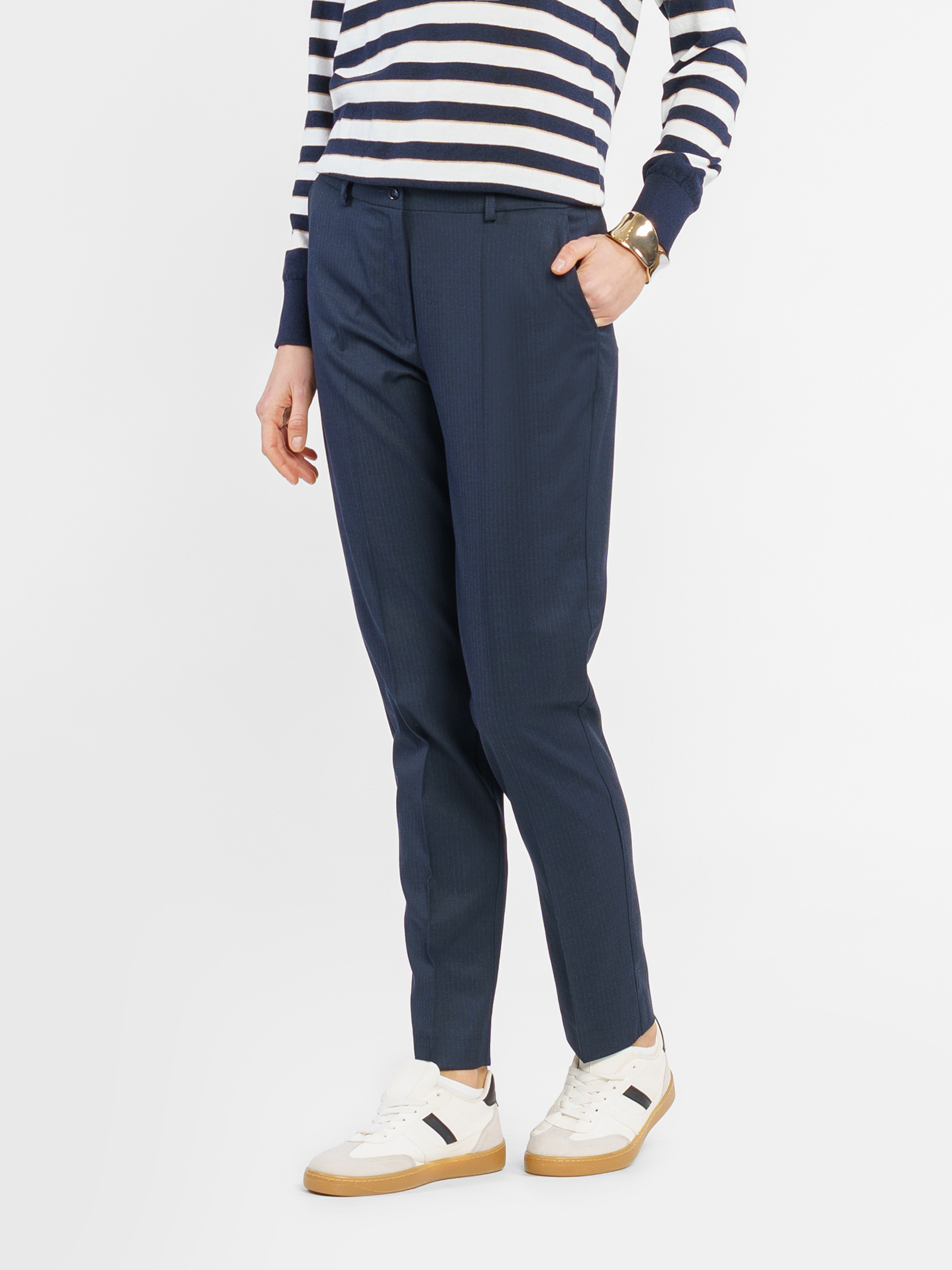 Arber women's navy blue striped pants made from an innovative viscose fabric. The medium fit, slim fit to the bottom and arrows create an elegant silhouette. Two side and two back pockets add practicality, while the zipper and button closure provide convenience. Perfectly matched with jacket W02.01.09.511 in the same fabric, creating a stylish choice for office or casual closet. The model on the photo is in size 44. Height: 178 cm. Parameters: 89/60/90