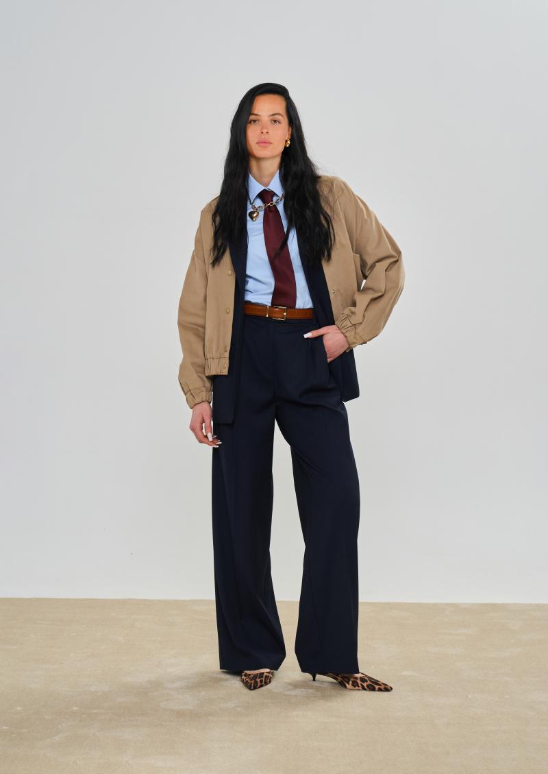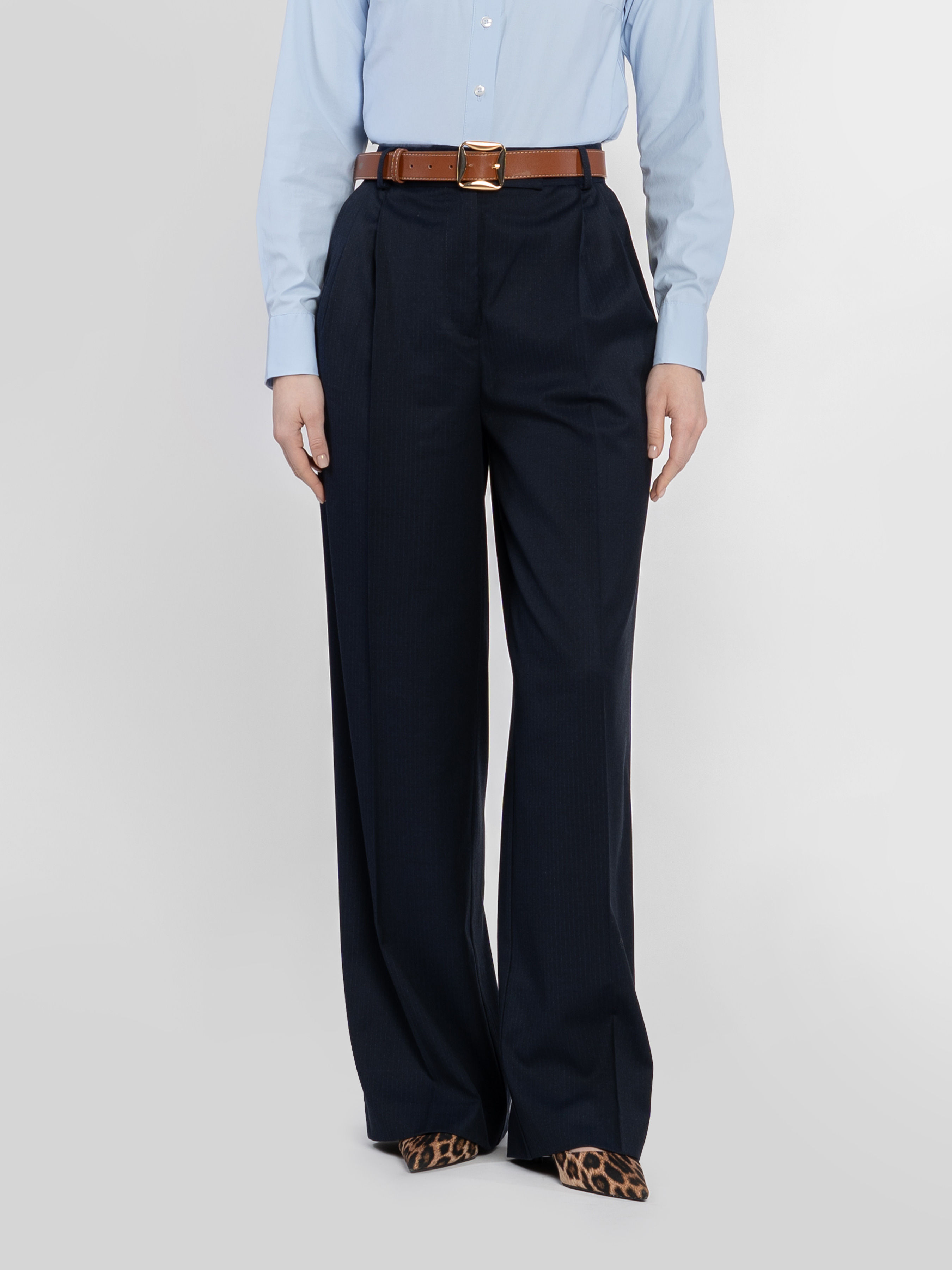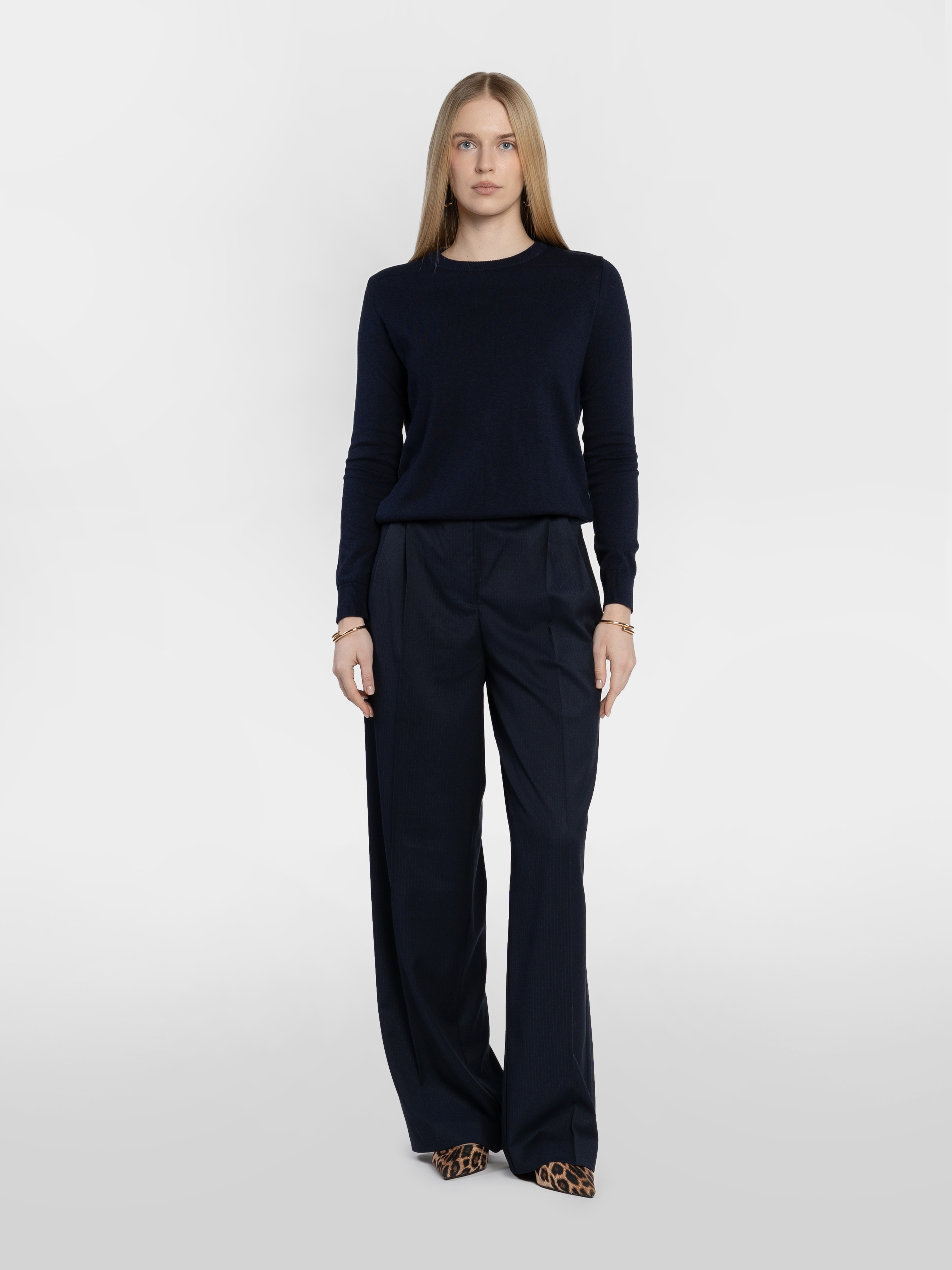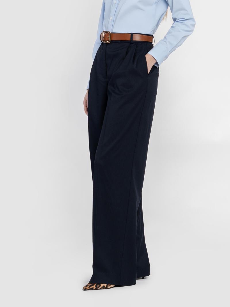 Класичні жіночі брюки Arber у темно-синьому кольорі у смужку, виготовлені з інноваційної тканини з додаванням шовковистої віскози, яка забезпечує комфорт і практичність. Модель з високою посадкою, широким вільним кроєм, подвійними защіпами та двома похилими кишенями для зручності. Ідеально поєднуються з жакетом W02.01.09.511 з тієї ж тканини, створюючи стильний вибір для офісу чи повсякденного гардероба. Модель на фото у розмірі 42. Зріст: 175 см. Параметри: 84/61/91