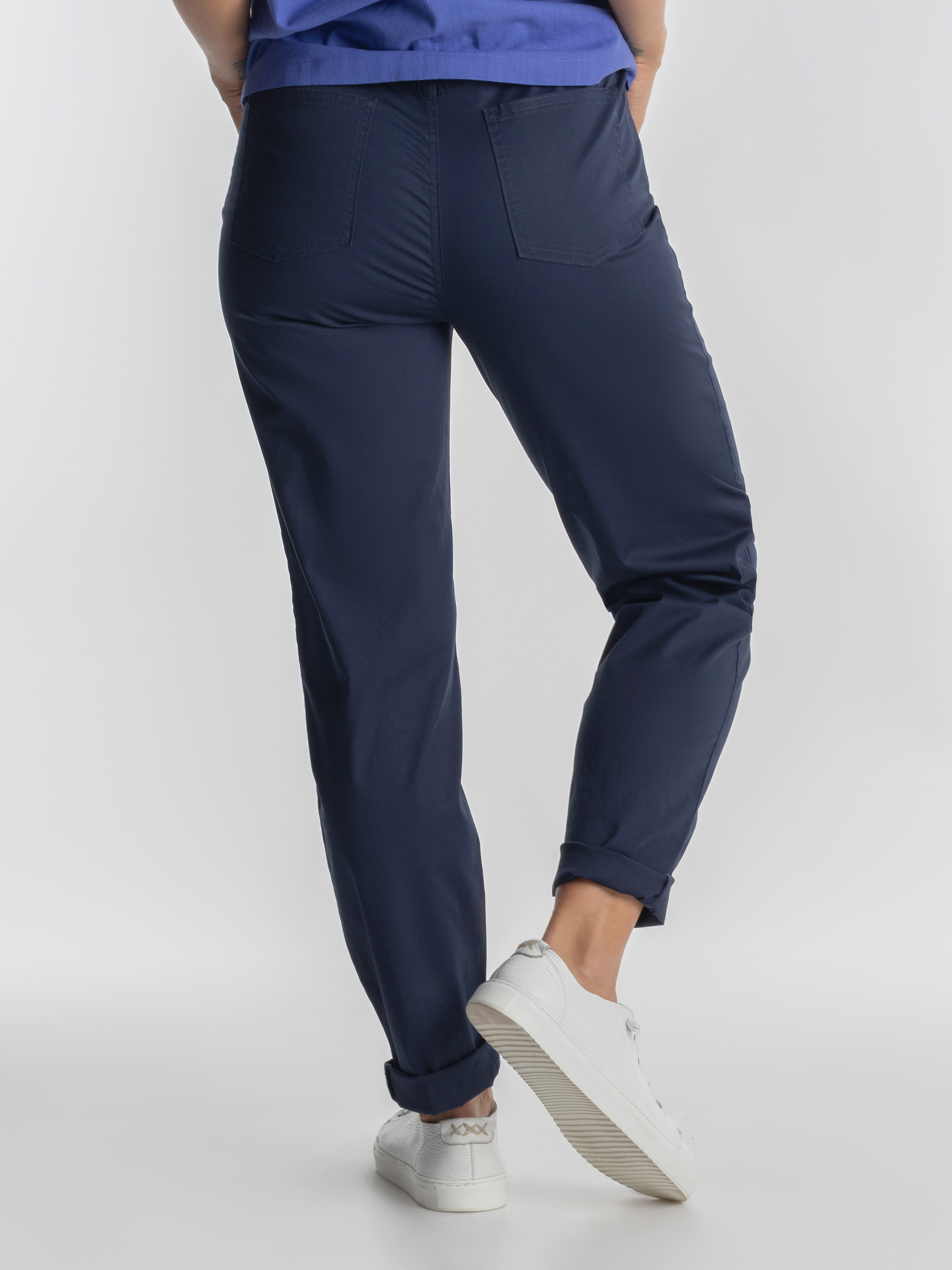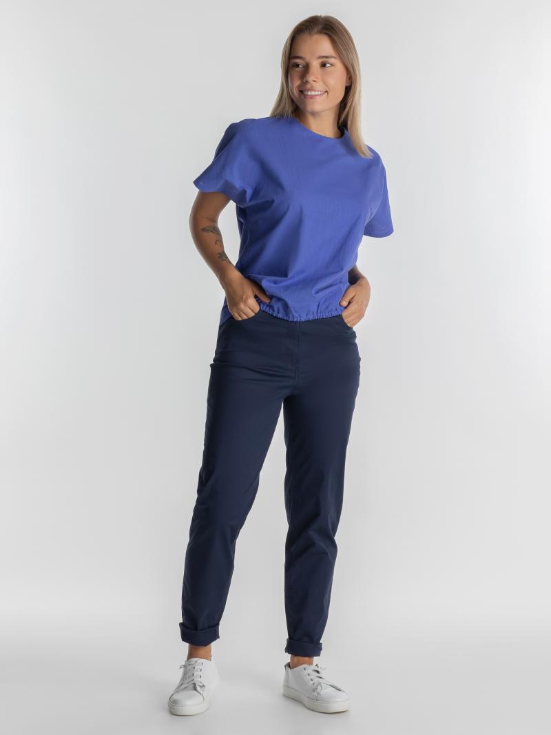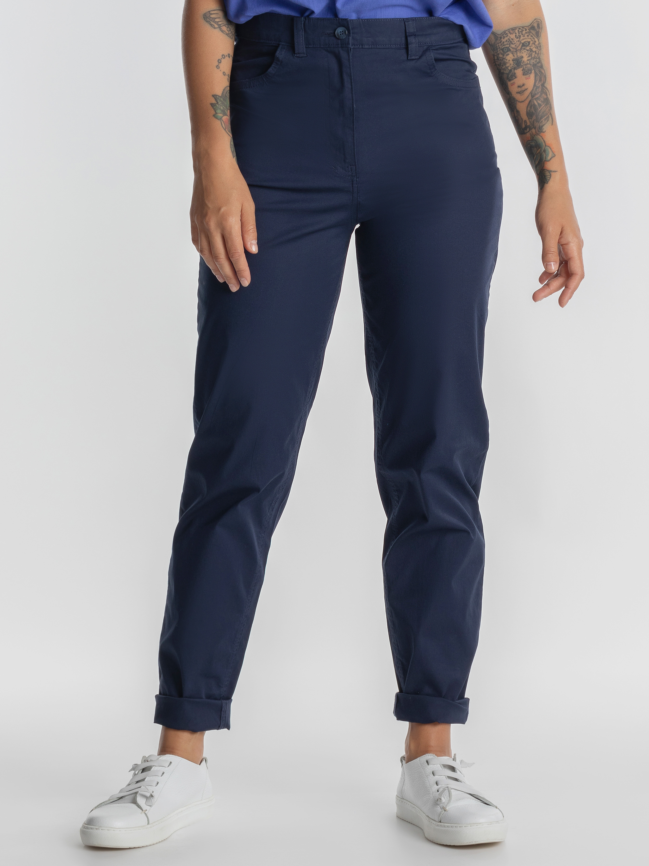 Сині брюки MOM Arber з бавовняної тканини. Модель джинсова, з п'ятьма кишенями, завужена до низу, комфорт забезпечує добавка эластана. Застібка на блискавку і гудзик. Виріб прекрасно доповнить повсякденний гардероб у поєднанні з блейзером, трикотажем або сорочками casual.