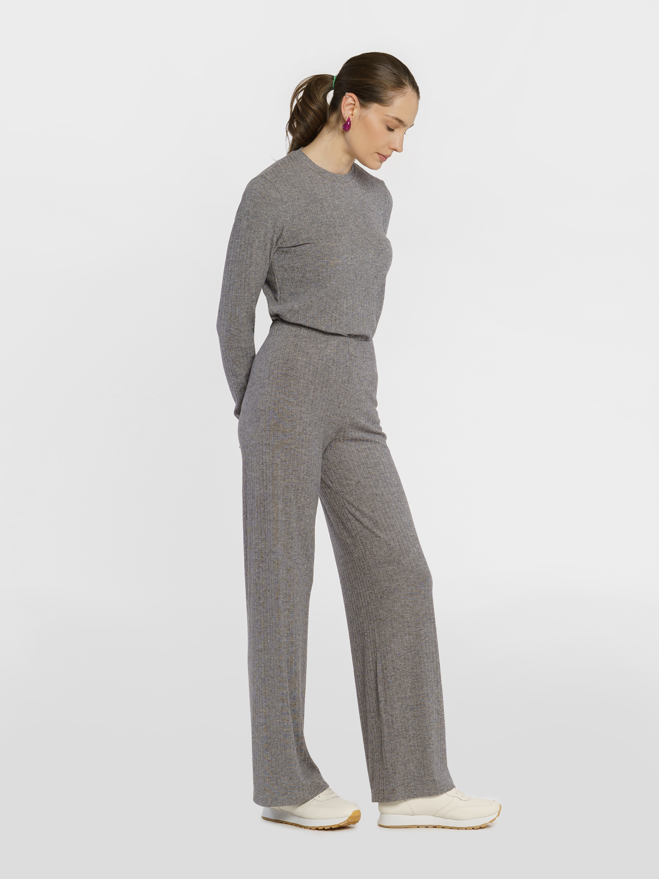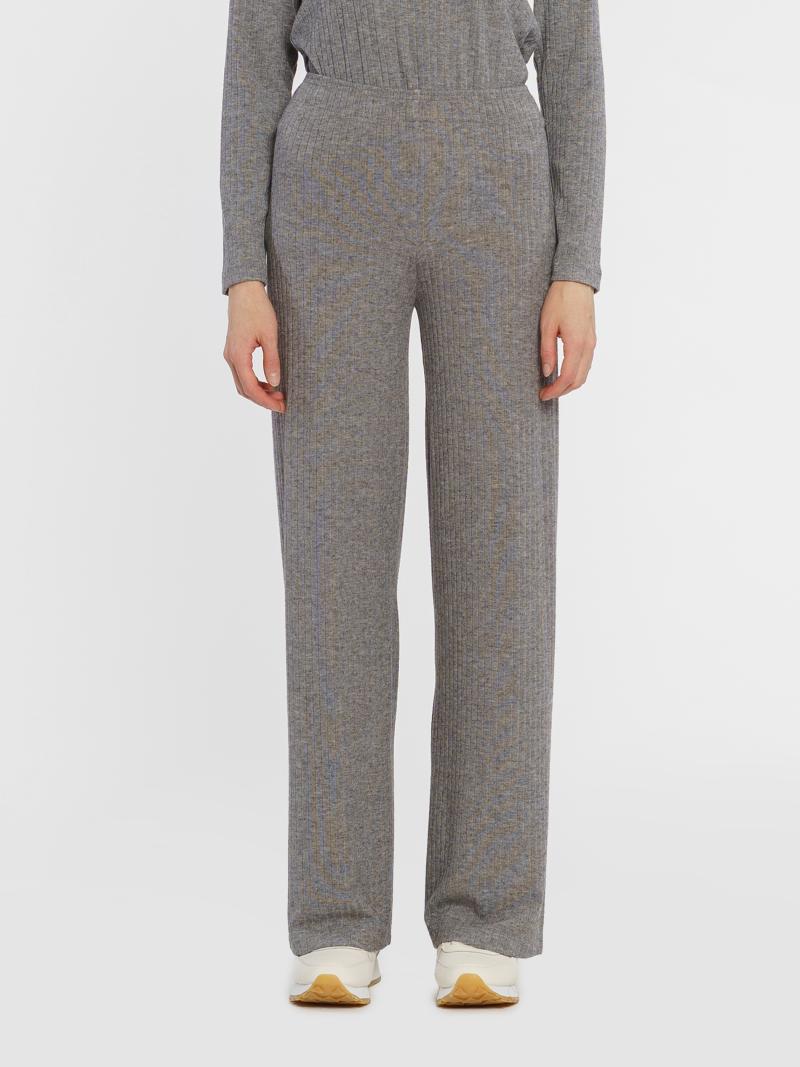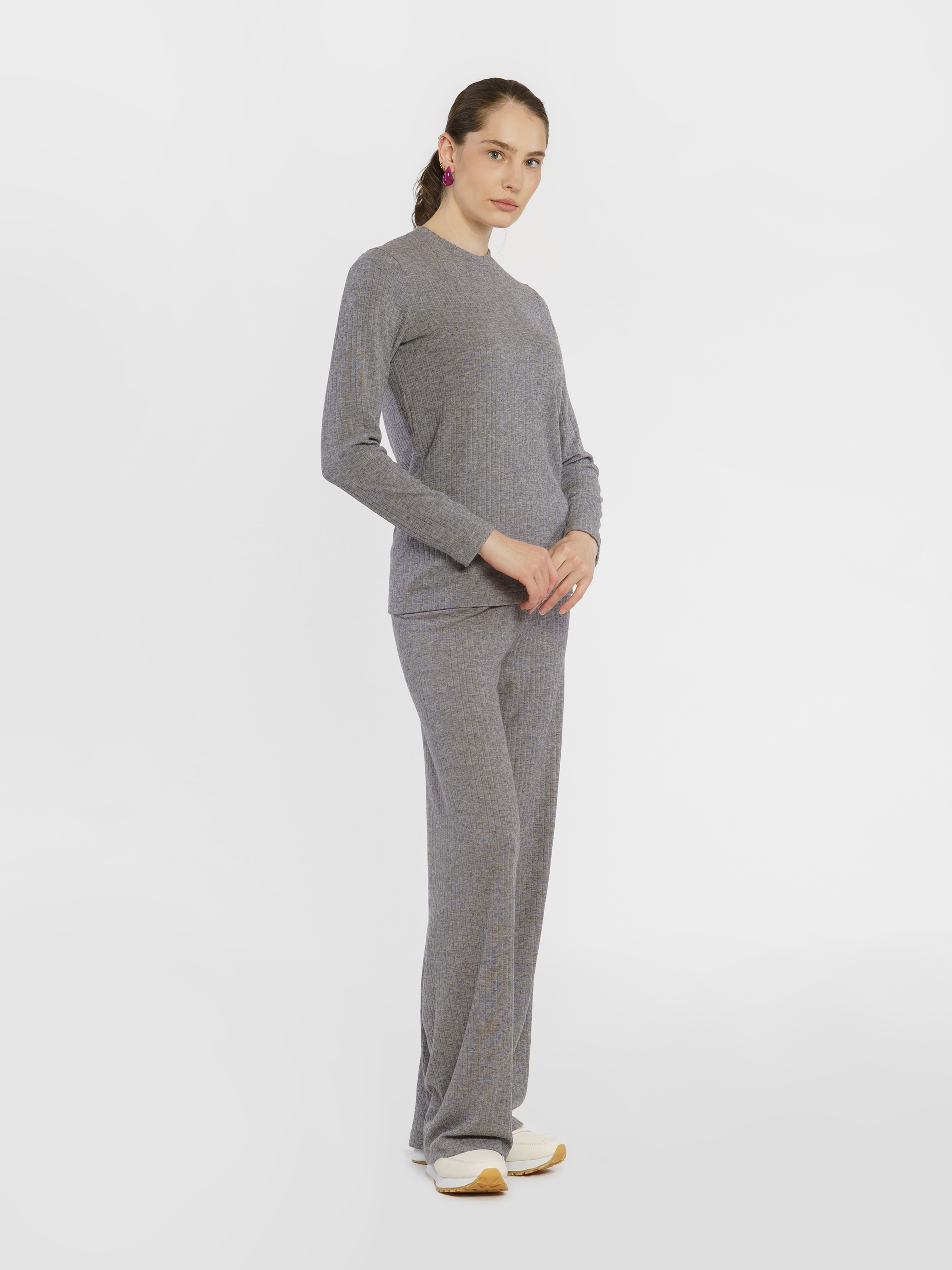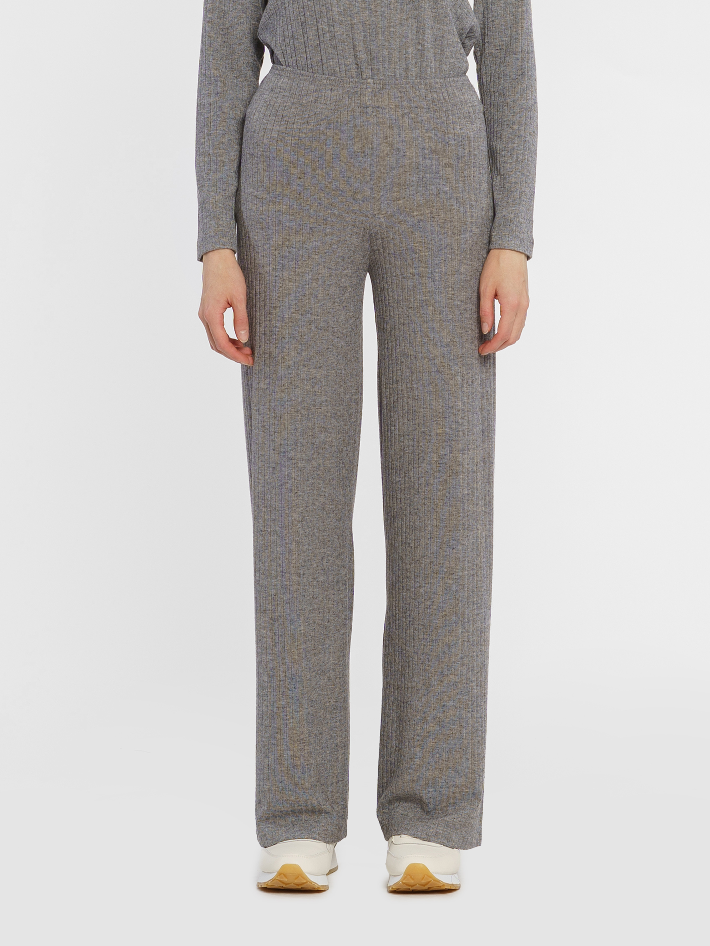 Жіночі сірі трикотажні брюки Arber з еластичної шовковистої віскози. Мають високу посадку, розширений донизу крій, дві кишені та пояс на гумці. Ідеально доповнить трикотажний лонгслів W17.01.11.43. Модель на фото у розмірі 42. Зріст: 173 см. Параметри: 86/63/90