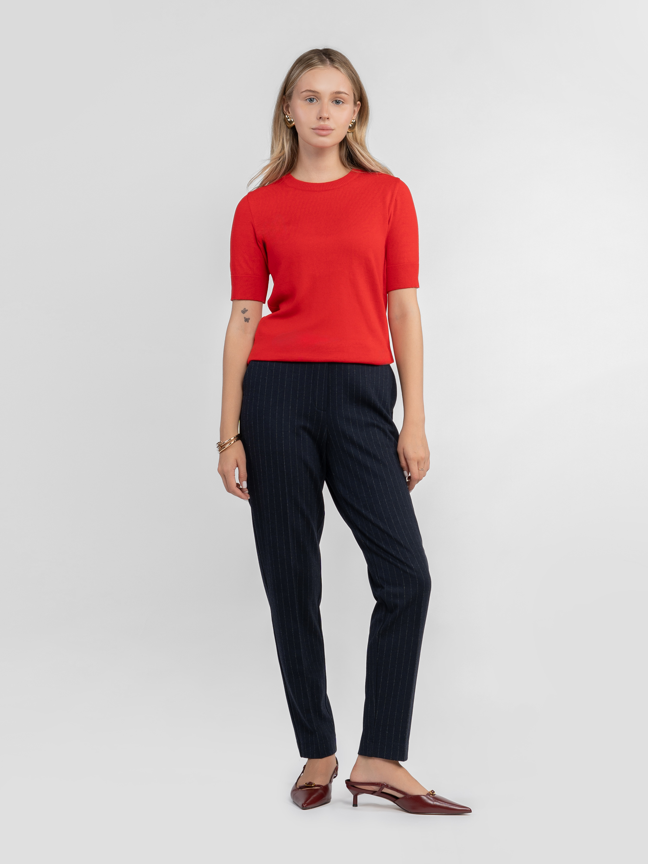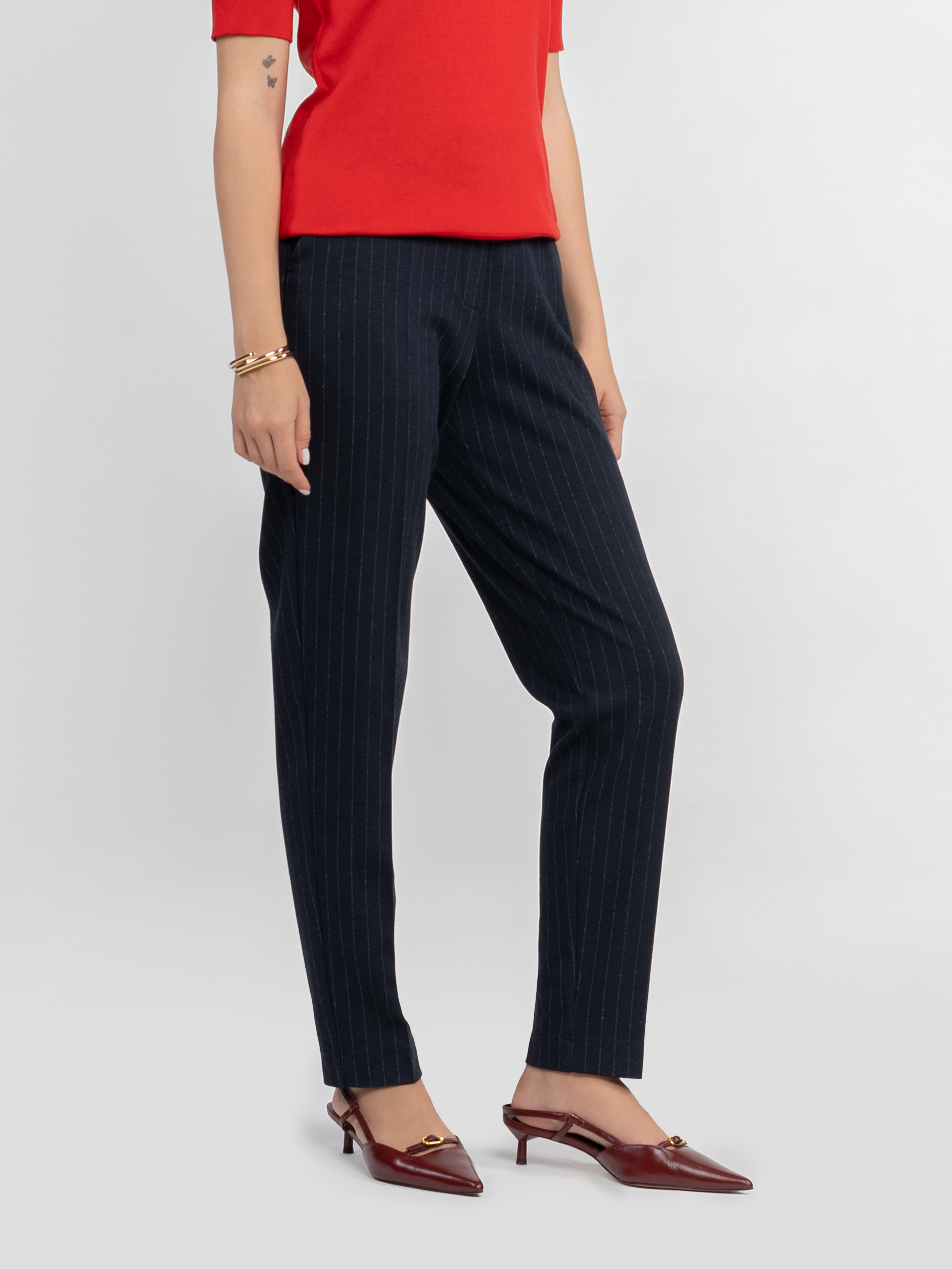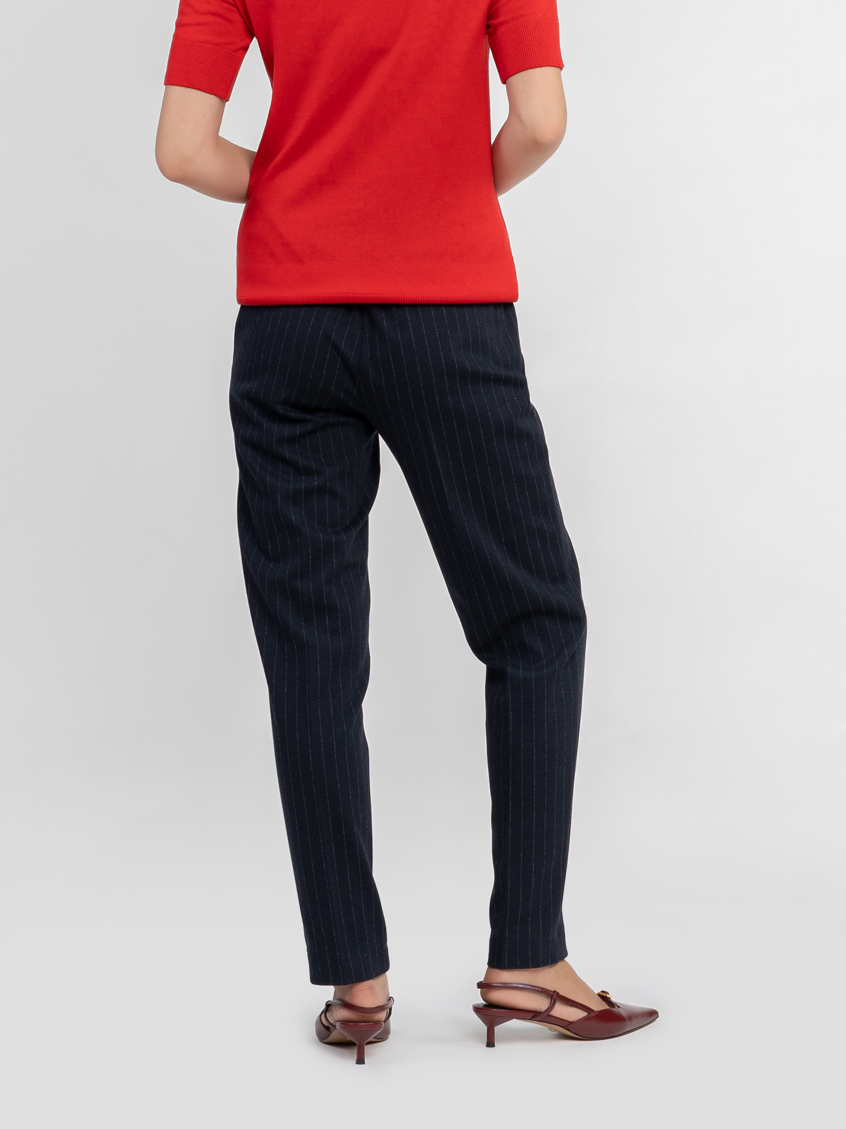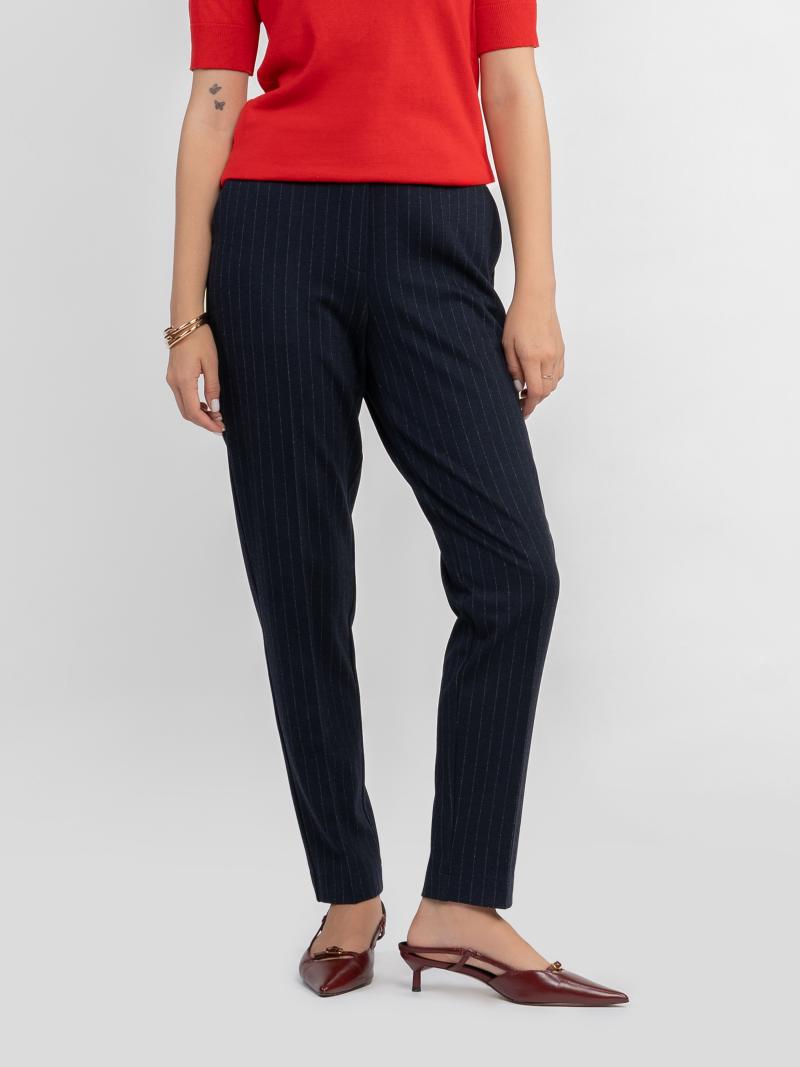 Жіночі брюки Arber темно-синього кольору в тонку смужку, виконані з м’якої еластичної тканини з додаванням віскози. Матеріал приємний на дотик, добре тягнеться, тримає форму та ідеально сідає по фігурі. Висока посадка, завужений крій, пояс на резинці та дві похилі бокові кишені забезпечують комфорт протягом дня. Ідеально поєднуються з жакетом W02.04.09.532 з тієї ж тканини. Модель на фото у розмірі 42. Зріст: 168 см. Параметри: 80/62/87