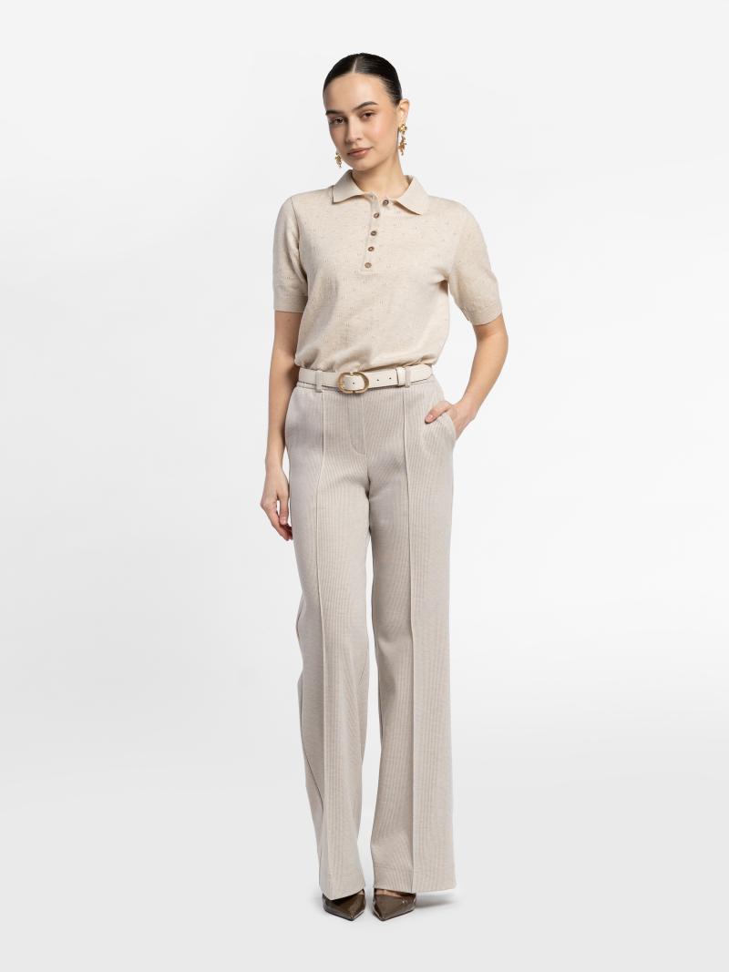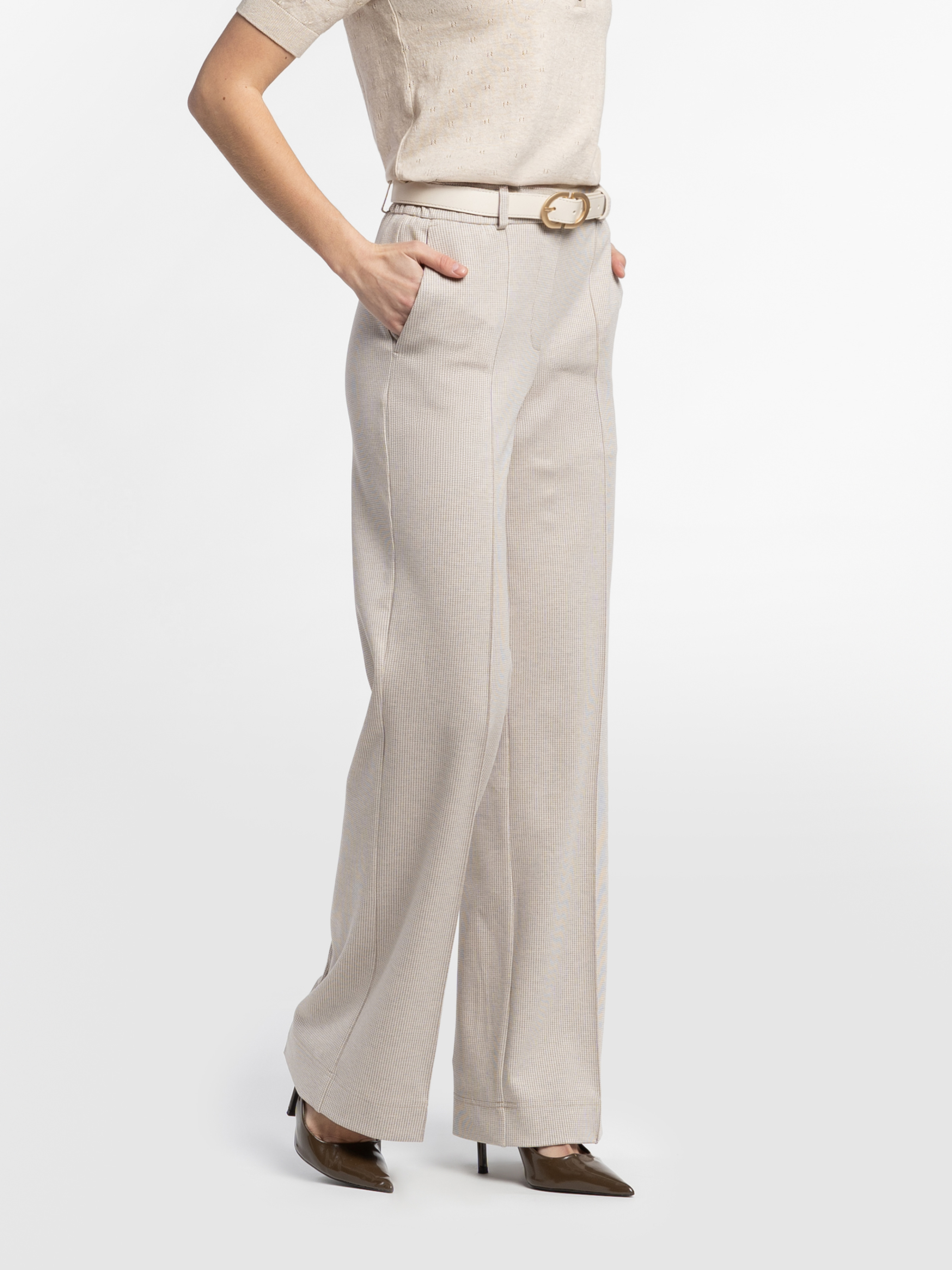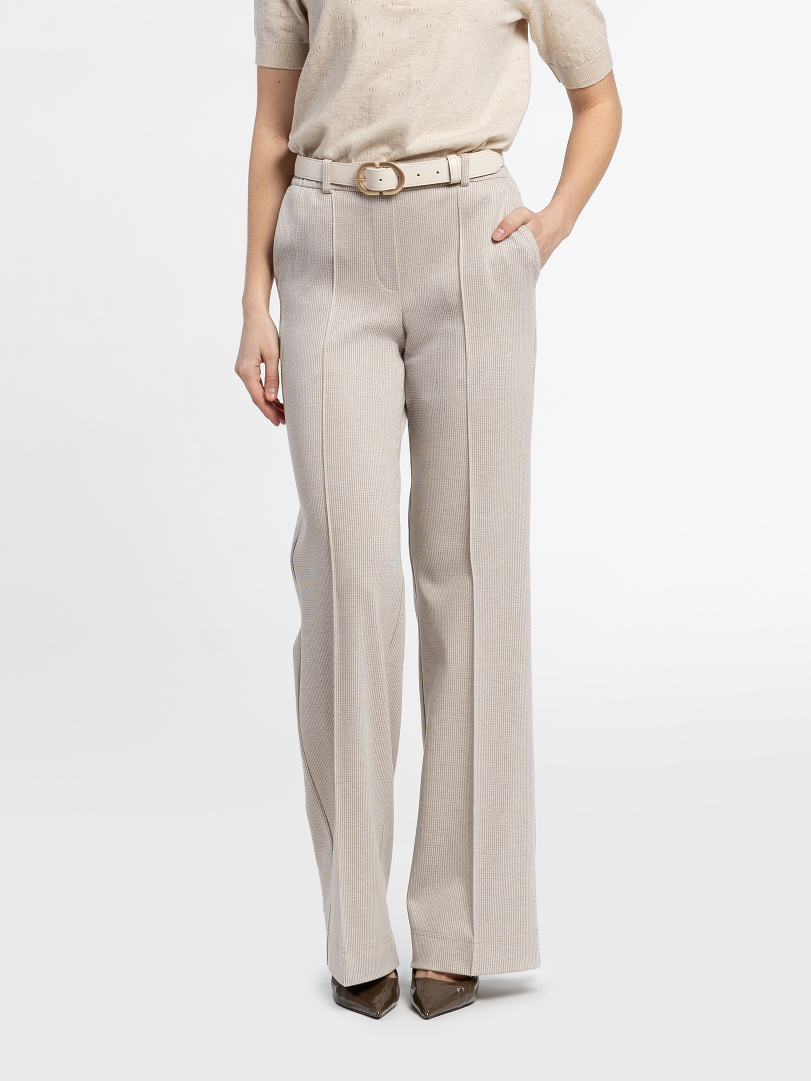Arber women's beige knitted trousers made from soft, stretchy fabric with added viscose. The material is pleasant to the touch, stretches well and fits comfortably without restricting movement. Mid-rise, straight cut, with an elasticated waistband and two slanted pockets. The model in the photo is wearing size 42. Height: 175 cm. Measurements: 84/61/91