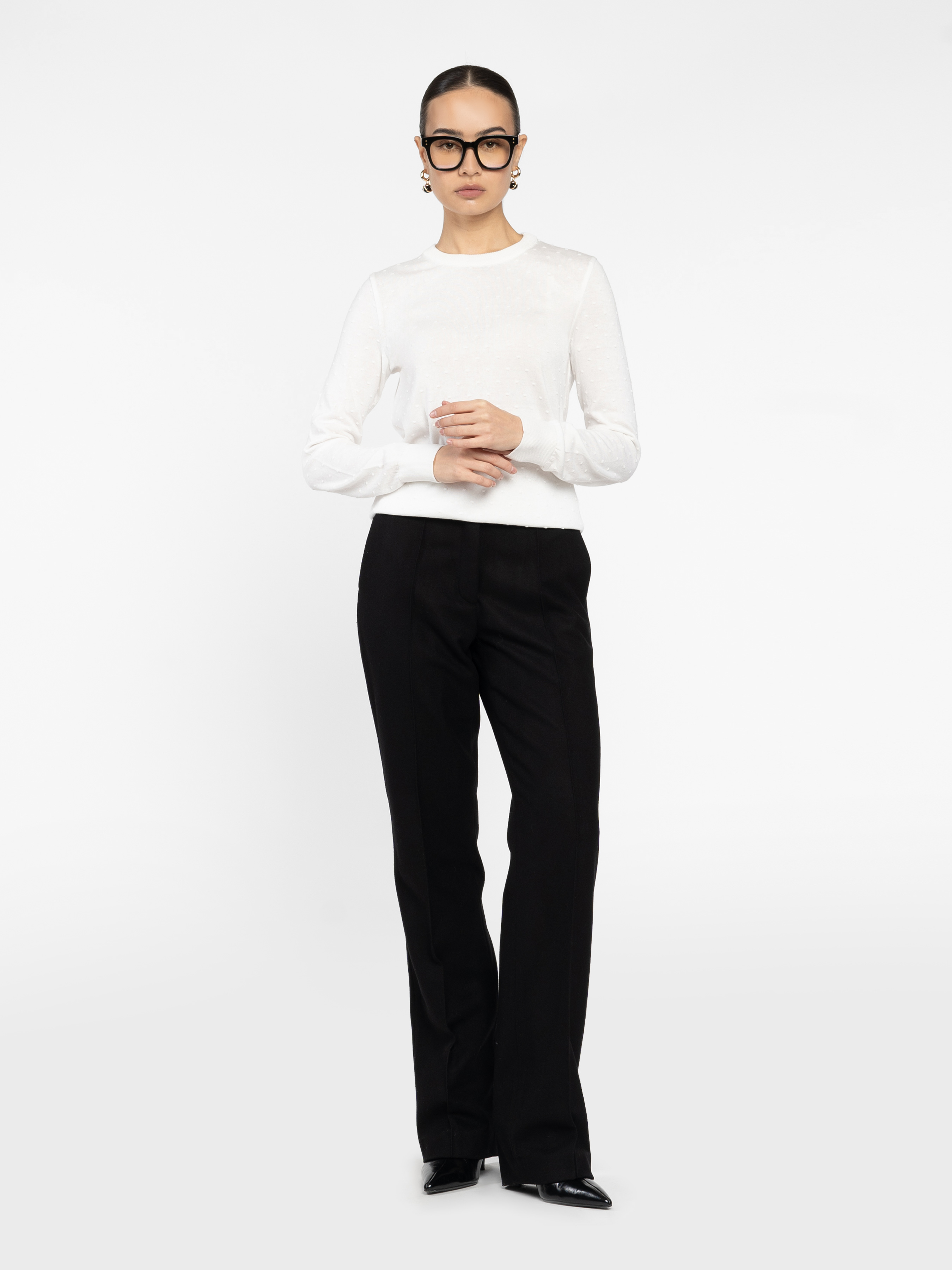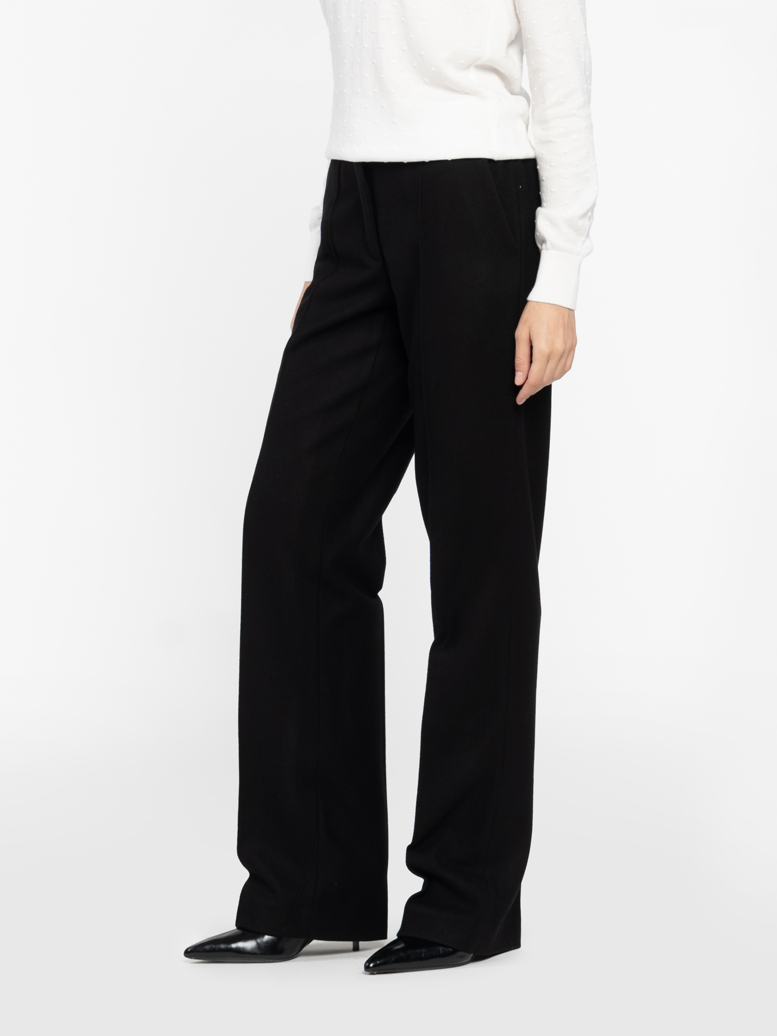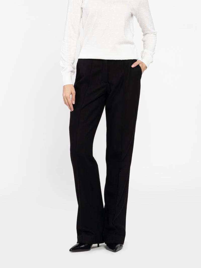 Arber women's black trousers are made of soft wool fabric with additives. The material is warm, pleasant to the touch, keeps its shape well and provides comfort throughout the day. The straight cut with darts visually lengthens the silhouette, while the high waist delicately emphasises the waist. They go perfectly with jackets, shirts or knitwear — a versatile option for smart casual looks. The model in the photo is wearing size 44. Height: 168 cm. Measurements: 79/60/88