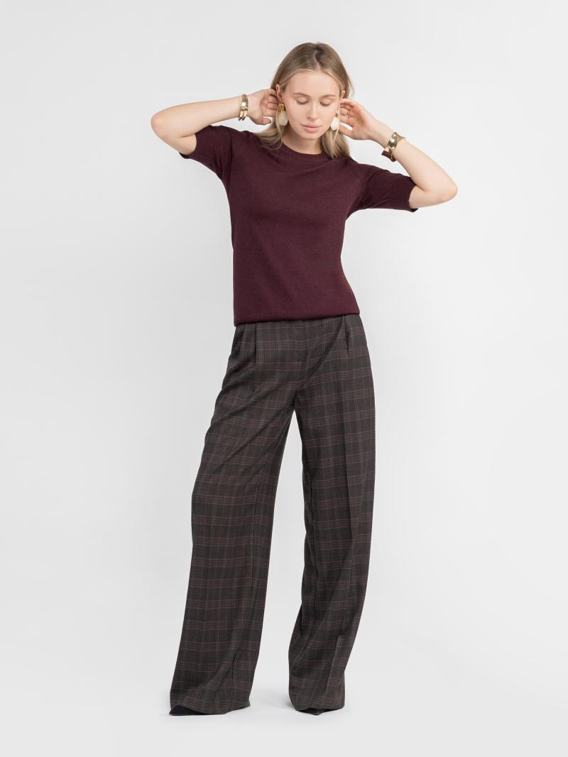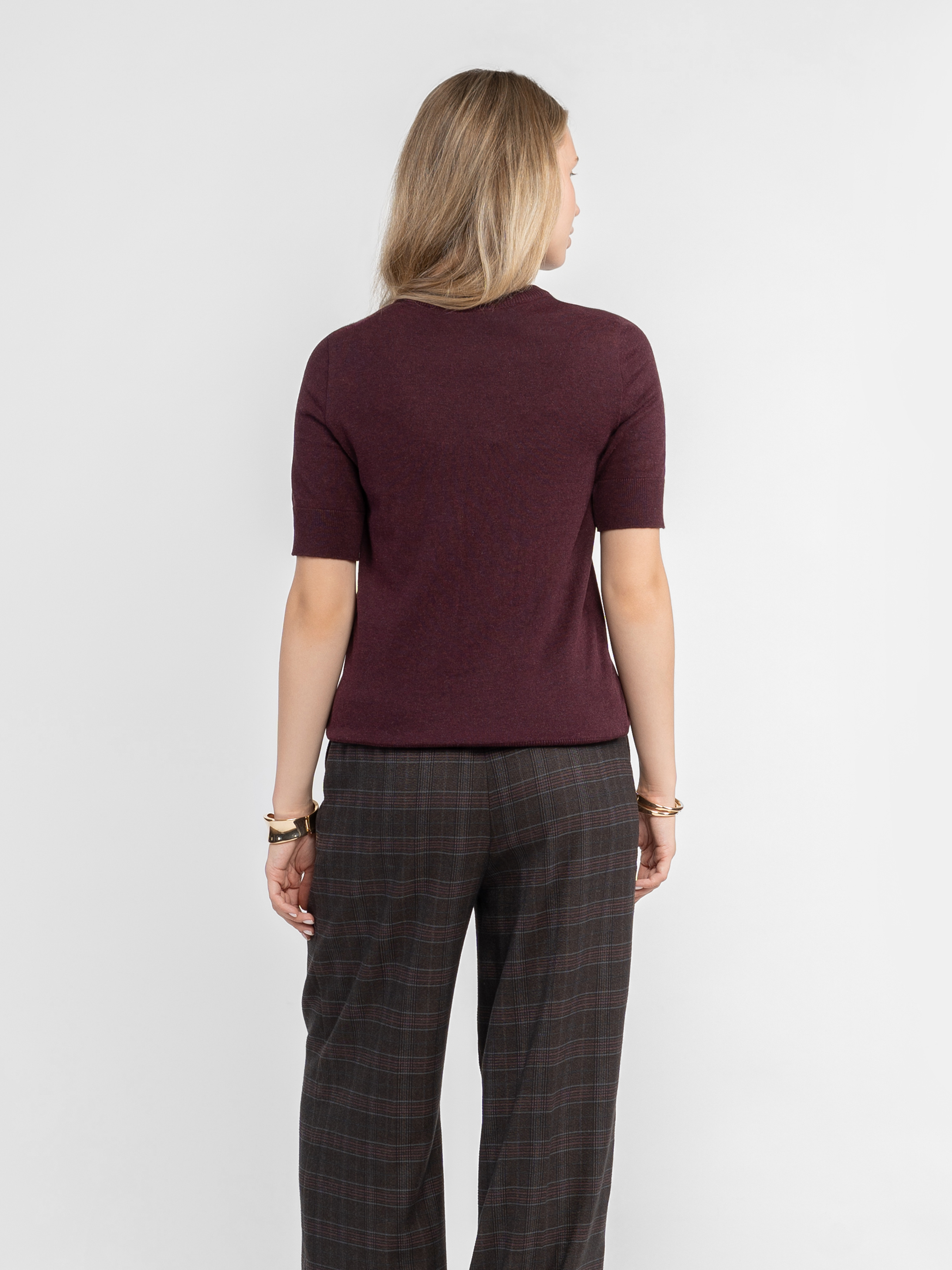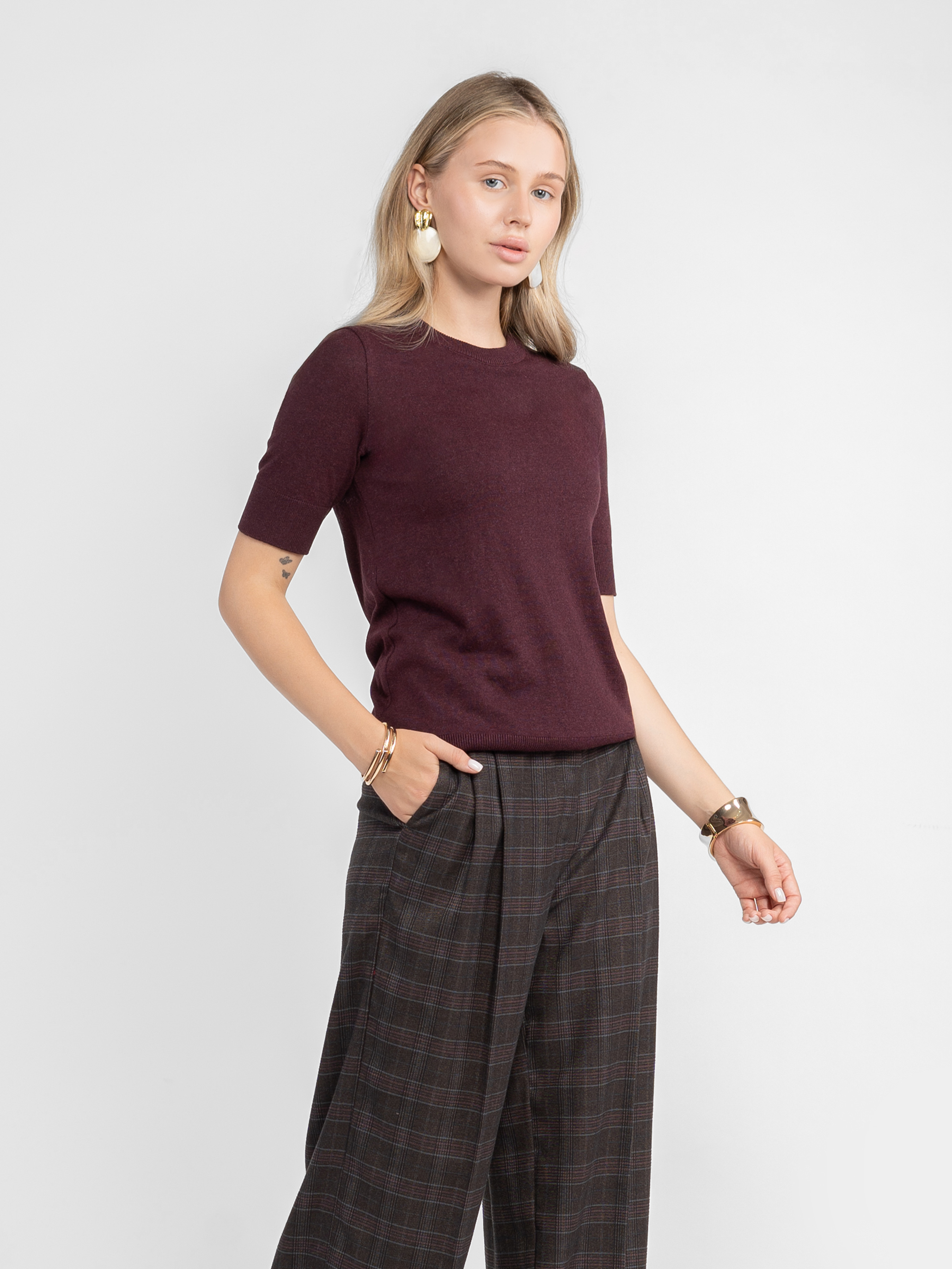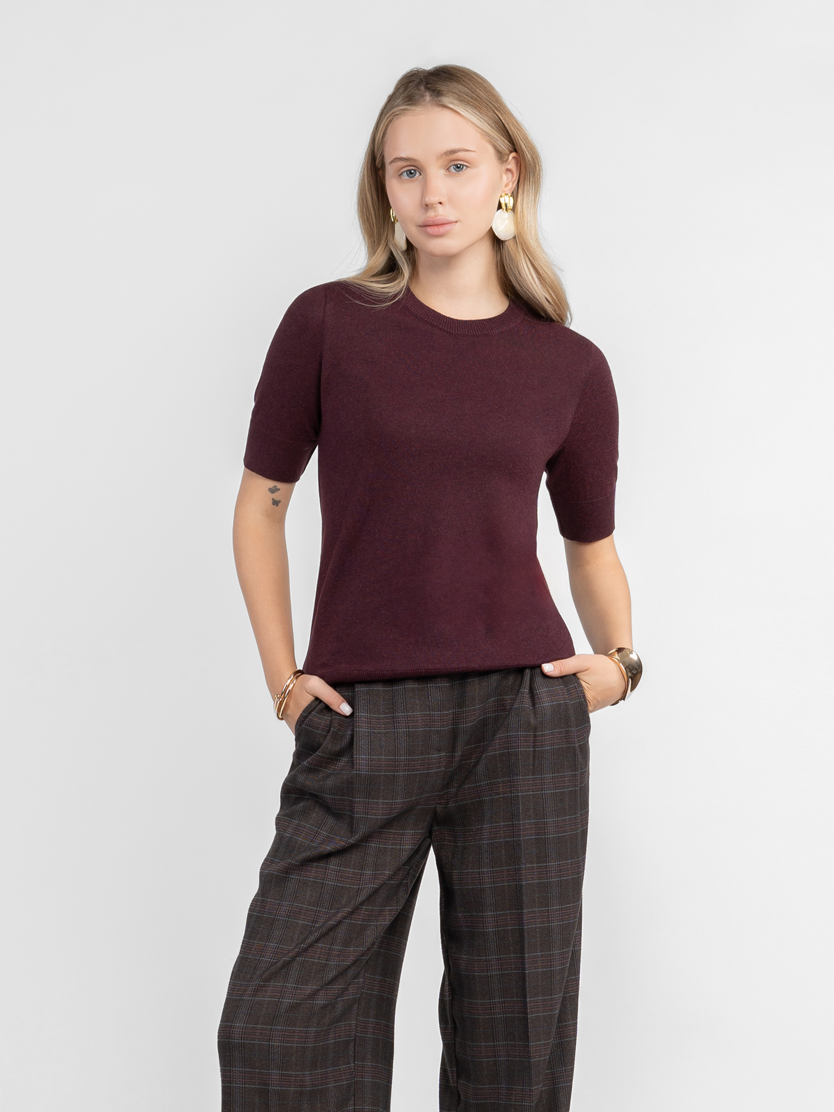 Жіночий джемпер Arber кольору бордо, пов’язаний із тонкої пряжі на основі високоякісної бавовни з добавками. М’яка та приємна до тіла тканина забезпечує комфорт протягом усього дня, а елегантний короткий рукав робить модель ідеальною для стильних повсякденних або офісних образів. Модель на фото у розмірі 42. Зріст: 168 см. Параметри: 80/62/87
