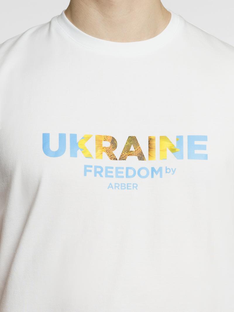 Футболка білого кольору з лімітованої колекції одягу Freedom by Arber. Створена з тонкого бавовняного трикотажу з доданням еластану, м'яка тканина приємна до тіла, добре пропускає повітря та вбирає вологу. Футболка стилізована авторськими принтами Freedom, які створені для справжніх шанувальників свободної, незалежної України.