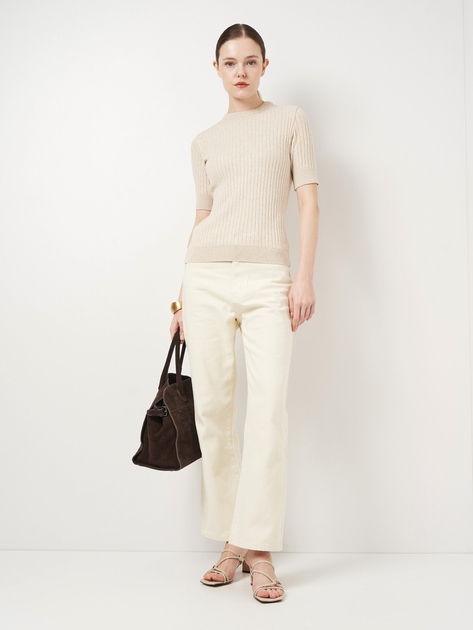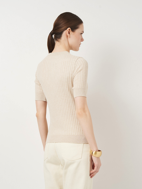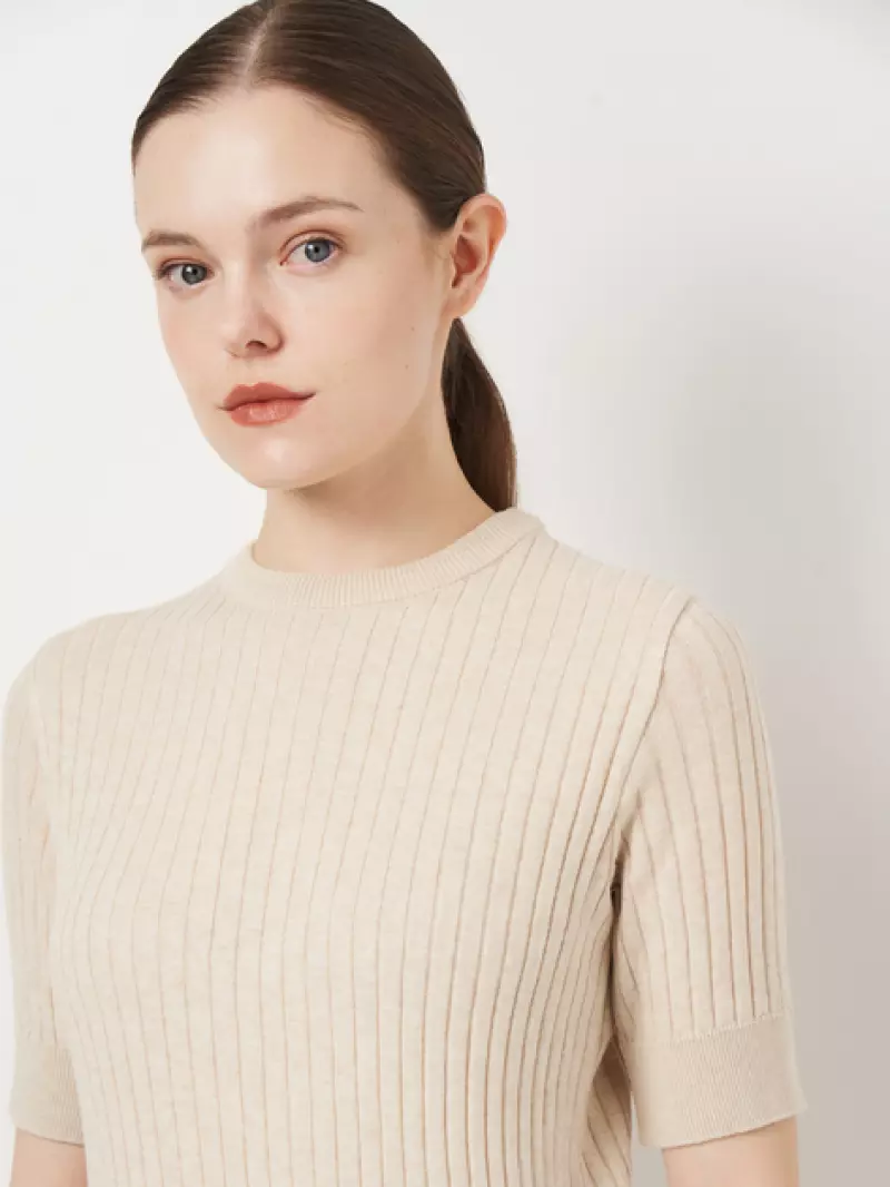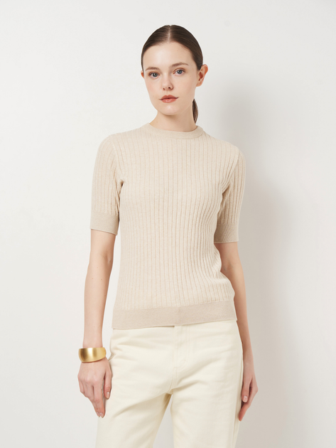 Жіноча футболка бежевого кольору, пов’язана з м’якого 100% бавовняного трикотажу з рельєфною фактурою у вигляді смужок. Рукав до плеча красиво підкреслює силует, а еластична структура тканини забезпечує комфортну посадку по фігурі без обмеження рухів. Мінімалістичний дизайн і нейтральний колір роблять цю модель універсальним базовим елементом гардероба для повсякденних образів.