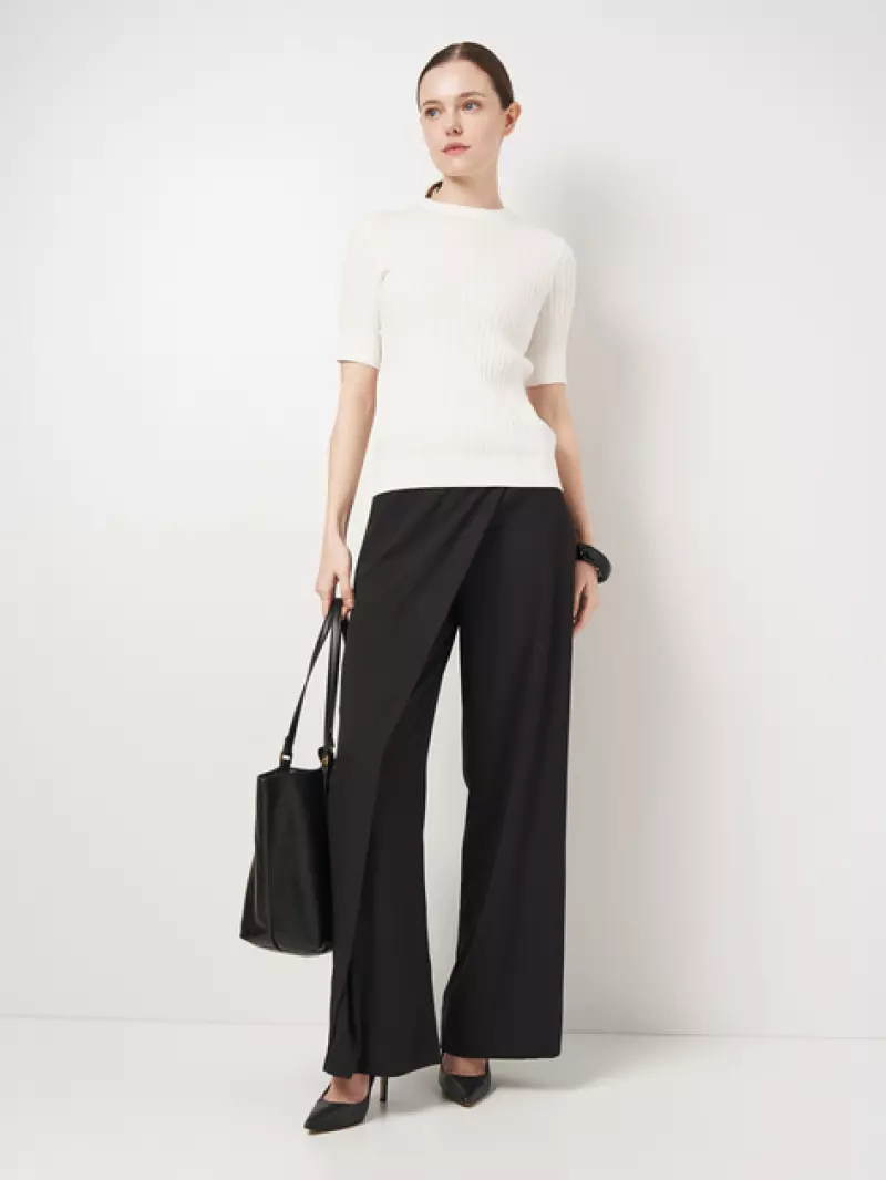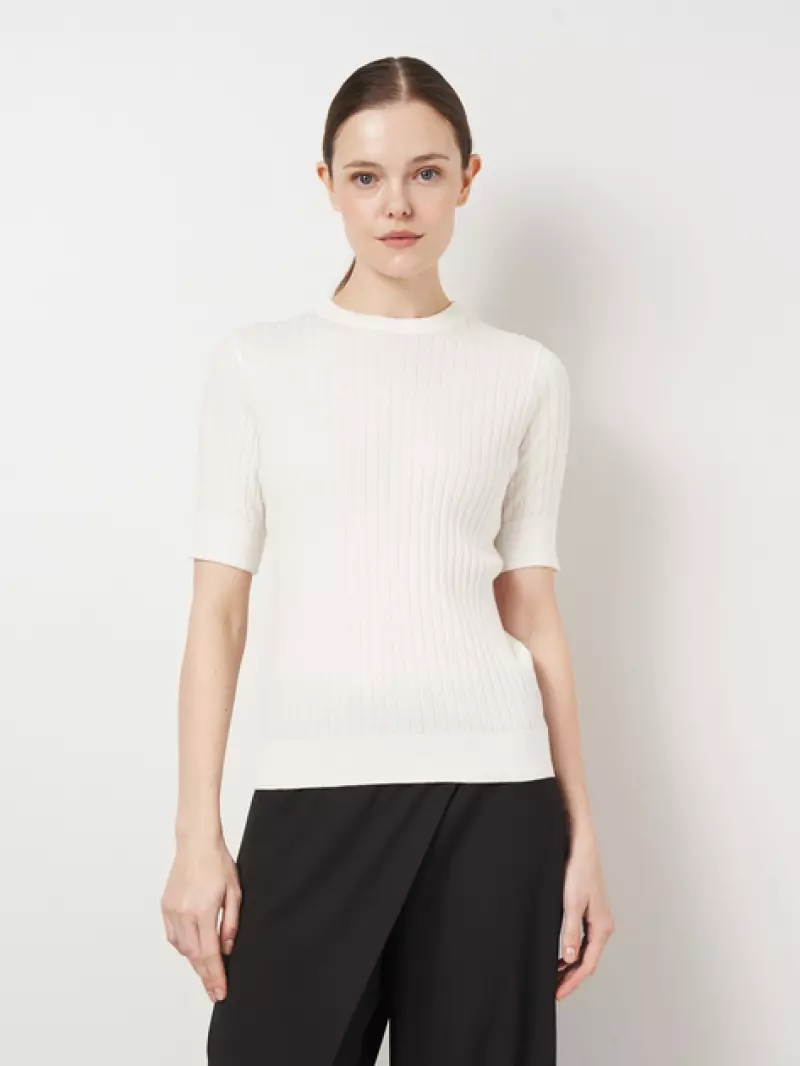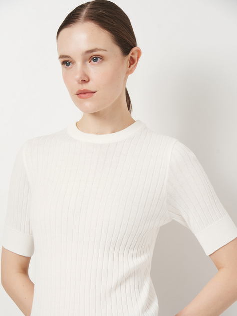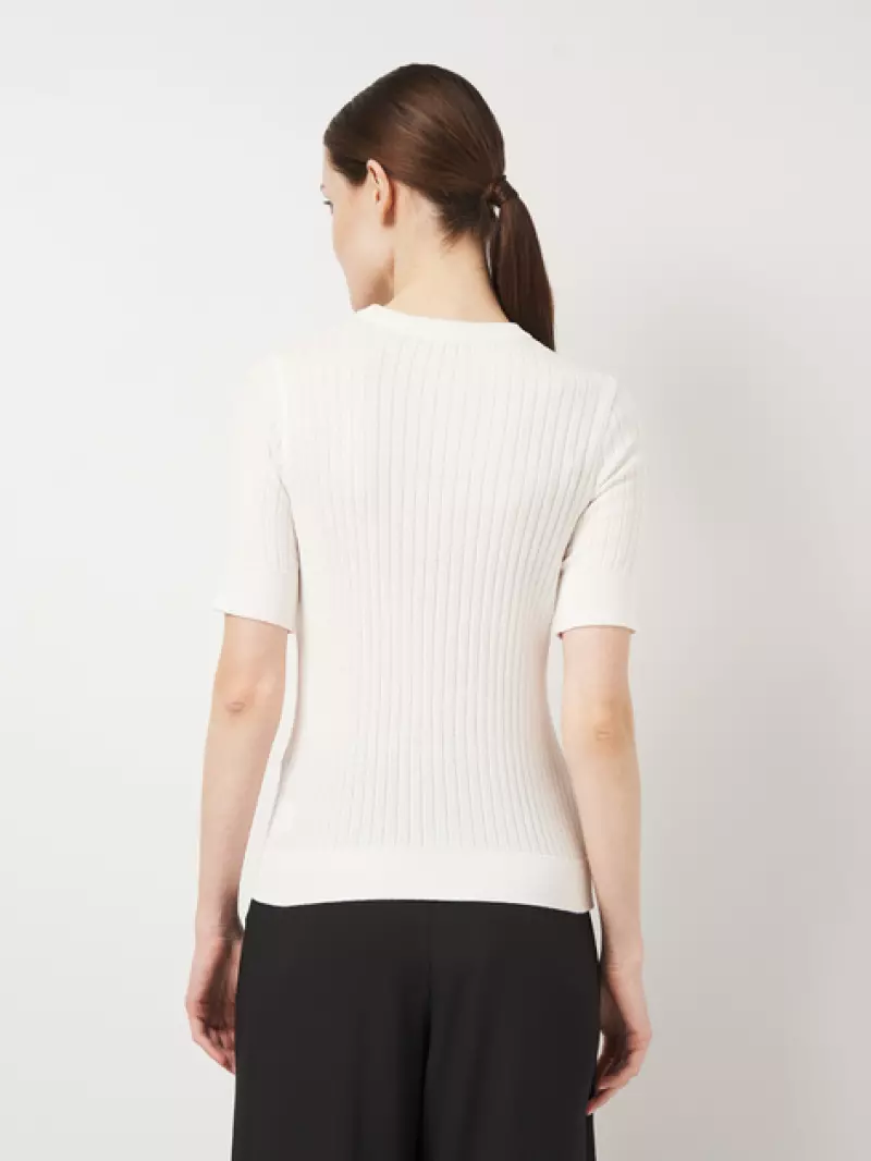 Жіноча футболка білого кольору, пов’язана з м’якого 100% бавовняного трикотажу з рельєфною фактурою у вигляді смужок. Рукав до плеча красиво підкреслює силует, а еластична структура тканини забезпечує комфортну посадку по фігурі без обмеження рухів. Мінімалістичний дизайн і нейтральний колір роблять цю модель універсальним базовим елементом гардероба для повсякденних образів.