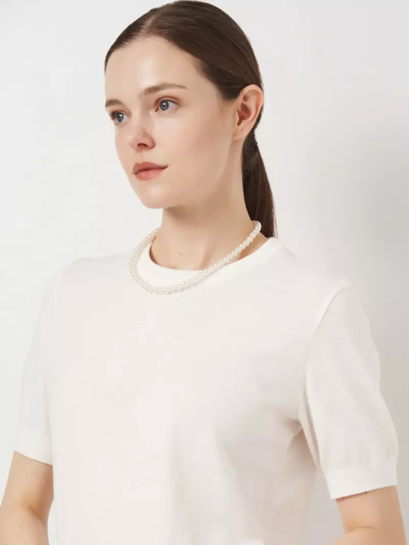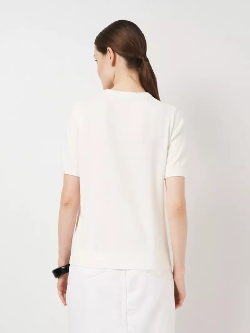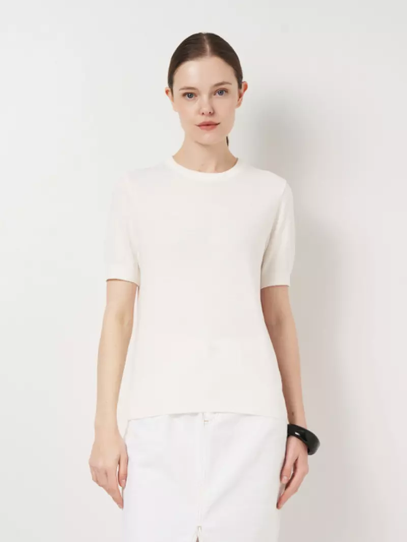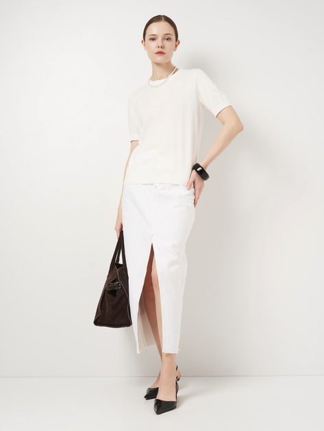 Жіноча футболка білого кольору, пов’язана з тонкого трикотажу на основі натуральної бавовни. Надзвичайно м’яка і легка, створена для комфорту в спеку. Ідеально сідає по фігурі, підкреслює жіночність, не сковуючи рухів. Мінімалістичний дизайн і нейтральний колір роблять цю модель універсальним базовим елементом гардероба — ідеально поєднується з будь-яким низом для повсякденних образів.