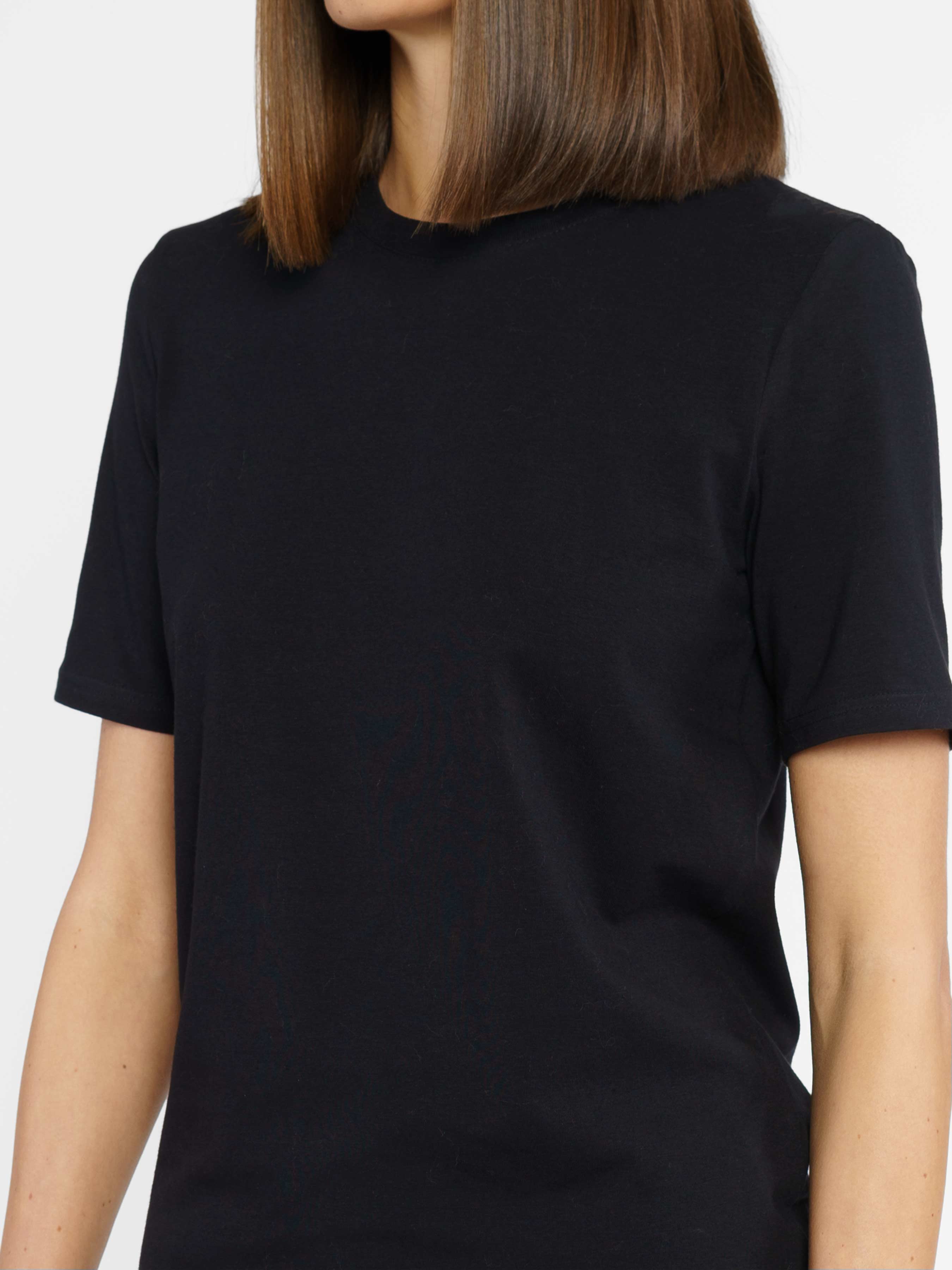 Black women's Arber T-shirt, straight silhouette. Made of thin cotton jersey with added elastane, which provides maximum comfort and excellent fit. Basic T-shirt is indispensable in a woman's closet in casual style. The model on the photo is in size 42. Height: 178 cm. Parameters: 89/60/90