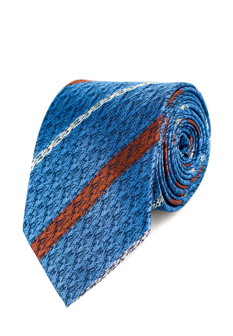 Чоловіча блакитна краватка в тоненьку білу та товсту червону косу смужку.