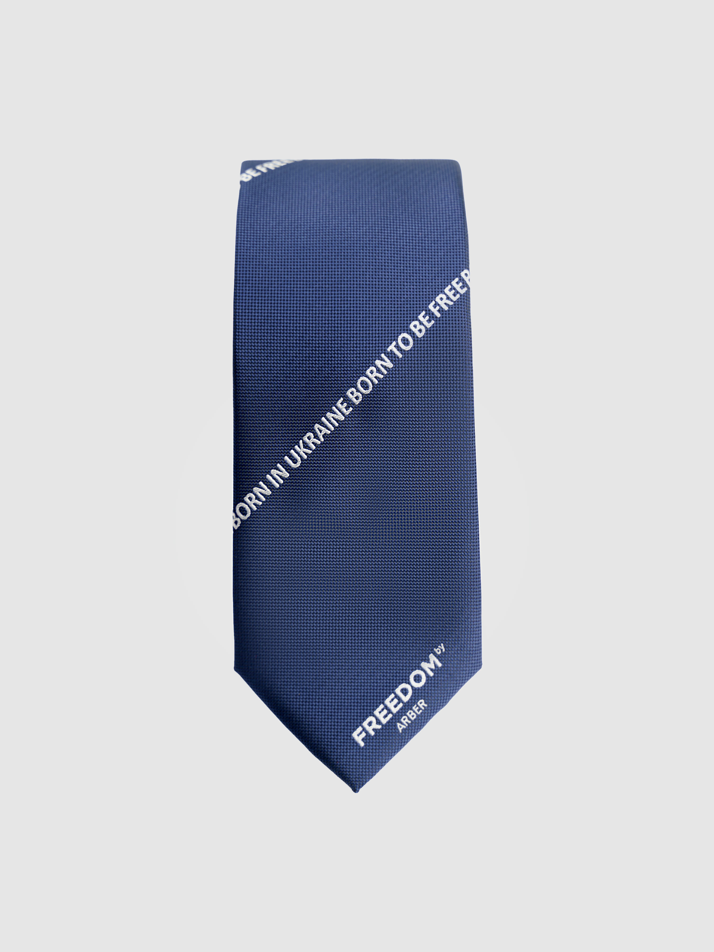 Патріотична краватка Arber темно-синього кольору, виготовлена з шовковистої на дотик тканини та пошита вручну. Декорована принтом "BORN IN UKRAINE BORN TO BE FREE", як символ боротьби за свободу та незалежність України.