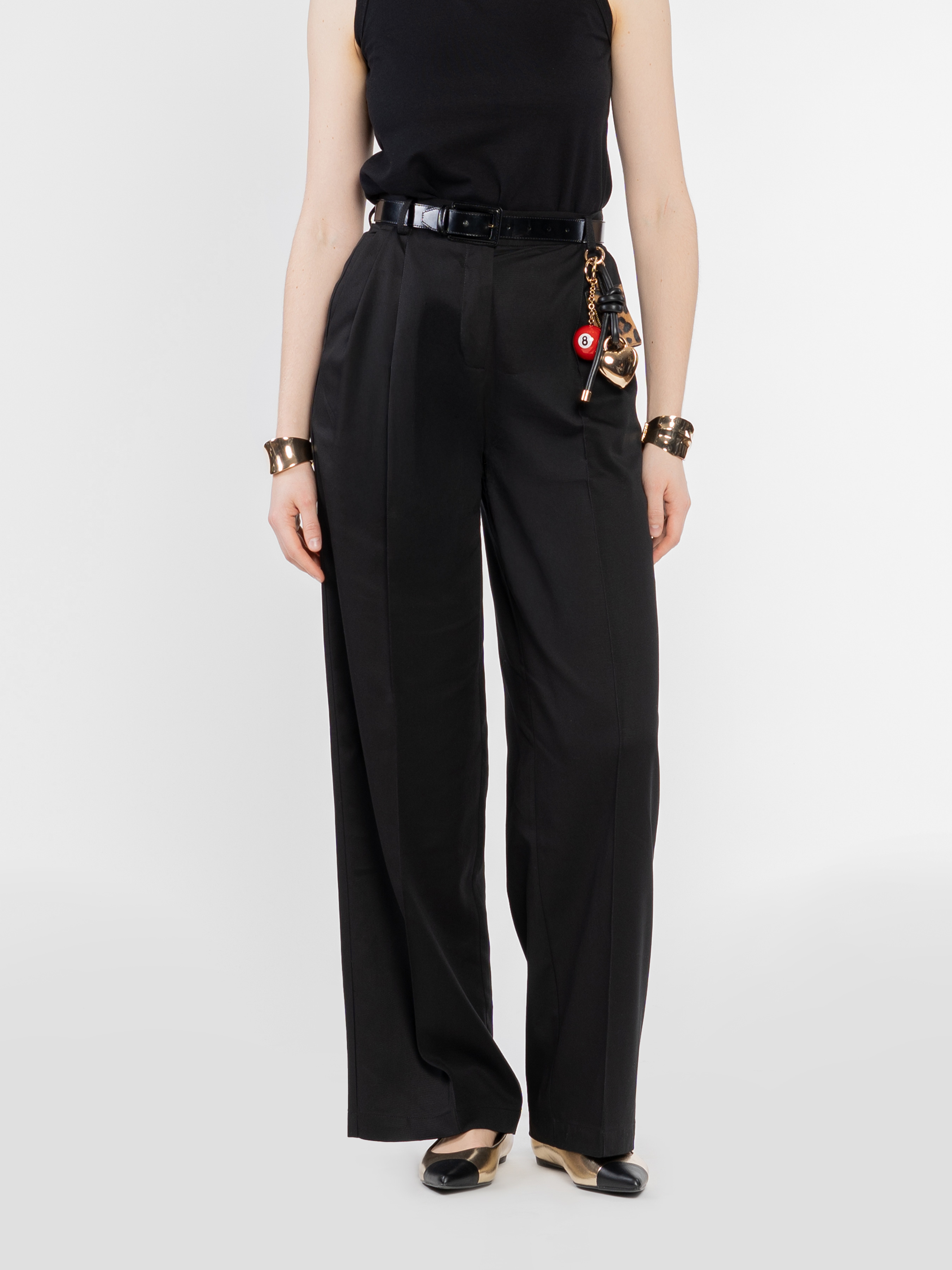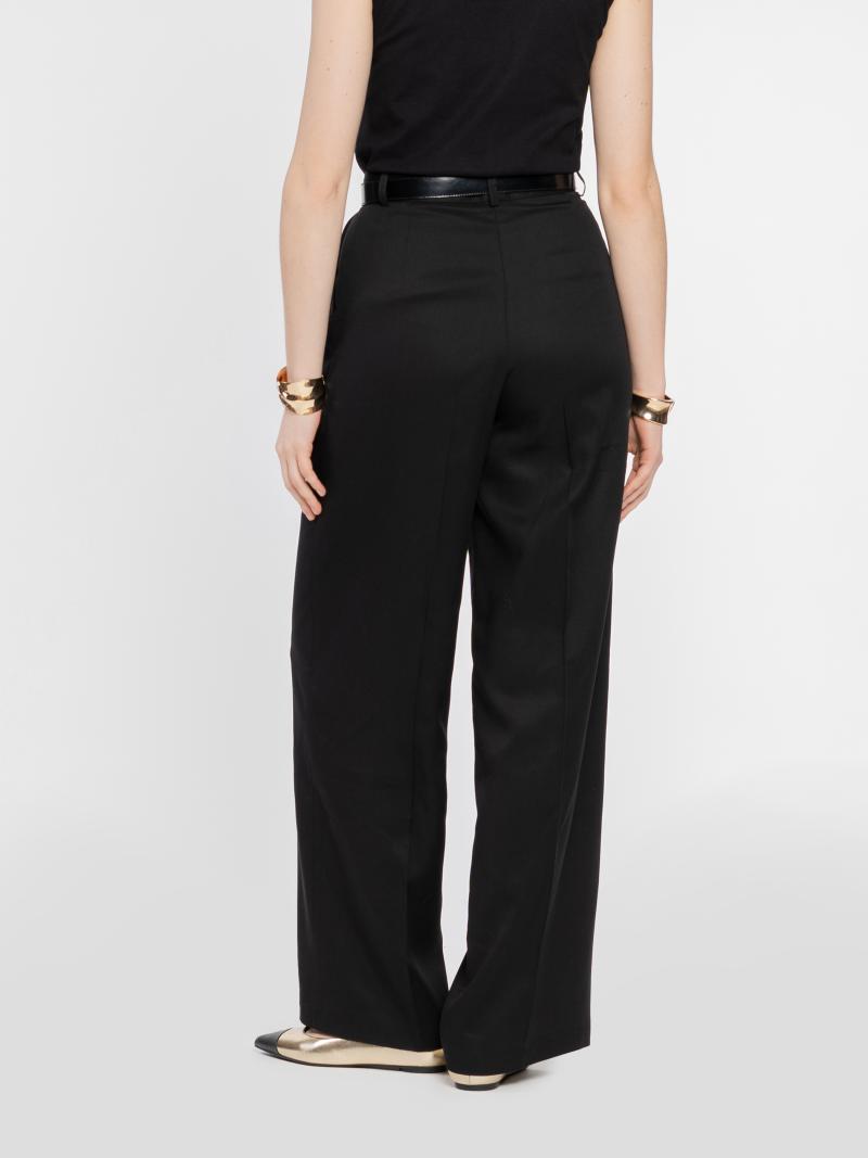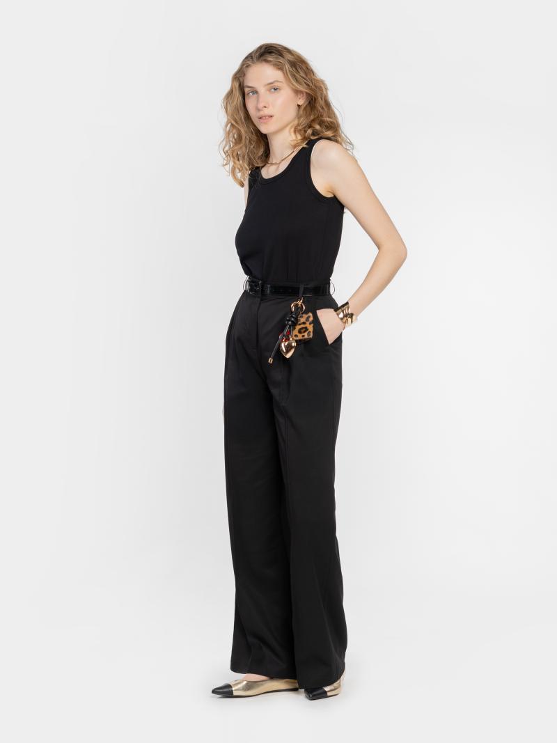 Women's Arber pants in black color, made of lightweight, breathable and ecological viscose. The material provides comfort during the day and pleasant tactile sensations. The model has a high fit, a wide loose fit, double fastenings and two slant pockets create the perfect balance between elegance and practicality. The pants can be easily combined with a vest W20.03.02.522 made of the same fabric or knitwear, forming stylish office and casual looks. The model on the photo is in size 42. Height: 174 cm. Parameters: 83/60/87