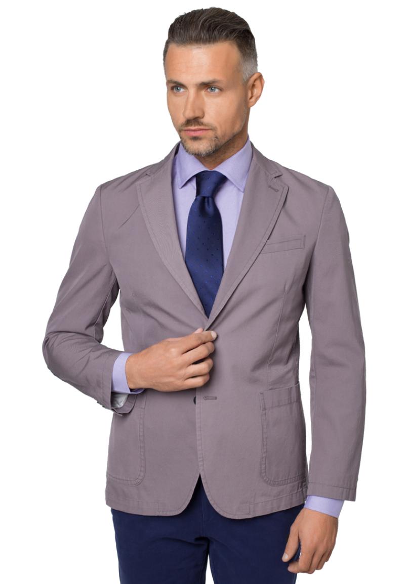 Напівприталений чоловічий піджак сірого кольору з бавовни. Відкладний комір із прямими лацканами, застібка на два гудзика. Комфортний силует, 2 шліца, укорочена підкладка. Рукава двошовні зі шліцами донизу, 3 декоративними петлями та гудзиками, з налокітниками. Вдало поєднується із джинсами, брюками чінос, сорочкою, або трикотажем.