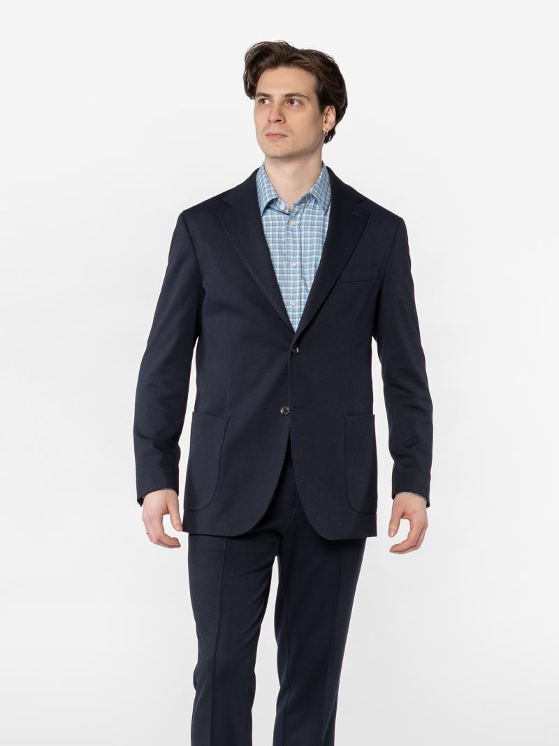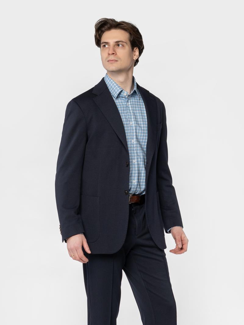 Arber men's blue jacket made from knitted fabric based on silky viscose with added elastane. The material is stretchy, crease-resistant and retains its shape even during an active day. The model has a classic cut, neat lapels and a well-thought-out fit. It has two patch pockets and one breast pocket. Ideal for stylish office looks, meetings with friends or evening outings, it pairs easily with trousers or jeans. The model in the photo is wearing size 48. Height: 185 cm. Measurements: 103/78/100