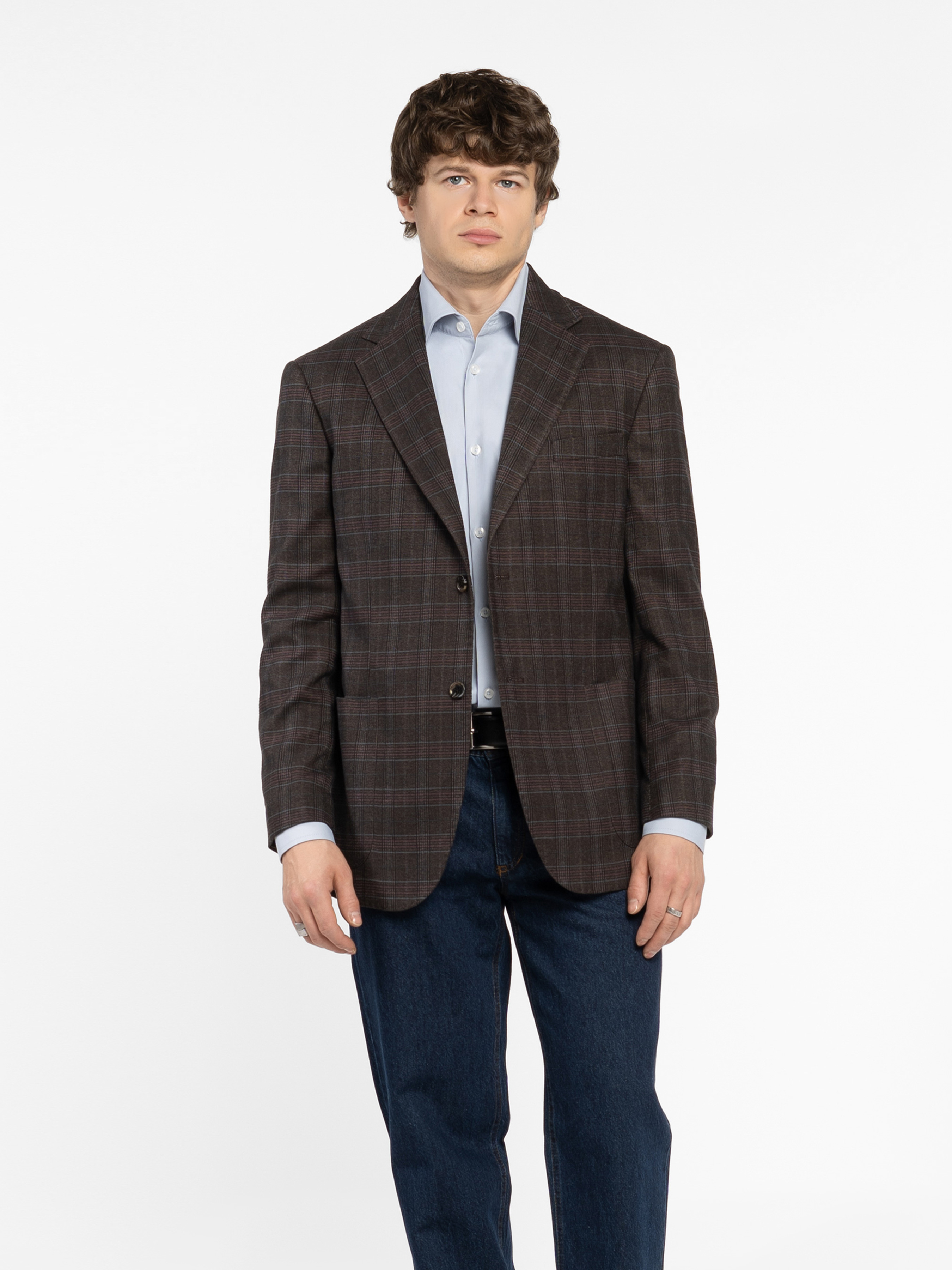Arber brown men's jacket made of soft wool with additives. The fabric retains its shape, moves easily with the body and looks impeccable throughout the day. The model has a 2-button fastening, straight lapels, two patch pockets and two slits. Pairs perfectly with trousers M01.13.38.531 made from the same fabric for a complete modern look. Model in the photo: size 48, height 188 cm, measurements 97/78/96.