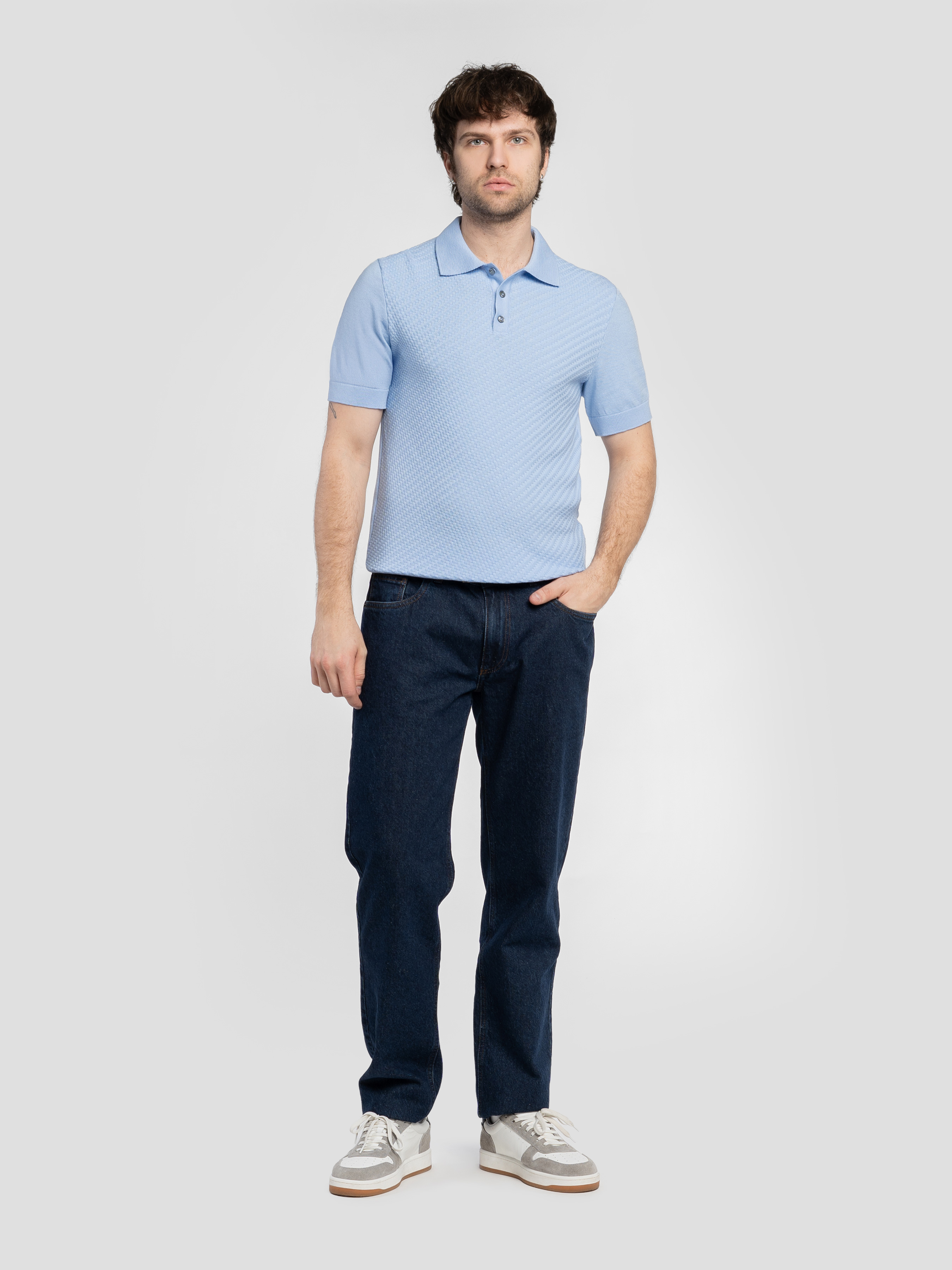 Arber men's polo shirt in blue, made from fine 100% high-quality cotton yarn. The natural fabric feels light and exceptionally soft, pleasant to the touch. Thanks to its fine texture, the polo shirt is highly breathable, ensuring comfort throughout the day. The polo shirt with a 3-button fastening will harmoniously complement your wardrobe when paired with trousers or jeans. The model in the photo is wearing size 48. Height: 183 cm. Measurements: 94/90/100