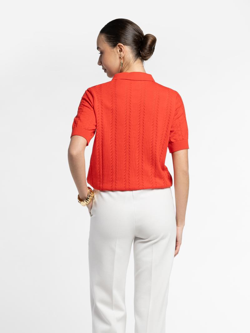Arber women's polo shirt in red, knitted from fine 100% high-quality cotton yarn. The lightweight knit made from natural fibres is pleasant to the touch and ensures comfort throughout the day. Thanks to its fine texture, the model is breathable and gives a feeling of freshness. The zip fastening adds a touch of modern, understated elegance. The polo shirt can be easily paired with trousers, jeans or skirts to create a confident and sophisticated everyday look. The model in the photo is wearing size S. Height: 168 cm. Measurements: 79/60/88