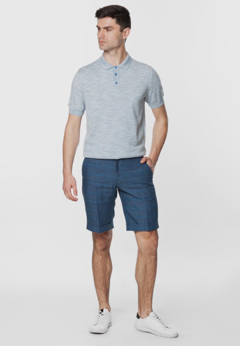 Сині чоловічі шорти в клітину від Gregory Arber створені з легкої екологічної тканини на основі льону. Тканина легко пропускає повітря та убирає вологу. Модель з двома похилими боковими кишенями та двома прорізними задніми. Такі шорти будуть яскравим доповненням літнього гардеробу.