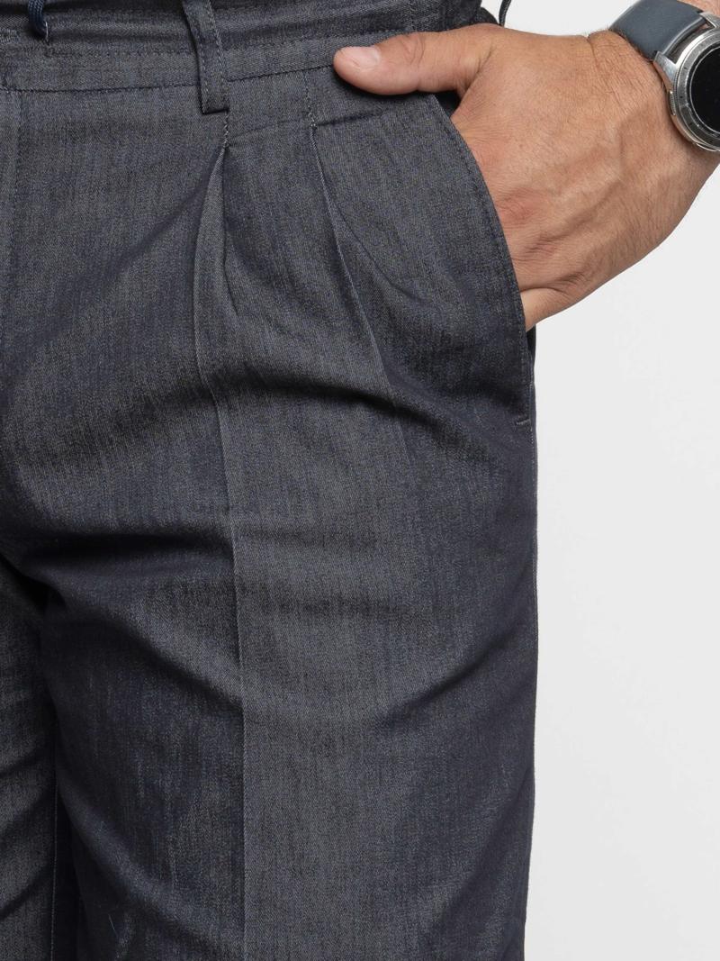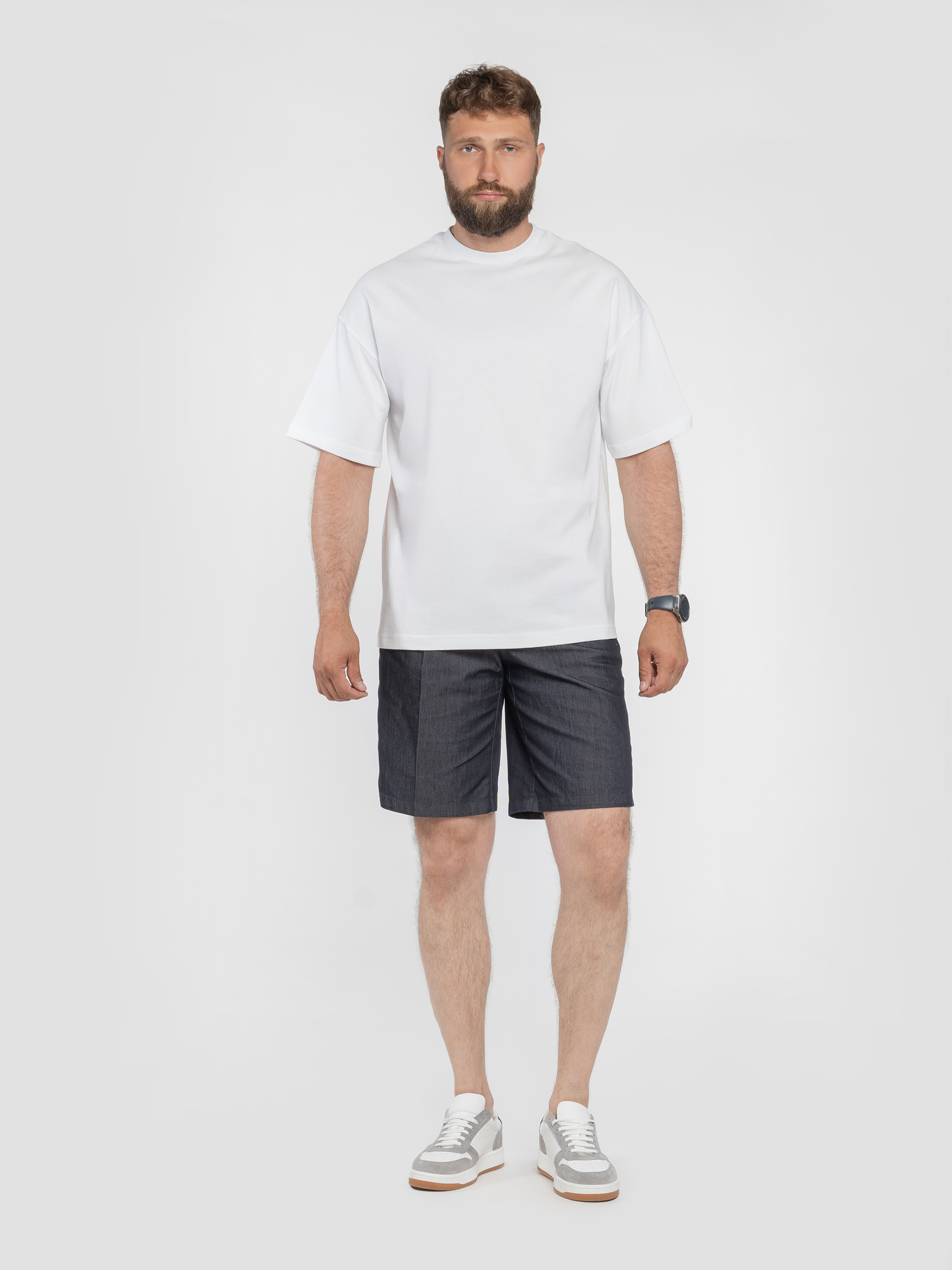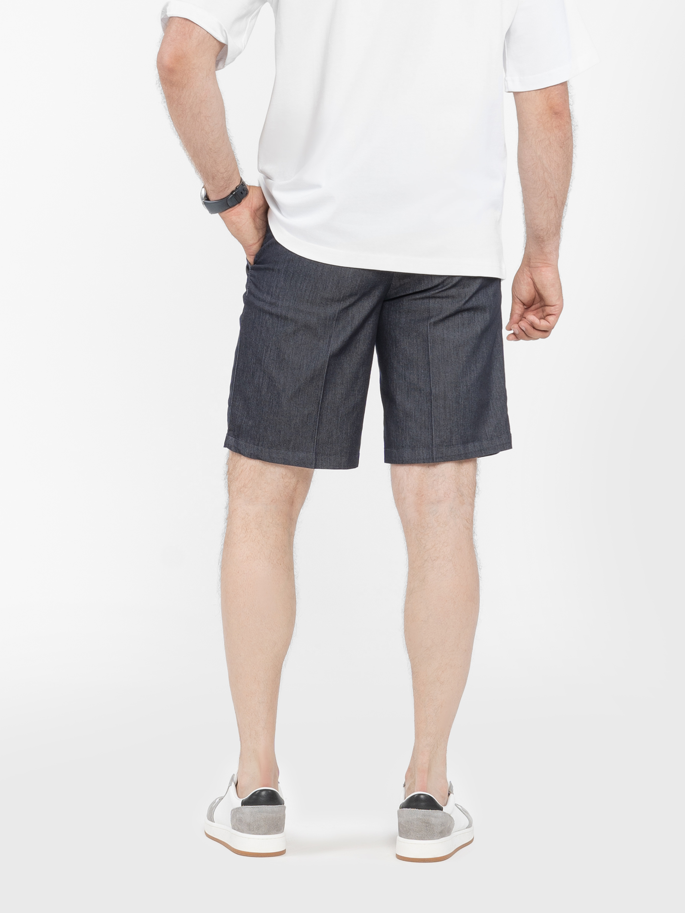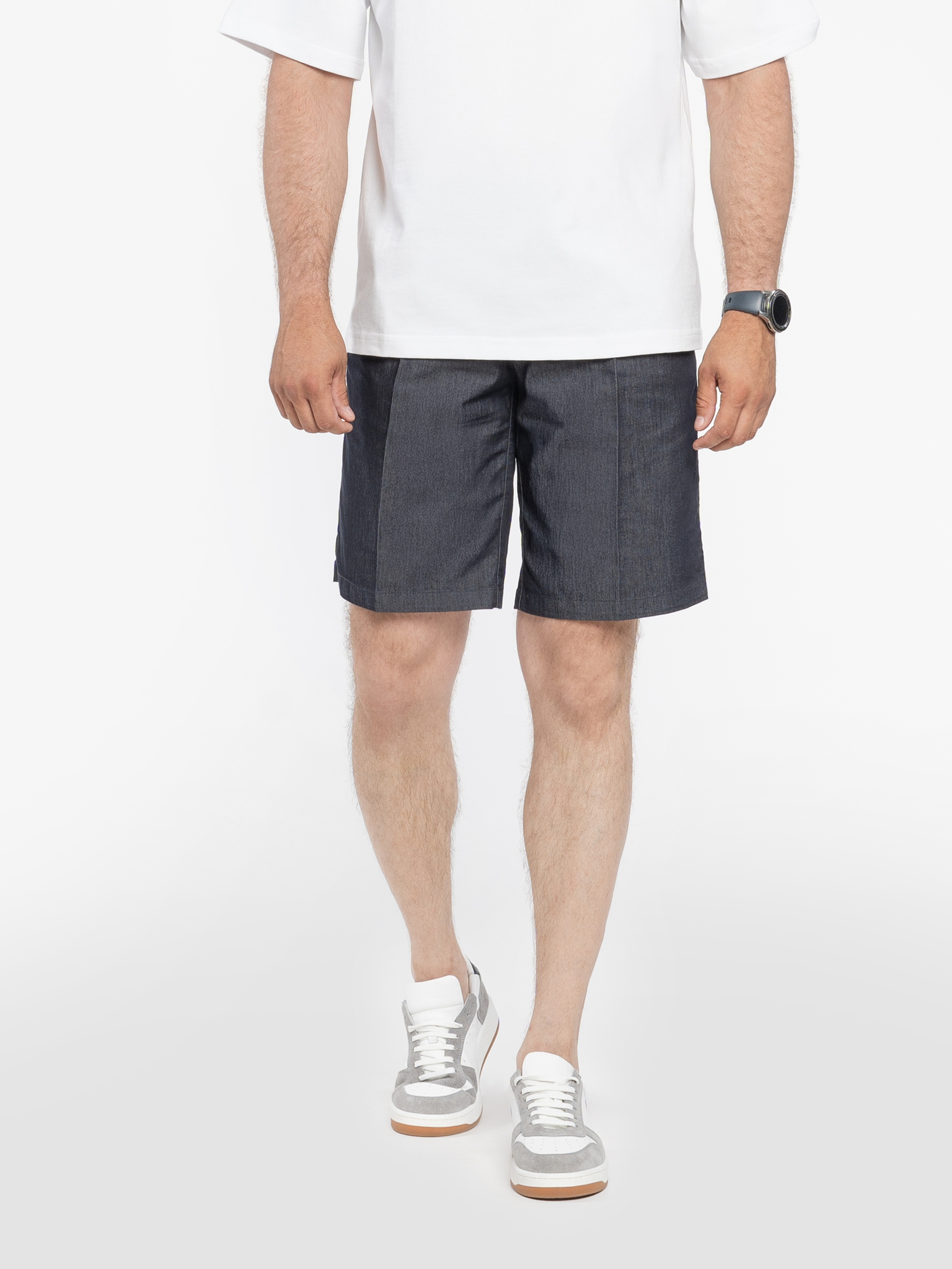 Arber men's shorts in dark blue colour with arrows, made of viscose fabric with cotton and elastane. The material combines softness and lightness, providing comfort and freedom of movement. The fabric is breathable and pleasant to the touch, ideal for warm summer weather. The model is equipped with two slanted side pockets, two back slash pockets, elasticated waistband with drawstring, zip and button fastening. Practical and stylish choice for summer wardrobe. The model on the photo is in size 48. Height: 188 cm. Parameters: 110/80/100