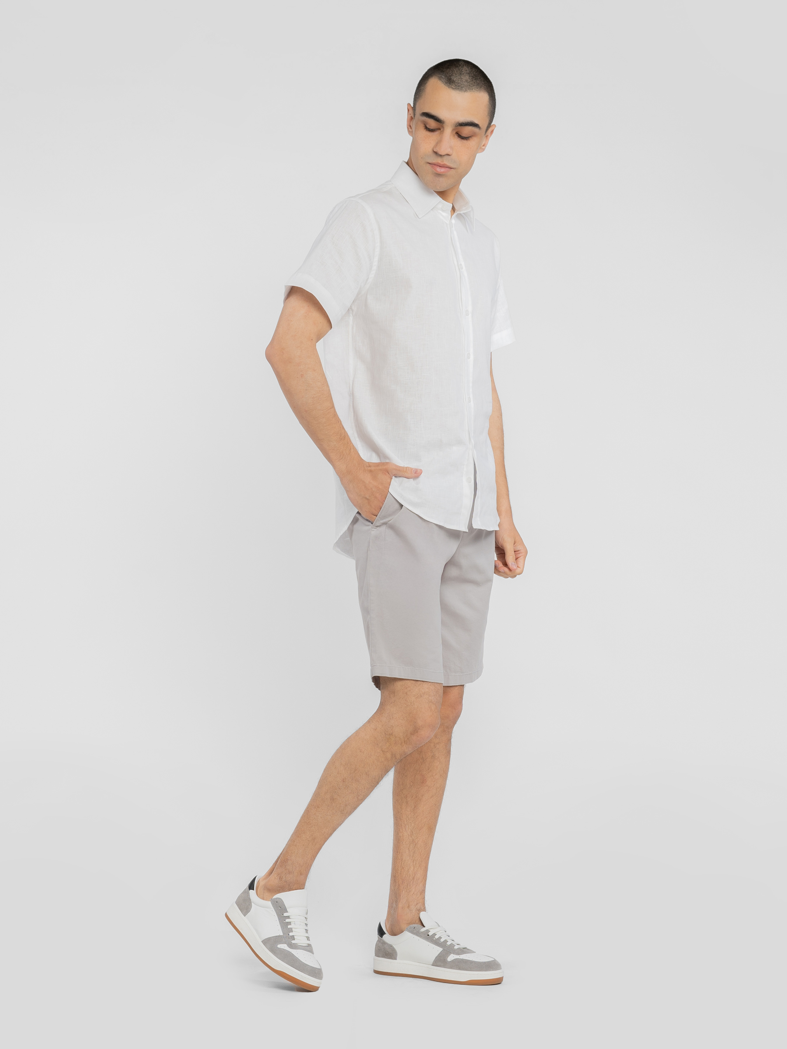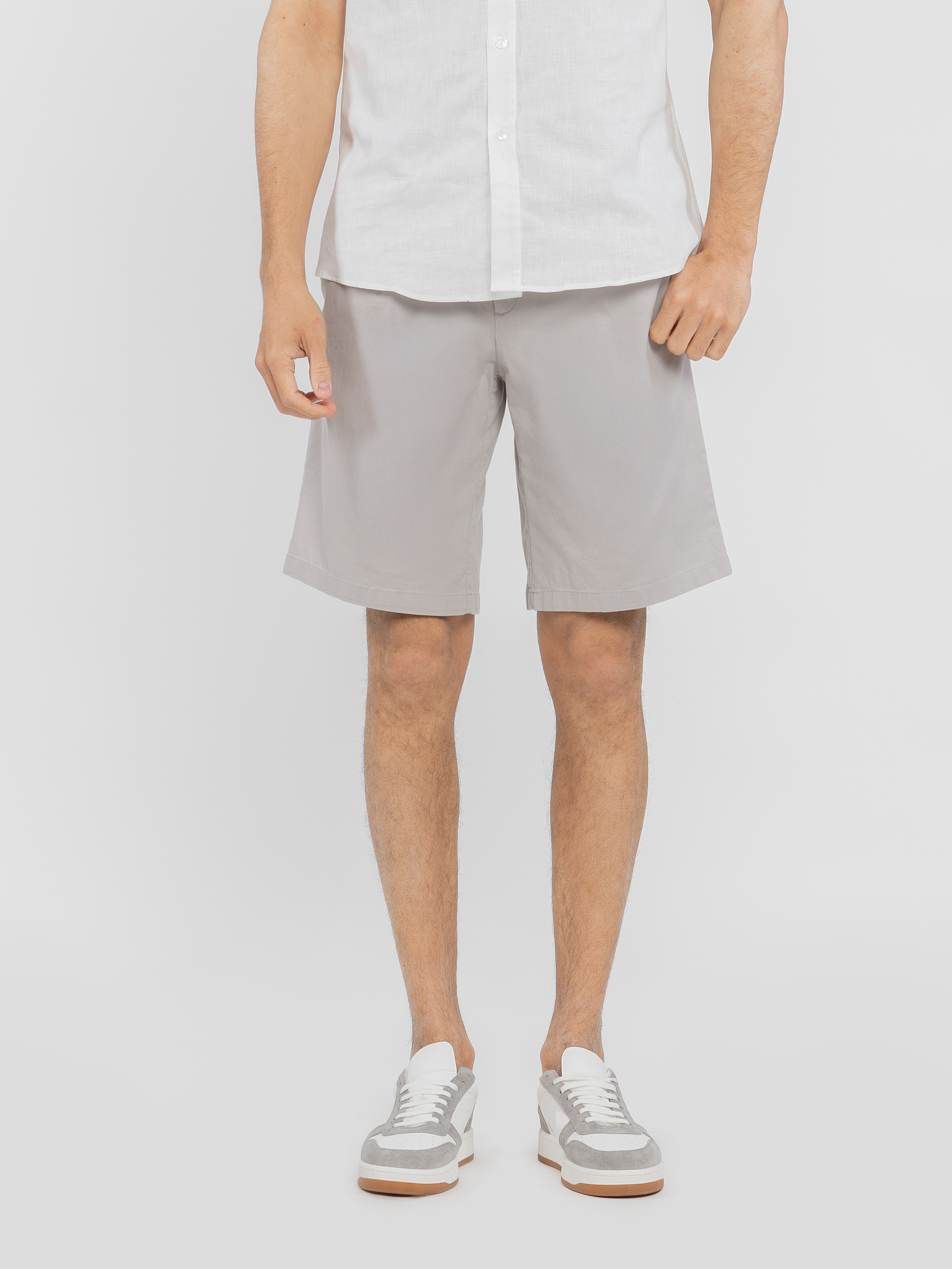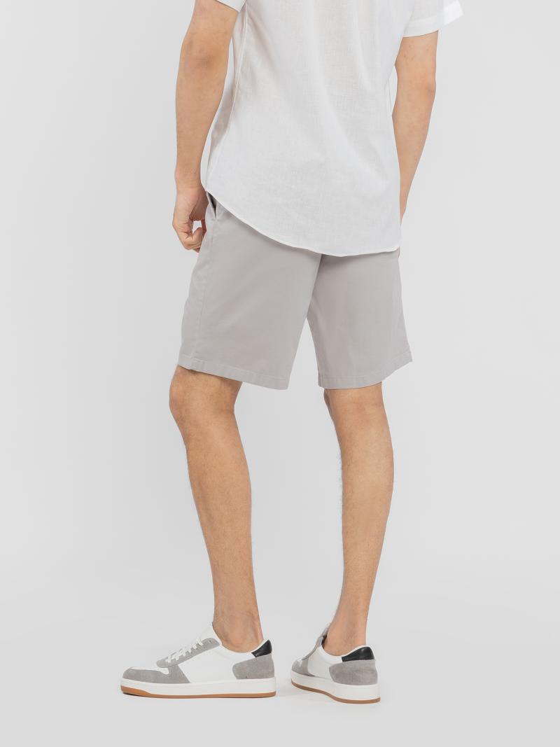 Men's grey Arber shorts, created from breathable lightweight cotton with added elastane. The stretchy fabric makes them comfortable and convenient. The model is comfortable, with two slanted side pockets and two back slash pockets, zip and button fastening. The shorts will successfully fit into your casual wardrobe. The model on the photo is in size 48. Height: 183 cm. Parameters: 94/90/100
