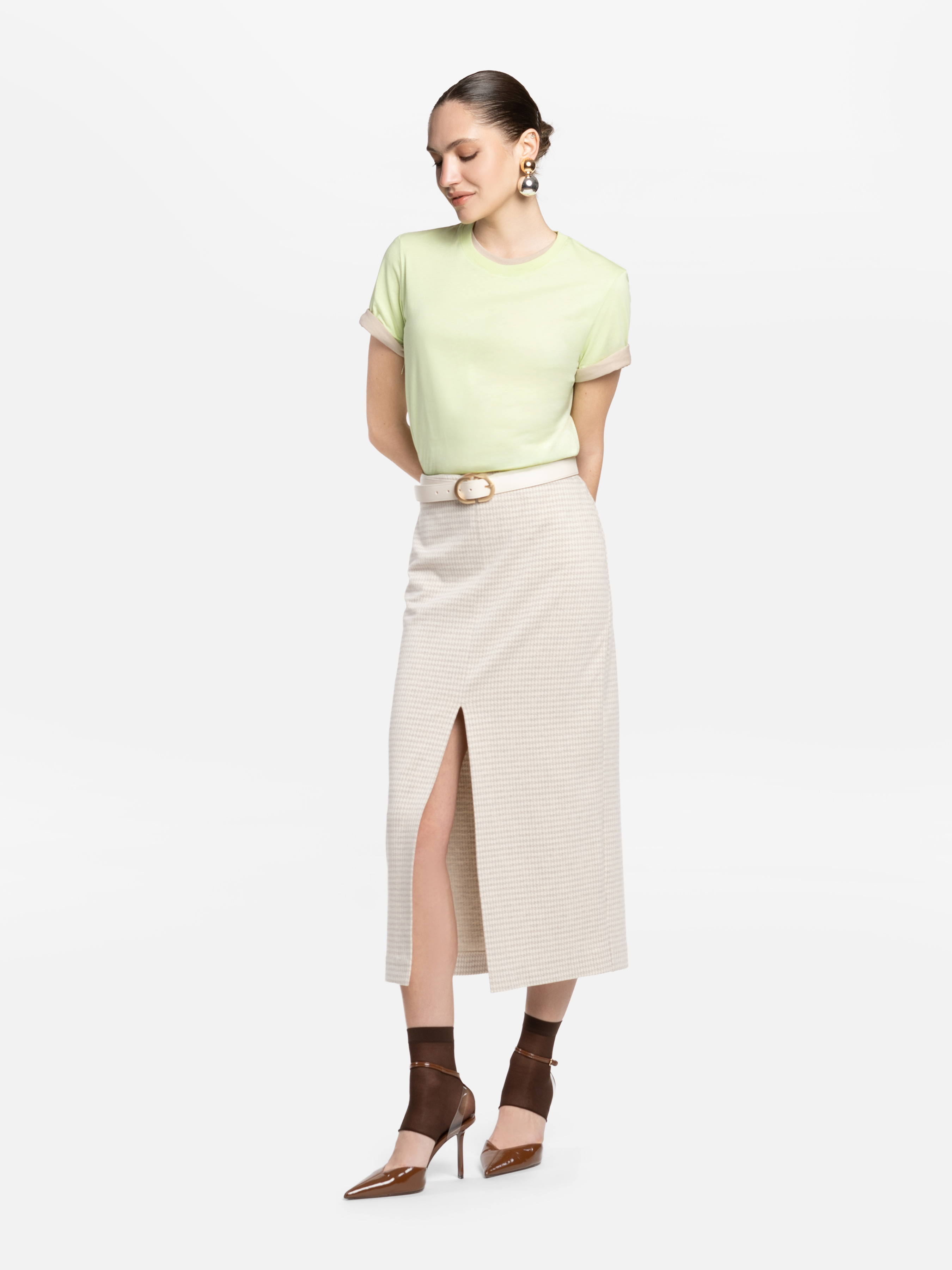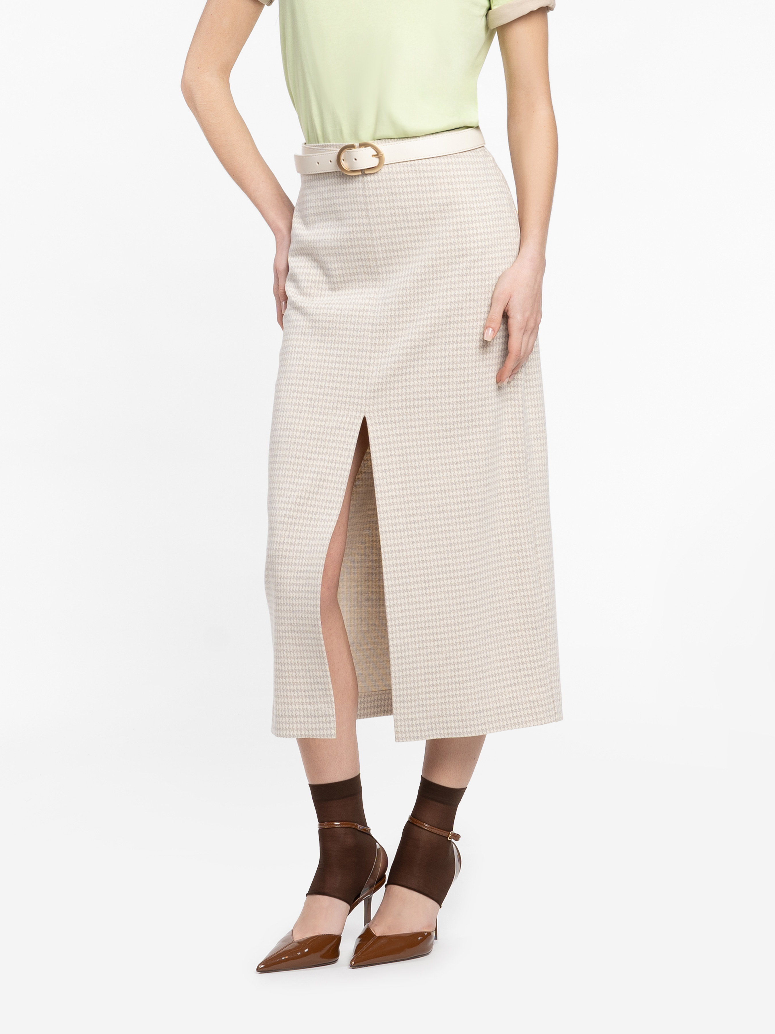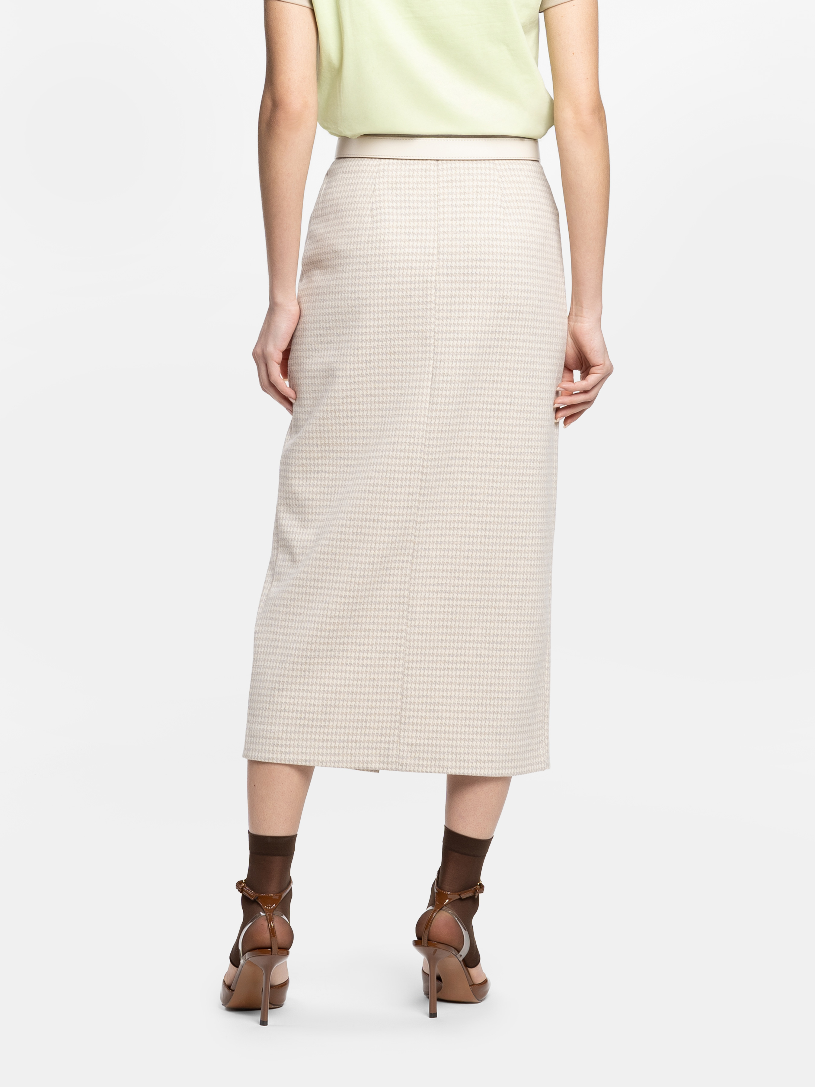 Arber women’s knitted skirt in beige, made from a soft, stretchy fabric with viscose. This straight-cut style features a front slit and a zip fastening, hugging the figure beautifully and accentuating the silhouette. It is complemented by the W02.09.17.611 jacket in the same fabric — together they create a confident, stylish total look. The model in the photo is wearing size 42. Height: 175 cm. Measurements: 84/61/91