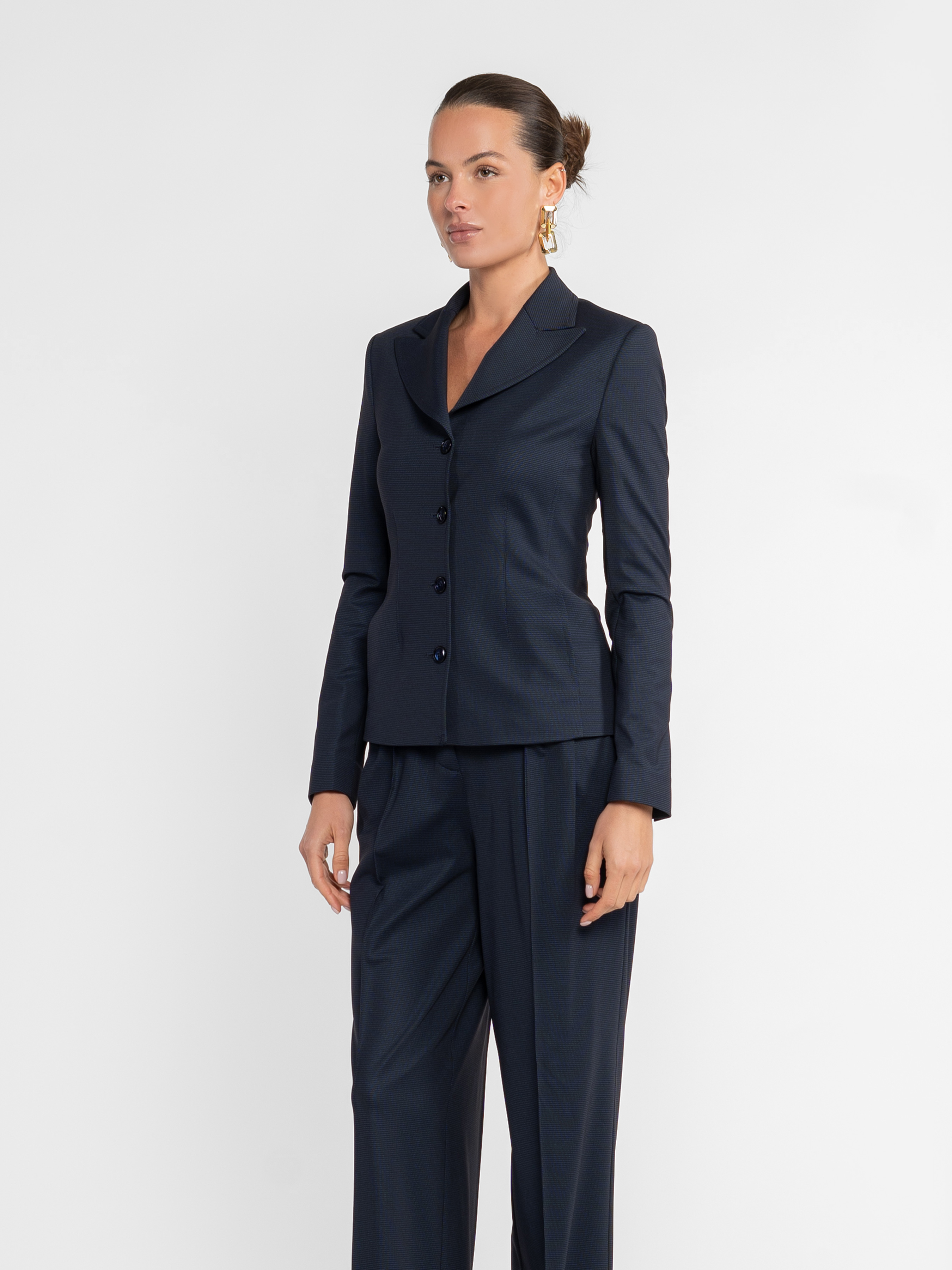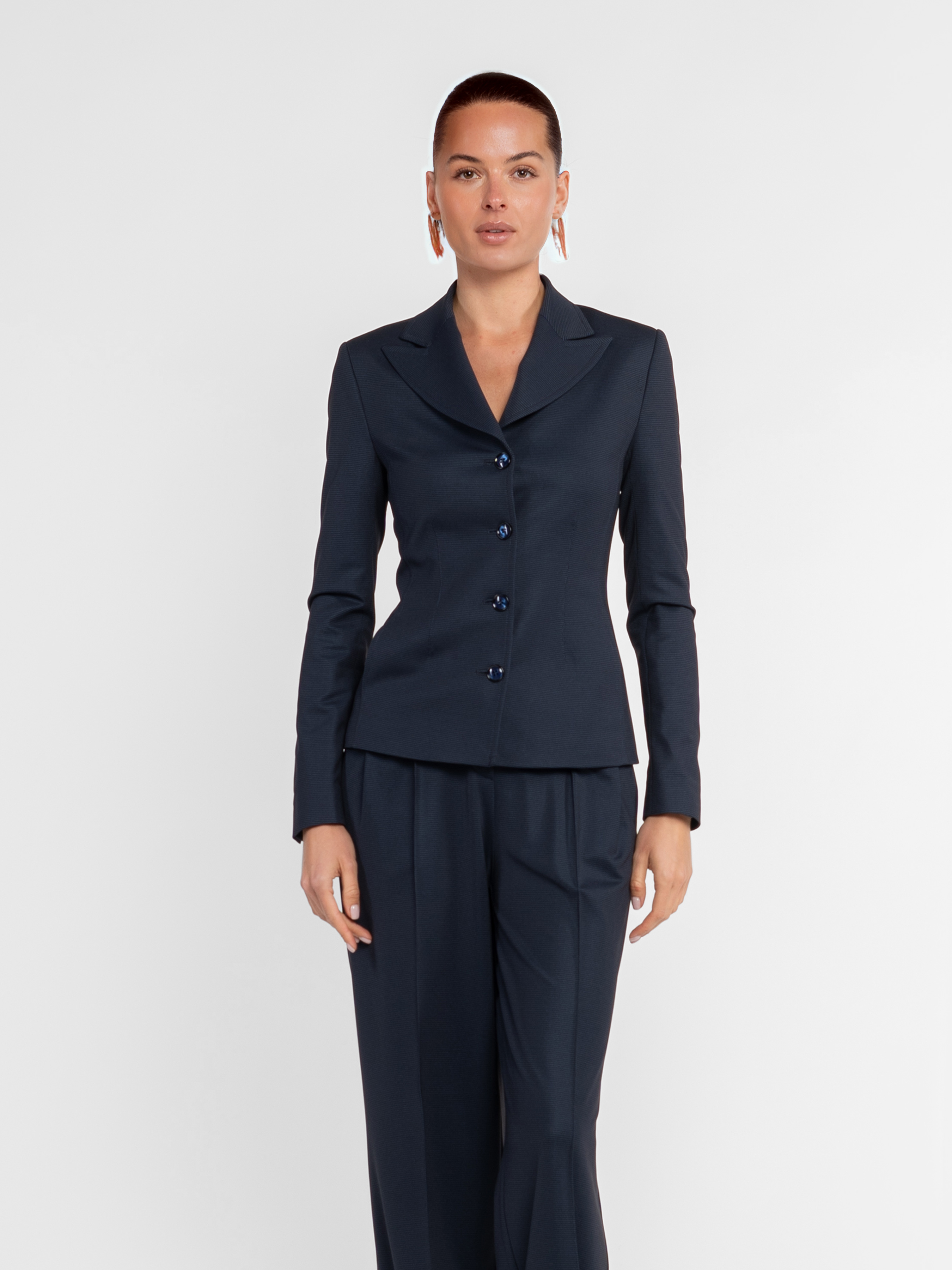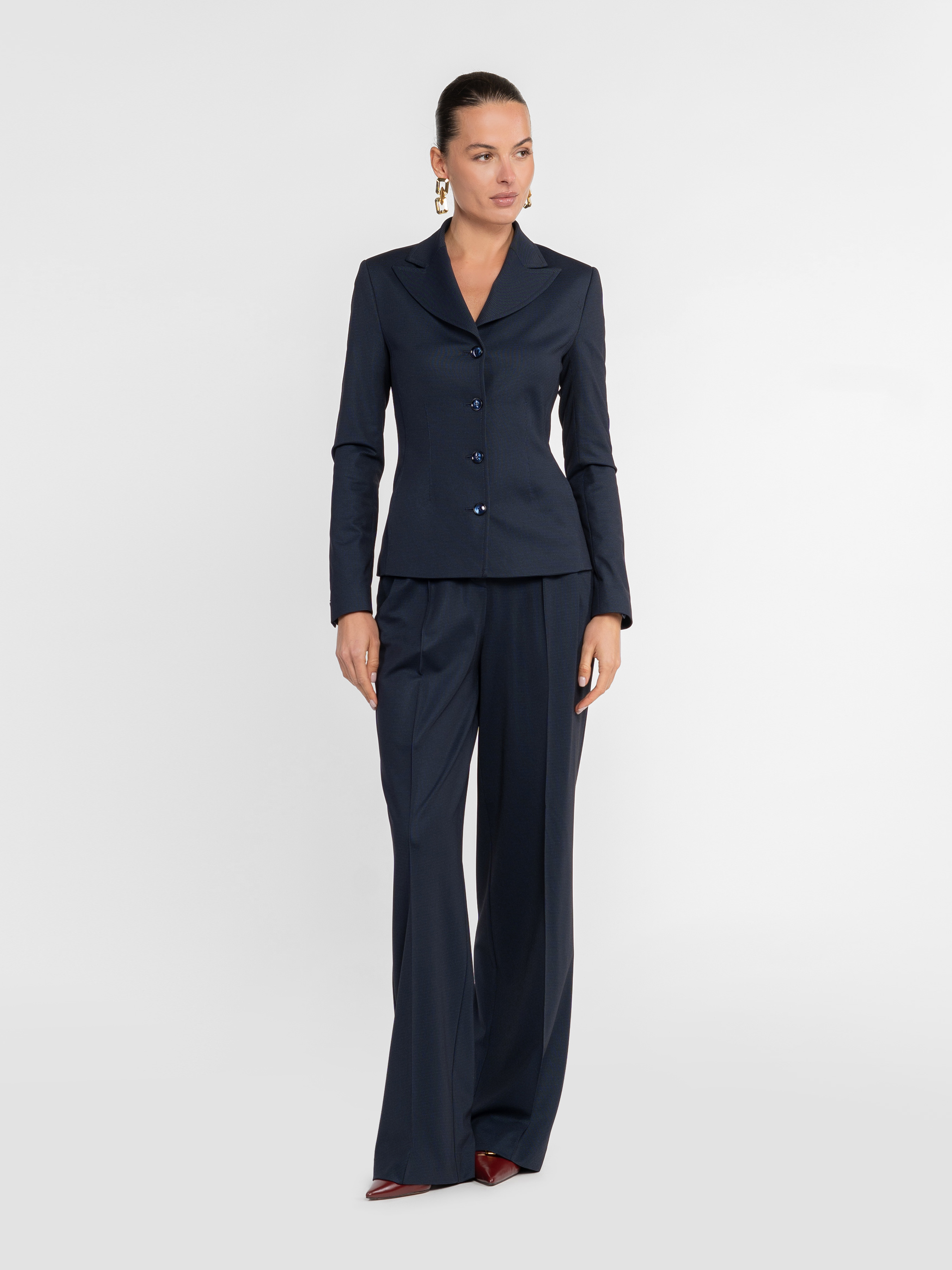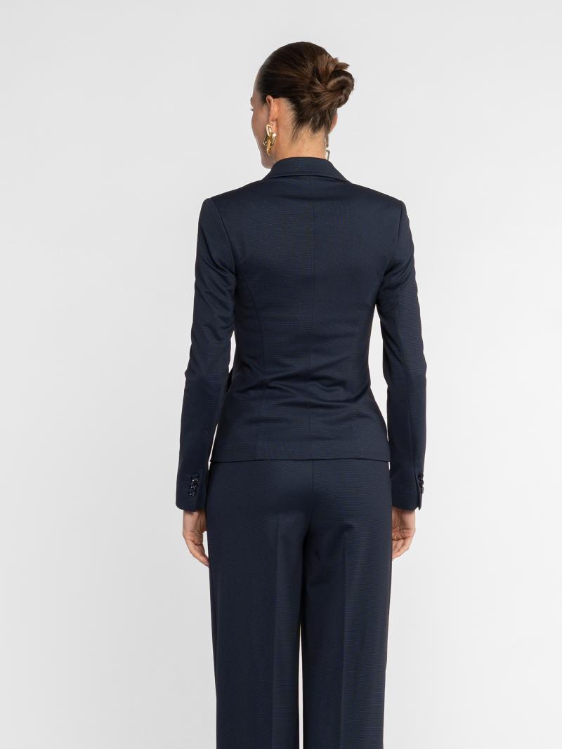 The Arber women's dark blue knitted jacket is made from soft, stretchy fabric with added viscose. The fitted cut and turn-down collar emphasise the femininity of the silhouette, while the button fastening at the front adds classic charm. It pairs perfectly with trousers W01.25.09.532 made from the same fabric, creating a sophisticated and elegant look. The model in the photo is wearing size 42. Height: 178 cm. Measurements: 89/60/90