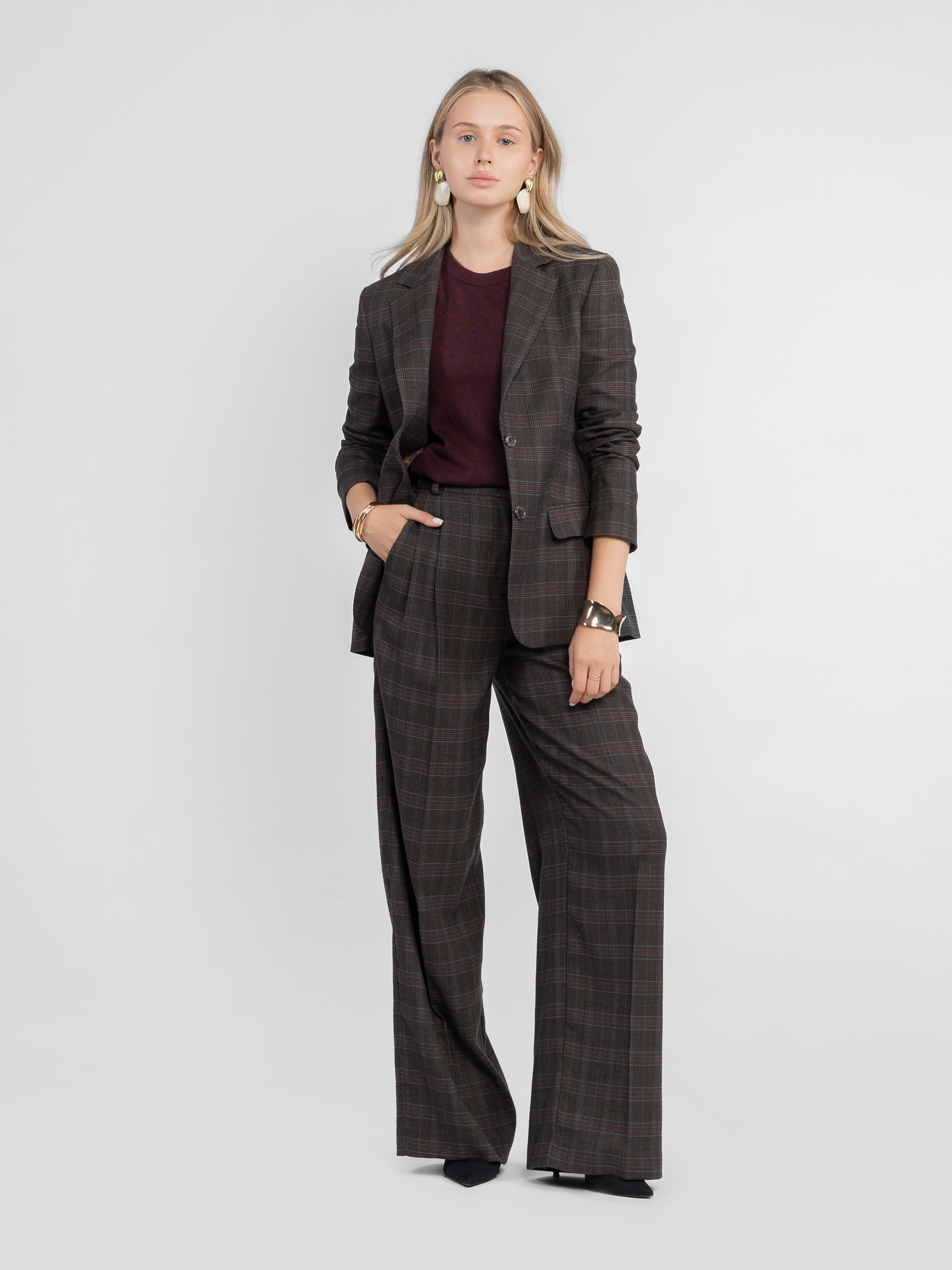 Жіночий жакет Arber коричневого кольору у клітину, виготовлений з м’якої та приємної на дотик тканини. Завдяки додаванню віскози матеріал має шовковисту текстуру, добре тримає форму та майже не мнеться. Напівприталений крій підкреслює силует, однобортна застібка на ґудзики додає стриманої елегантності. Прямі лацкани та дві прорізні кишені з клапаном забезпечують комфорт і функціональність. Для створення елегантного комплекту жакет ідеально поєднується з брюками W01.01.39.531 або W01.02.39.531 з тієї ж тканини, а також легко комбінується зі спідницями або джинсами. Модель на фото у розмірі 42. Зріст: 168 см. Параметри: 80/62/87