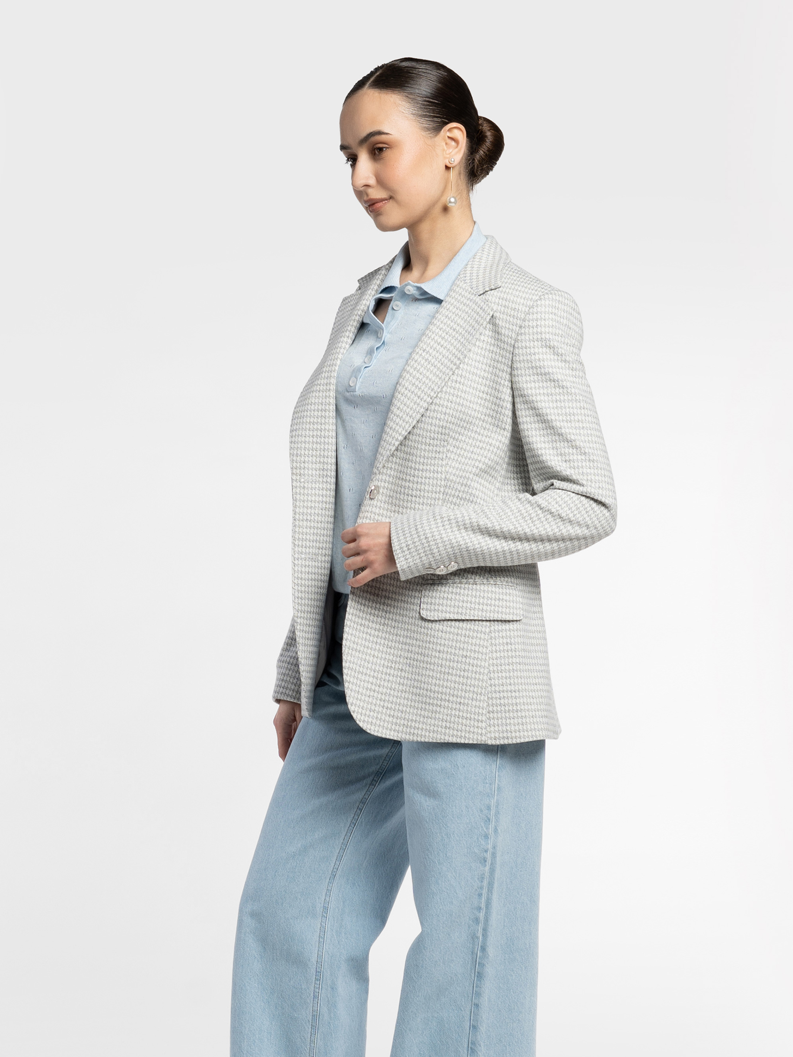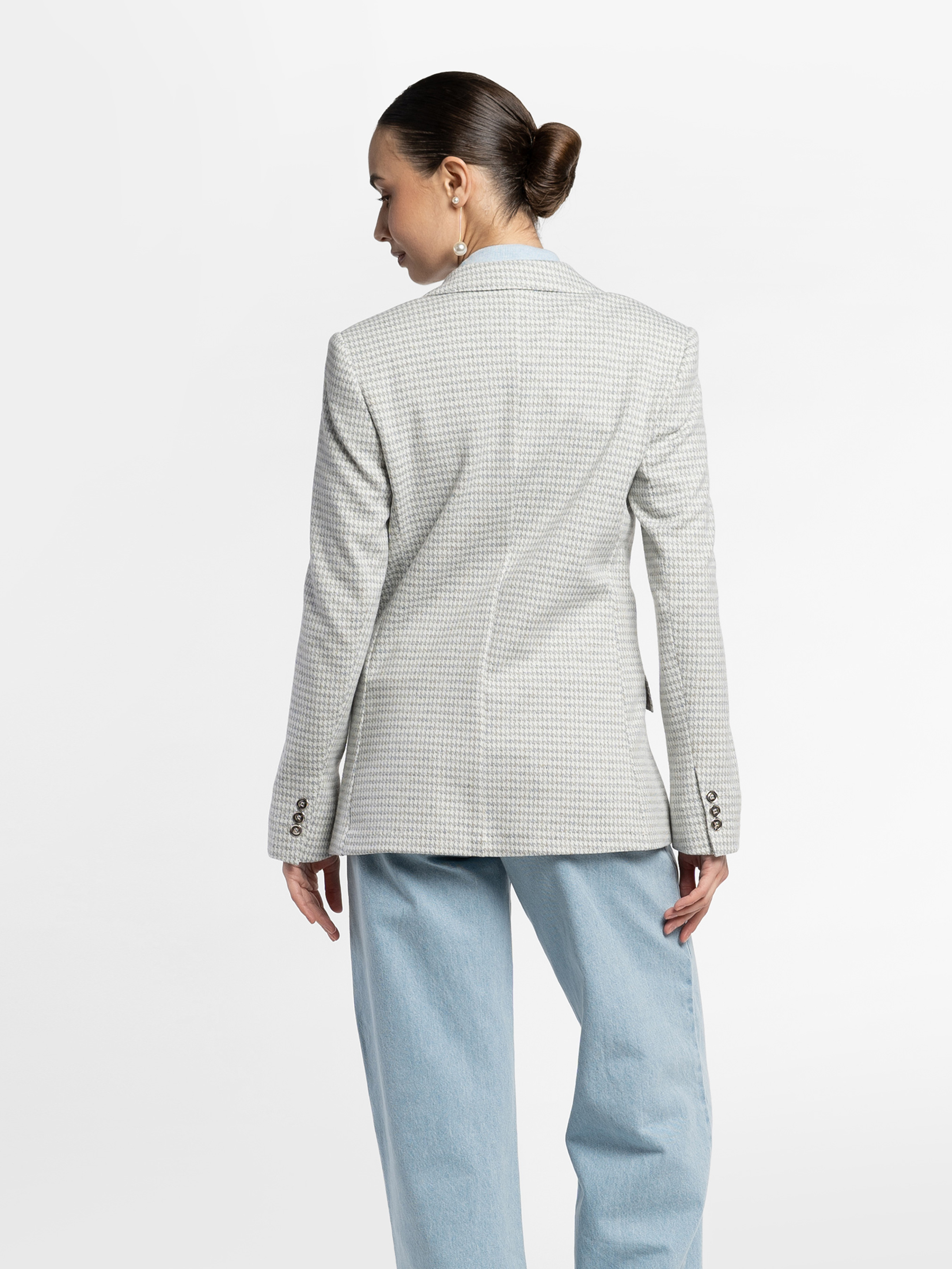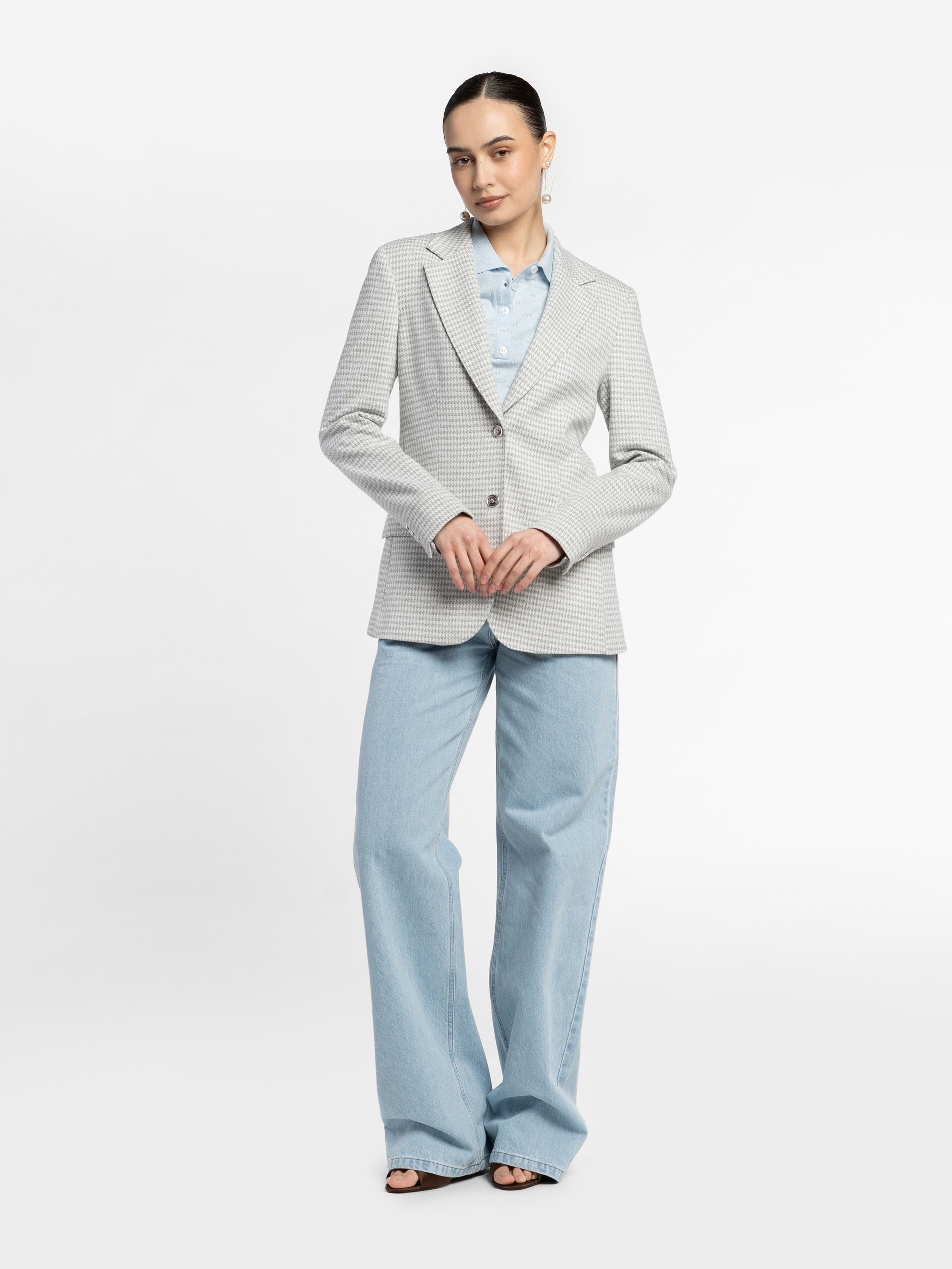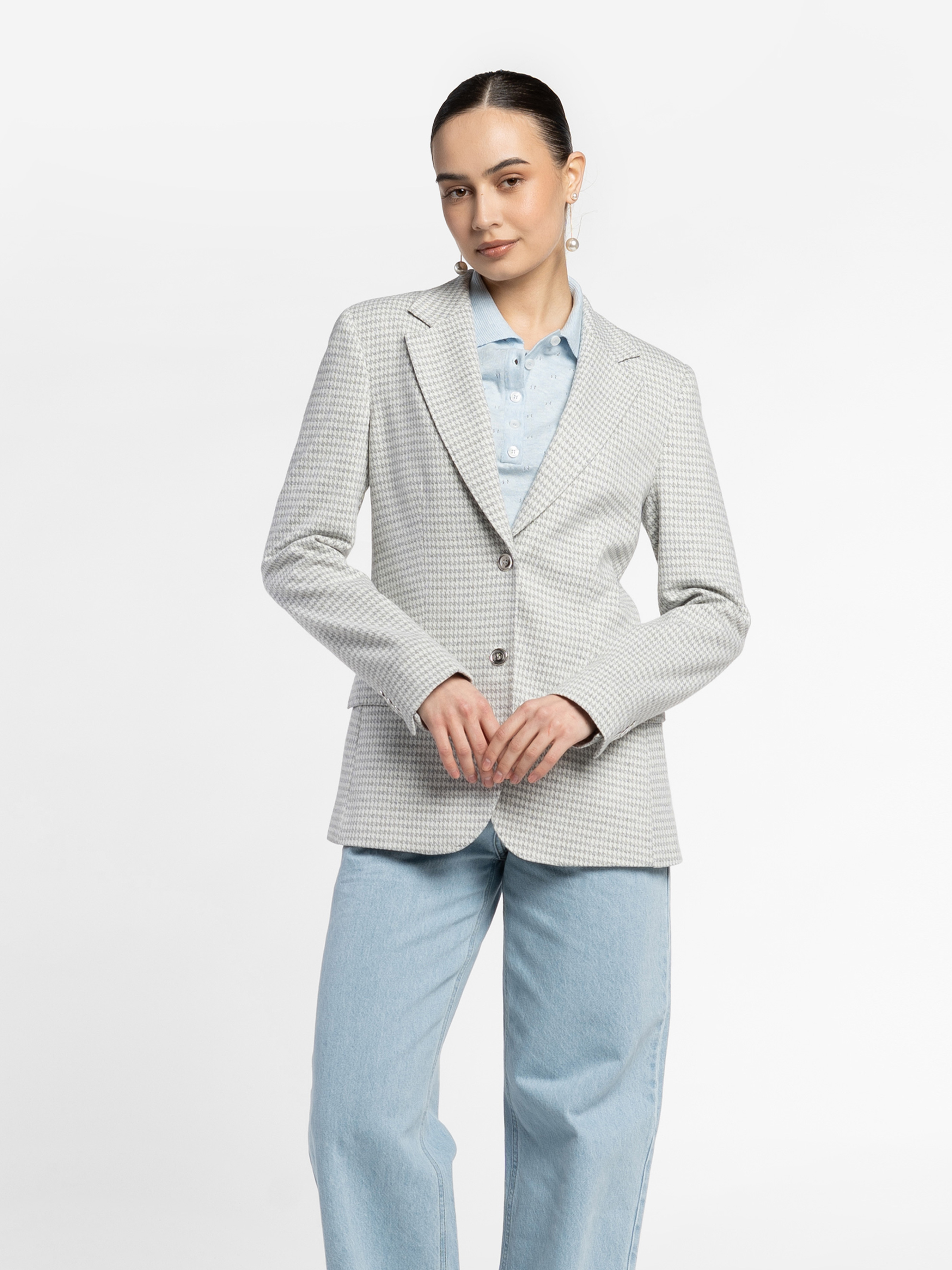 Arber women's grey knitted jacket made from soft fabric with added viscose. The straight cut creates a harmonious balance of strength and elegance. A single-breasted button fastening, straight lapels and two slit pockets with flaps ensure a perfect fit and functionality. It perfectly complements the W01.07.16.611 trousers made from the same fabric, as well as stylish skirts, creating a sophisticated total look. The model in the photo is wearing size 44. Height: 168 cm. Measurements: 79/60/88