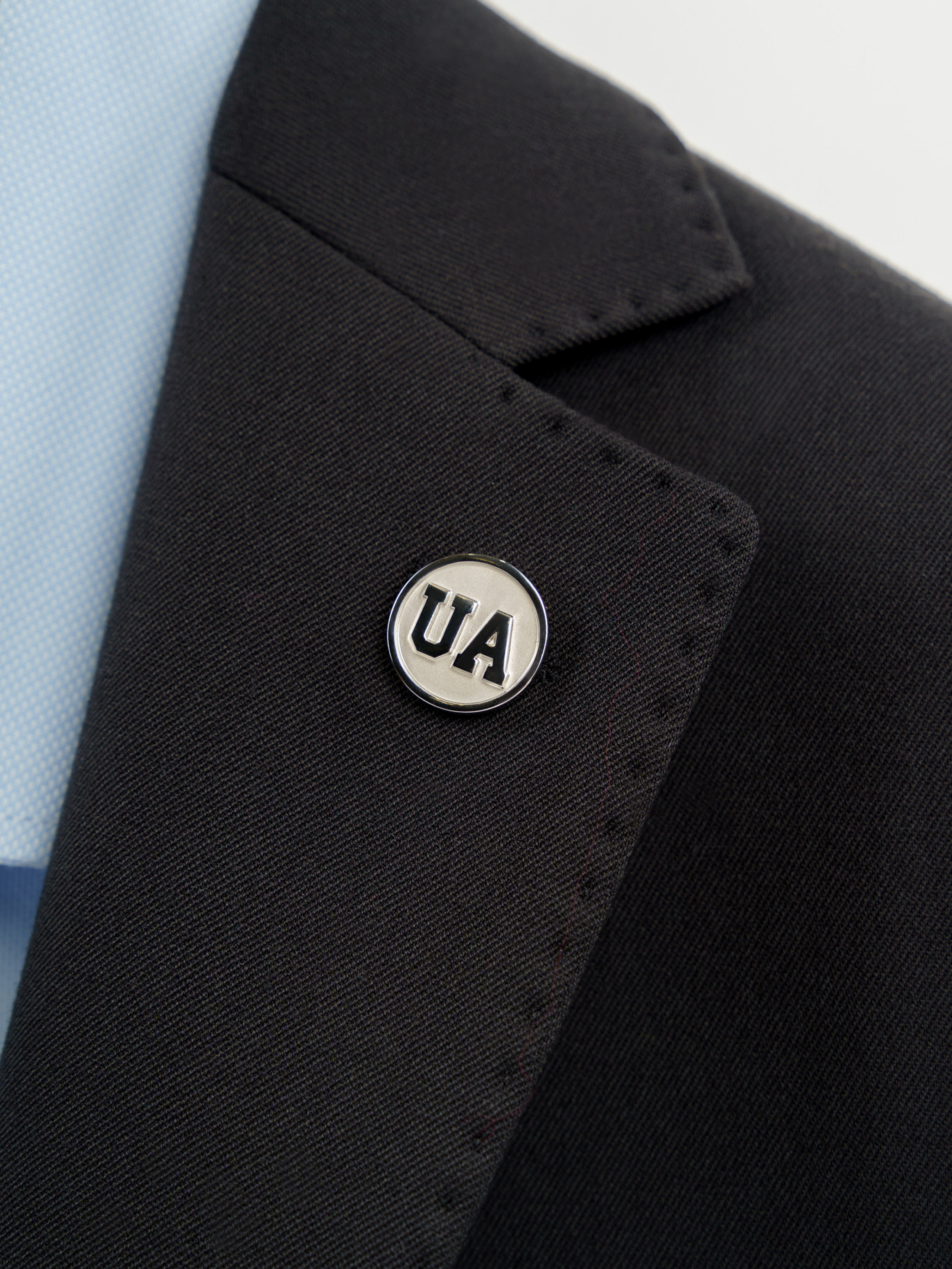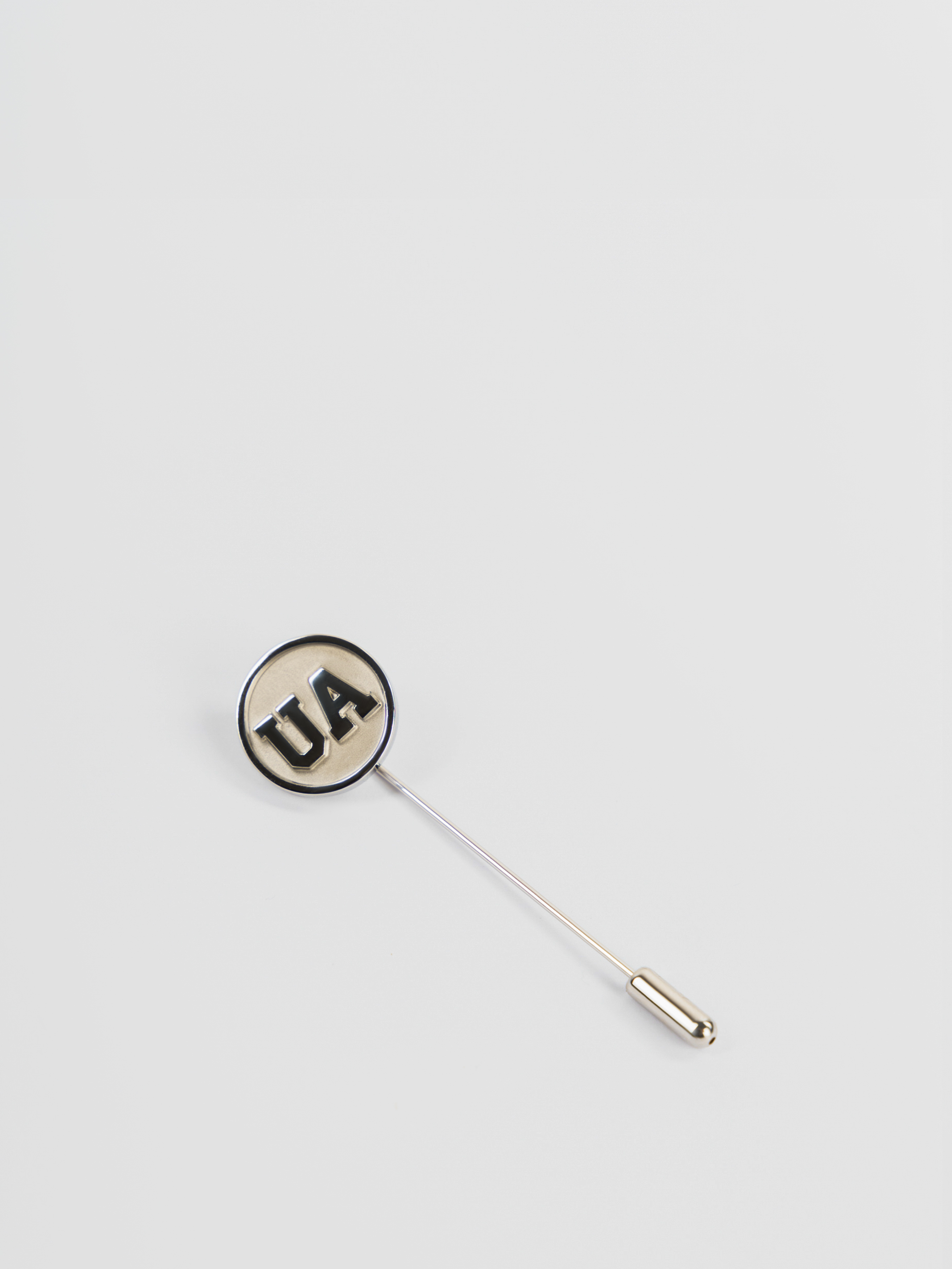 Патріотична булавка для лацкана піджака від Arber, створена з нержавіючої сталі та прикрашена об'ємним зображенням літер UA.