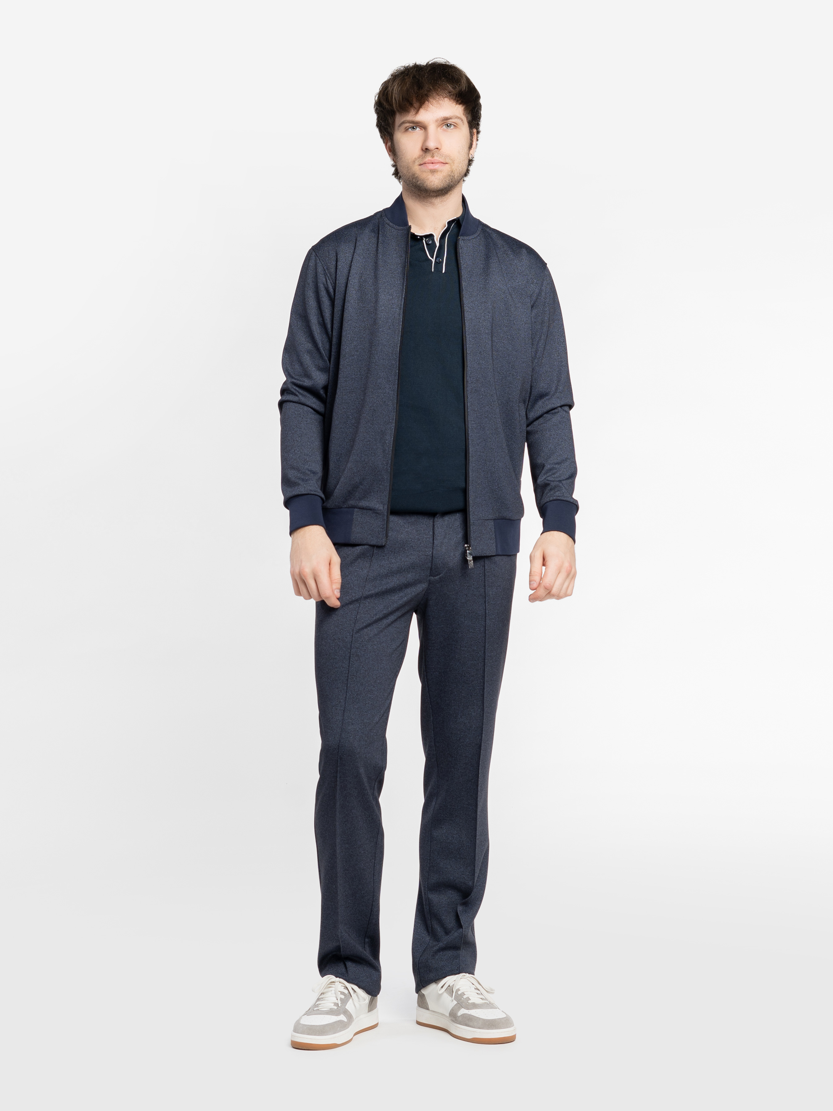 Чоловічий синій бомбер Arber з еластичного трикотажу на основі бавовни та віскози. М’яка, приємна на дотик тканина дихає, не мнеться, стійка до забруднень і забезпечує свободу рухів. Застібка на блискавку, дві кишені та еластичні вставки на манжетах, комірі й понизу додають комфорту й динаміки образу. Ідеально поєднується з брюками M01.04.09.61 з тієї ж тканини або джинсами для невимушеного повсякденного образу. Модель на фото у розмірі 48. Зріст: 183 см. Параметри: 94/90/100