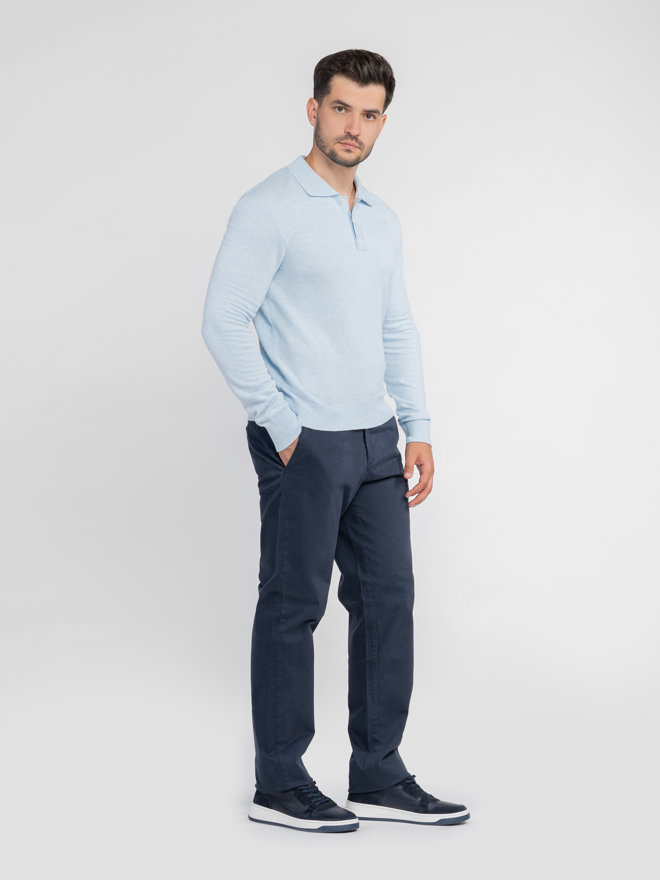 Чоловічі брюки Arber темно-синього кольору, створені з натуральної м’якої бавовни з додаванням еластану для тепла і комфорту. Сучасний крій забезпечує ідеальну посадку по фігурі, поєднуючи елегантність і практичність. Модель має застібку на блискавку та ґудзик, дві похилі бічні кишені і дві прорізні задні. Нижній край брюк оформлений з невеликим підворотом, що додає образу сучасного акценту. Ідеально підходять для стильних casual-комплектів у поєднанні з сорочками, светрами або тонкими пуловерами. Модель на фото у розмірі 48. Зріст: 180 см. Параметри: 103/85/97