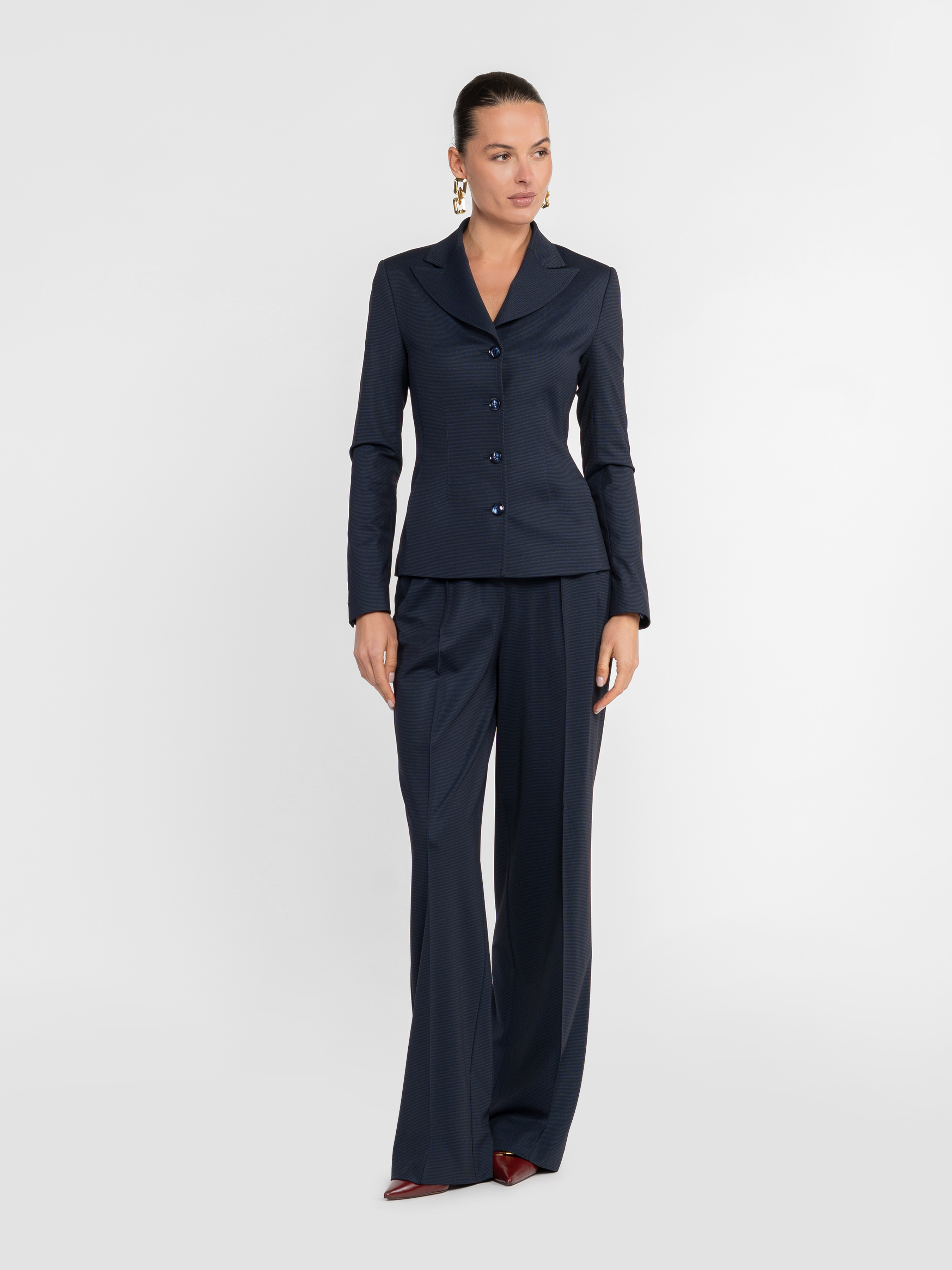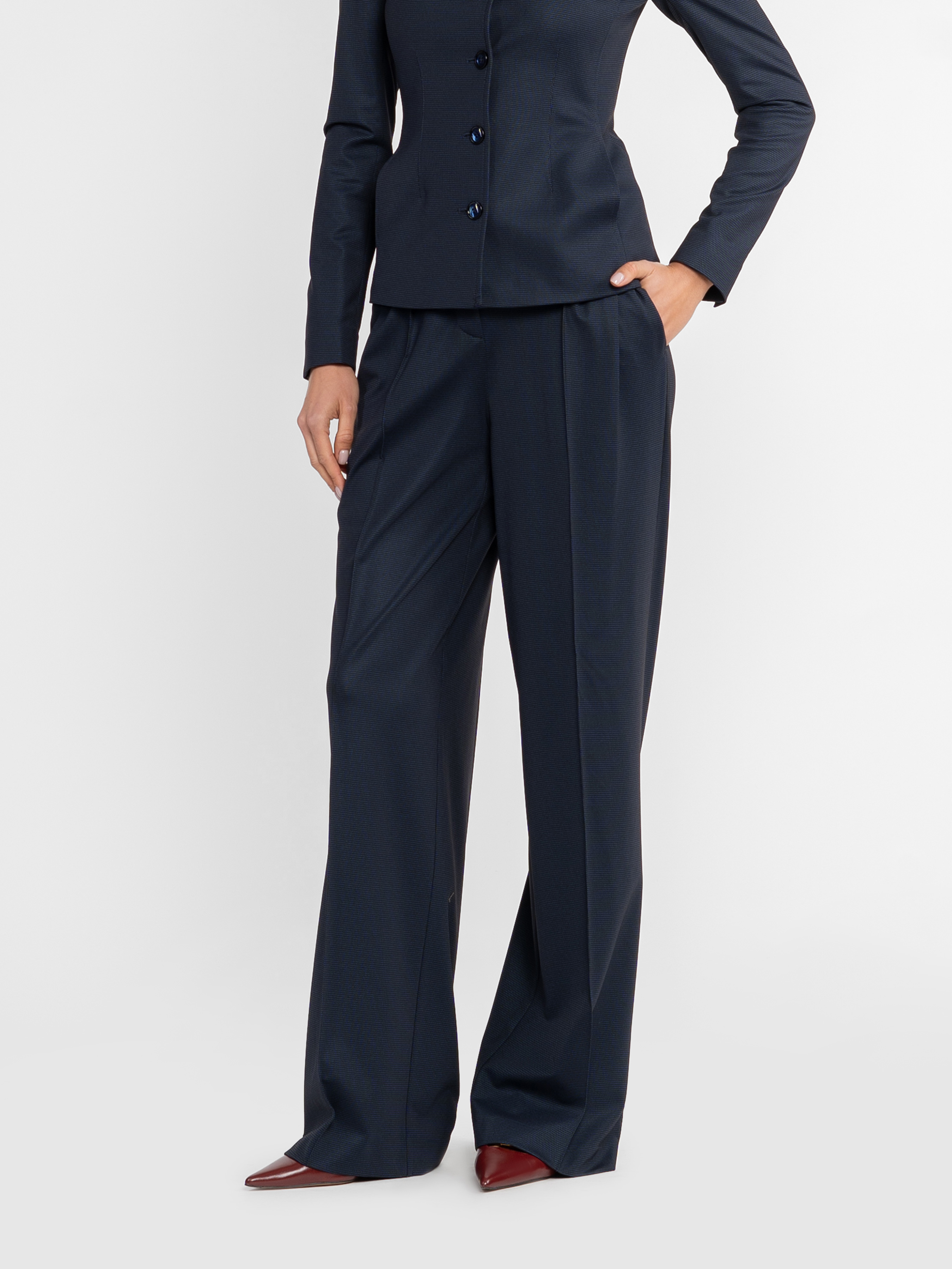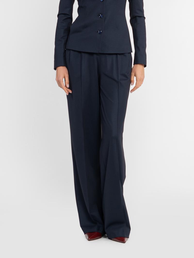 Жіночі трикотажні брюки Arber темно-синього кольору, виконані з м’якої еластичної тканини з додаванням віскози. Матеріал приємний на дотик, добре тягнеться, тримає форму та ідеально сідає по фігурі. Висока посадка, м’які защіпи та вільний прямий крій створюють витончений силует і забезпечують комфорт. Брюки чудово поєднуються з жакетом W02.03.09.532 із тієї ж тканини, сорочками чи базовим трикотажем — ідеальна база для щоденних і офісних образів у стилі smart casual. Модель на фото у розмірі 42. Зріст: 178 см. Параметри: 89/60/90
