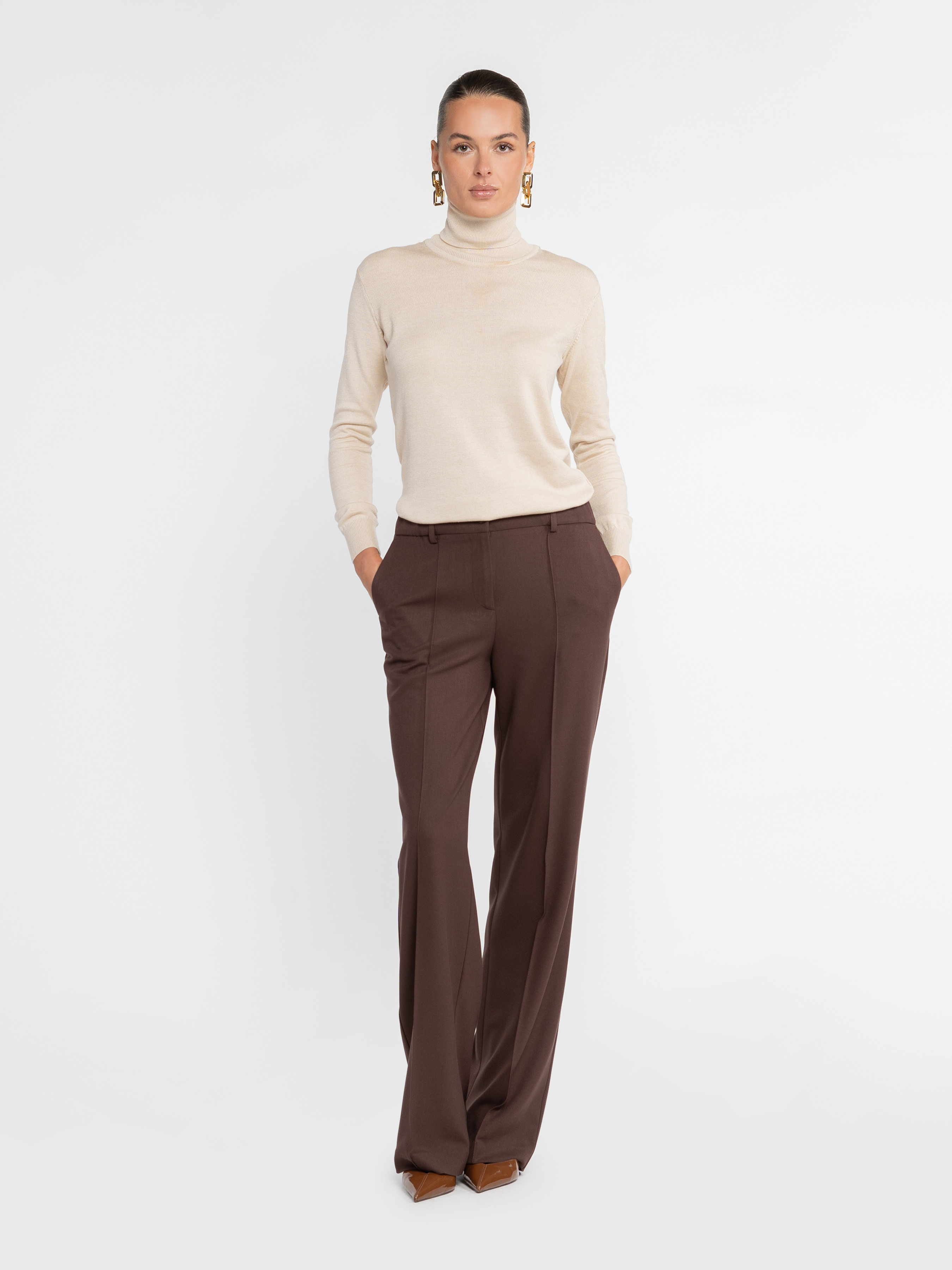 Жіночі брюки Arber коричневого кольору виконані з м’якої, приємної на дотик тканини з додаванням віскози. Завдяки шовковистій текстурі матеріал добре тримає форму та майже не мнеться. Модель зі стрілками має середню посадку, прямий крій і зручний пояс на гумці ззаду. Дві похилі бокові кишені додають практичності. Брюки легко поєднуються з жакетом, трикотажним лонгслівом або гольфом. Модель на фото у розмірі 42. Зріст: 178 см. Параметри: 89/60/90