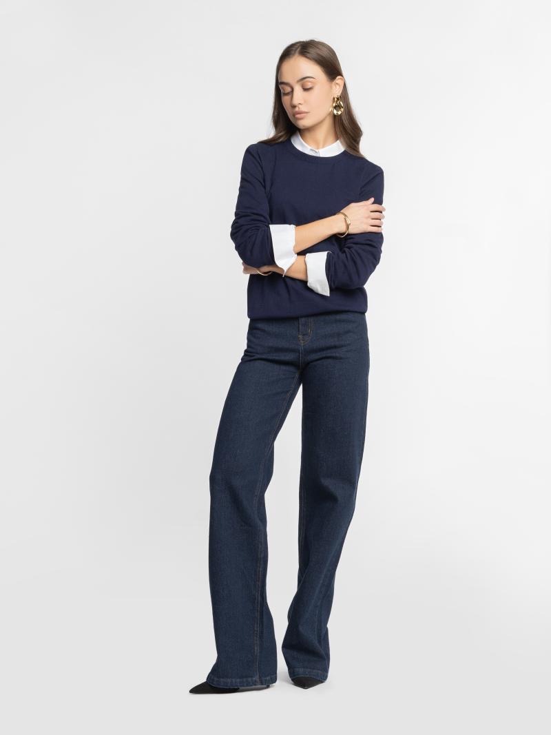 Жіночі джинси Arber у темно-синьому кольорі. Виконані з бавовни та додаванням еластану, комфортні, тримають форму та дарують свободу рухів. Джинси з високою посадкою та п'ятьма кишенями. Широка екстрадовга штанина. Застібка спереду на блискавку та металевий ґудзик. Лаконічний дизайн і глибокий відтінок роблять їх універсальною базою для сучасних образів. Модель на фото у розмірі 42. Зріст: 178 см. Параметри: 89/60/90