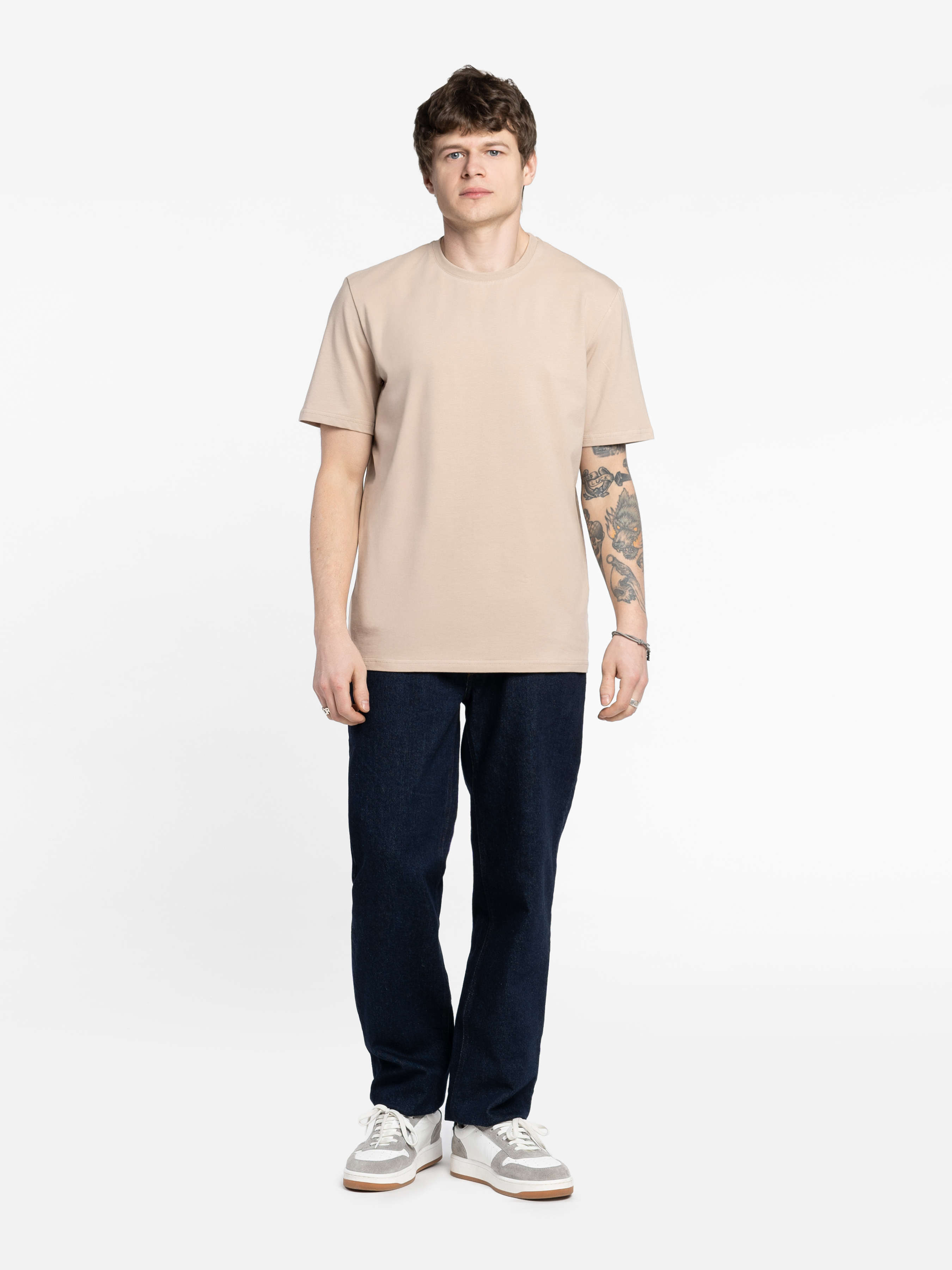 Чоловіча футболка Arber бежевого кольору, прямого силуету. Виготовлена з тонкого бавовняного джерсі, яке забезпечує комфорт і м’яке відчуття на тілі. Легка, приємна до шкіри, ідеально підходить для щоденного носіння. Базова футболка незамінна річ у чоловічому гардеробі у стилі casual. Модель на фото у розмірі 48. Зріст: 188 см. Параметри: 110/80/100