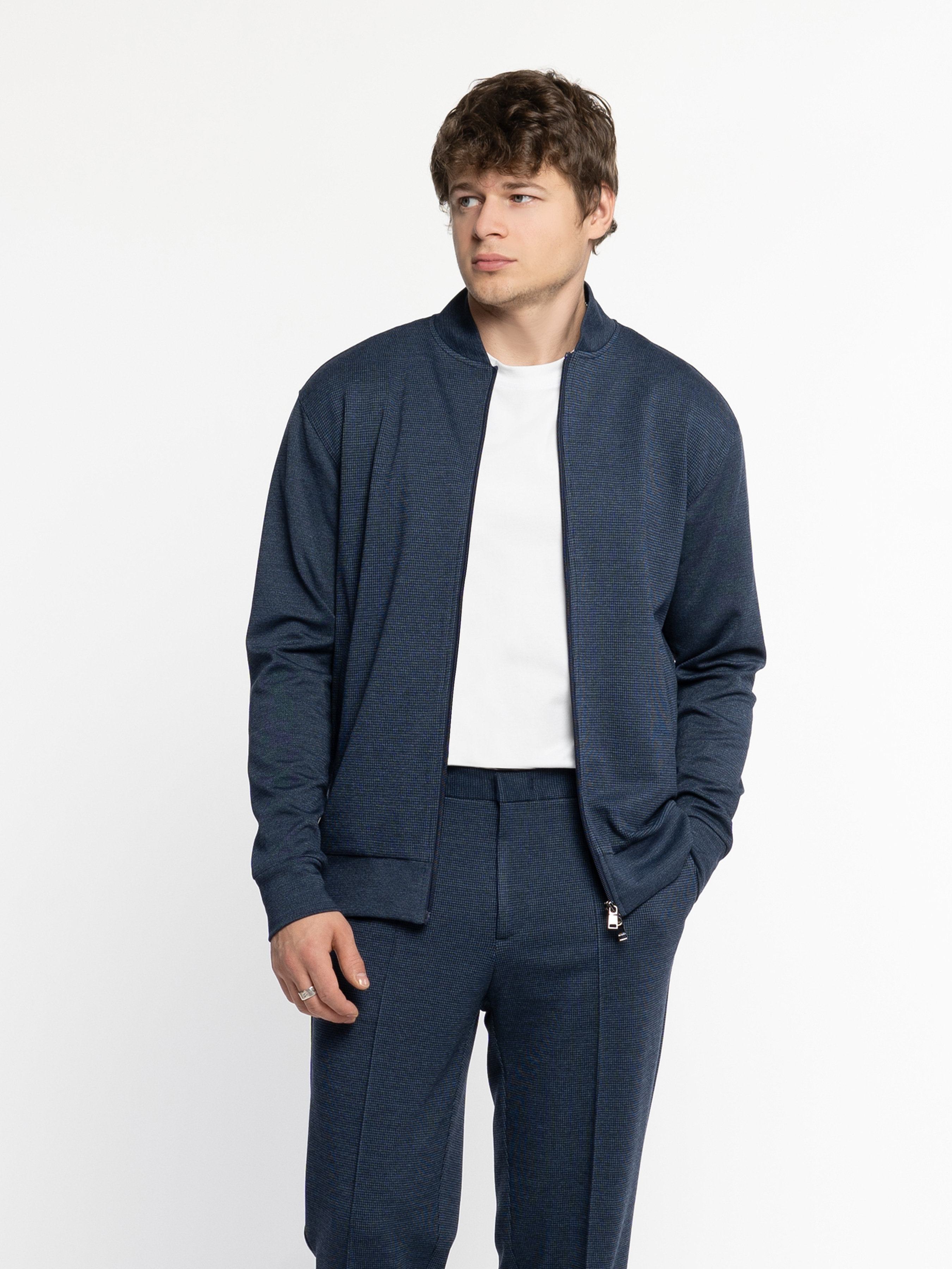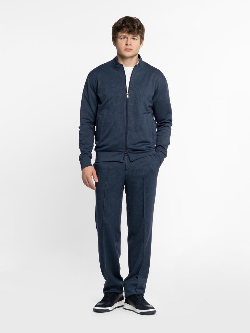 Чоловічий темно-синій бомбер Arber із еластичного трикотажу на основі бавовни та віскози. М’яка, приємна на дотик тканина дихає, не мнеться, стійка до забруднень та забезпечує свободу рухів. Застібка на блискавку, дві кишені та еластичні вставки на манжетах, комірі й понизу додають комфорту й динаміки образу. Ідеально поєднується з брюками M01.01.06.531 із тієї ж тканини для стильного комплекту. Модель на фото: розмір 48, зріст 188 см, параметри 97/78/96.