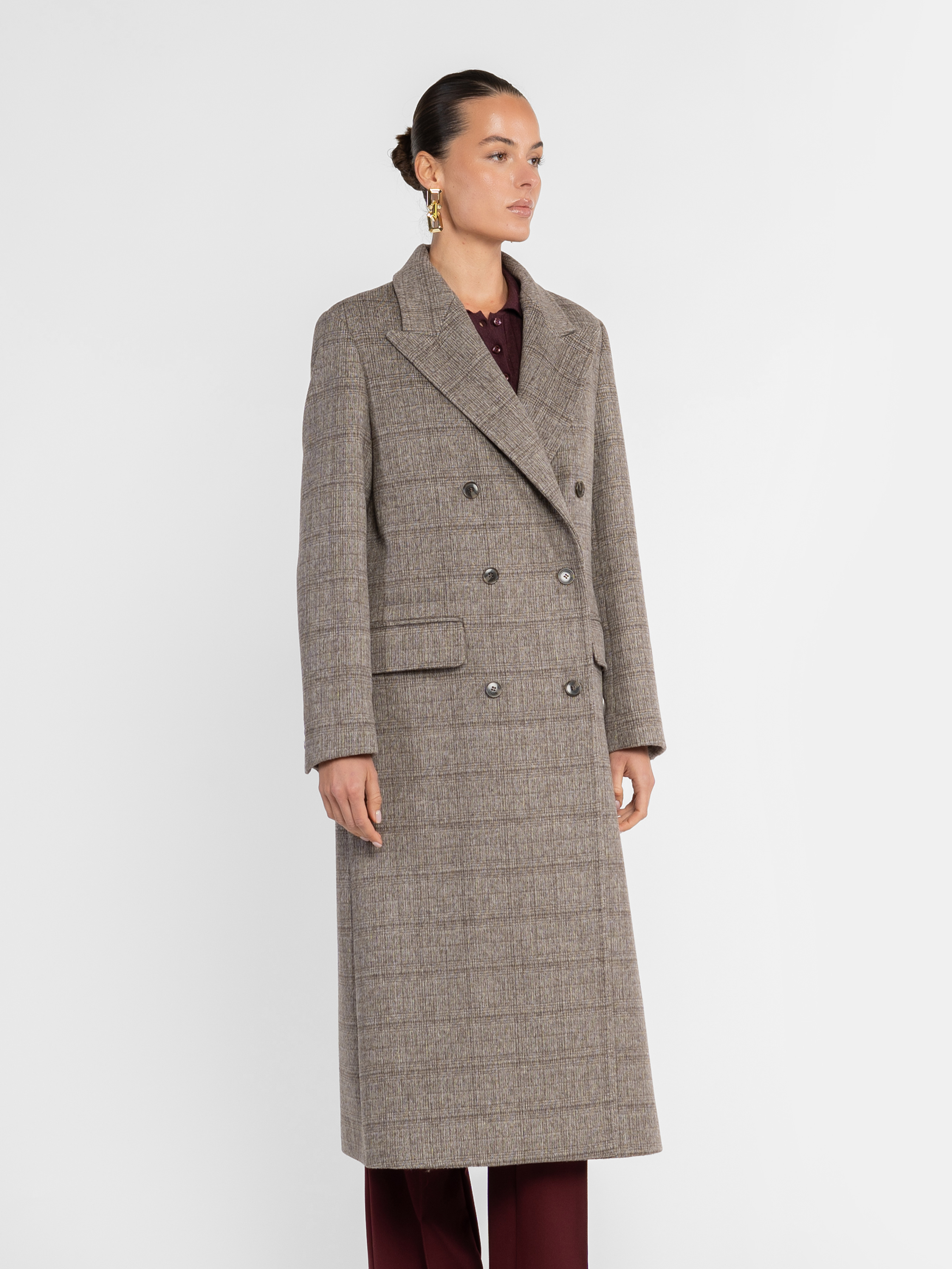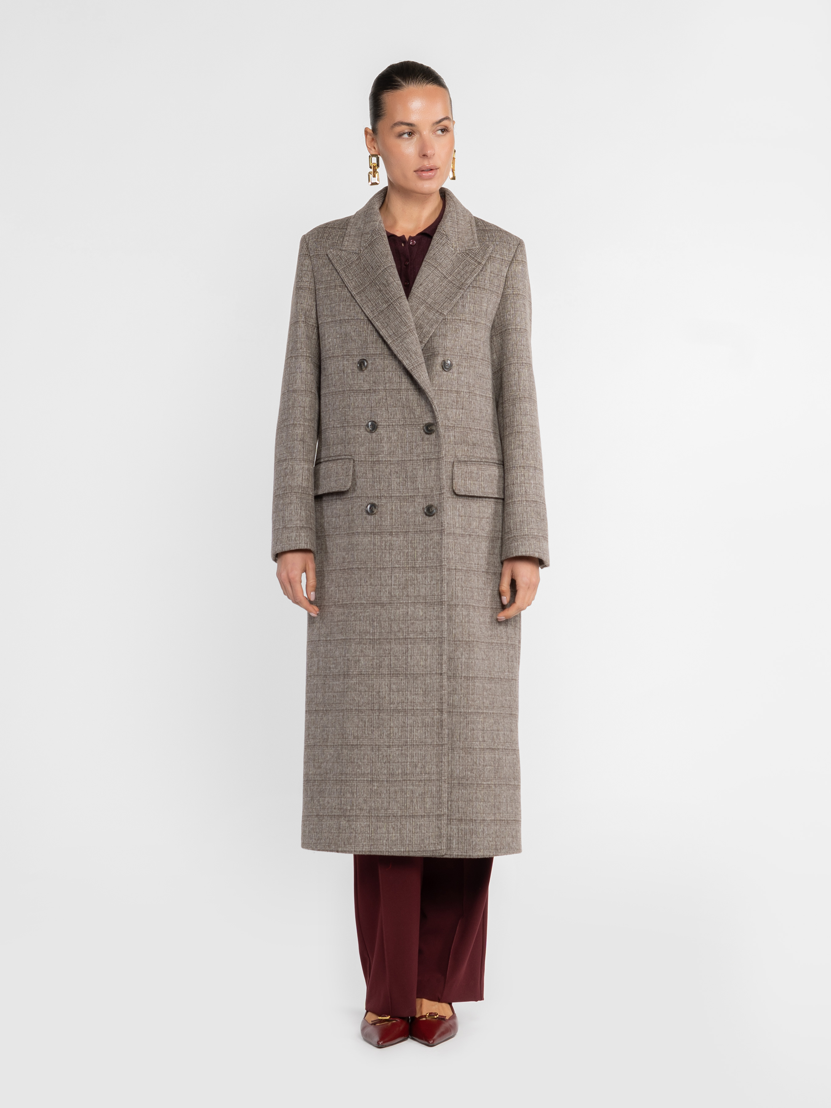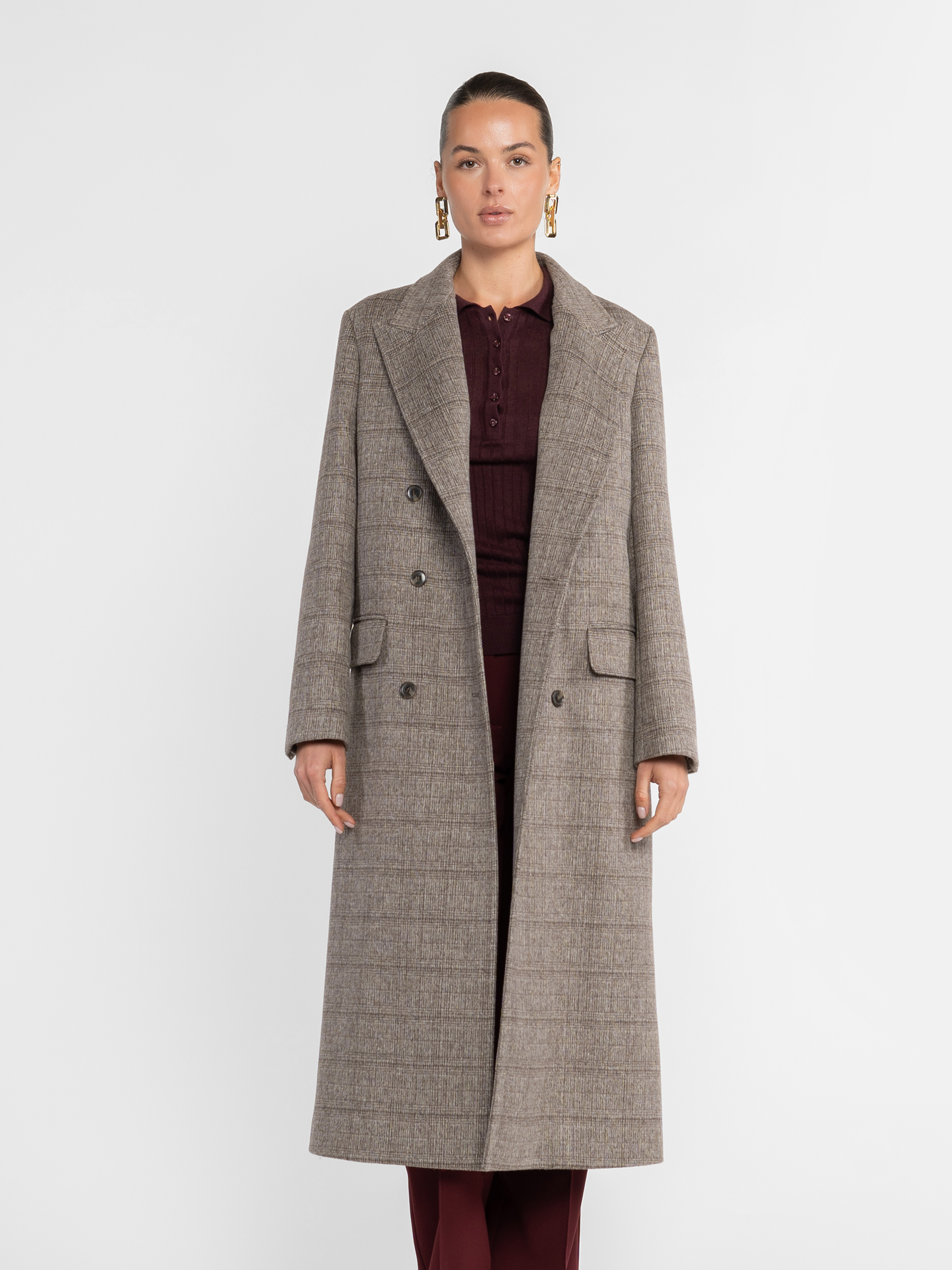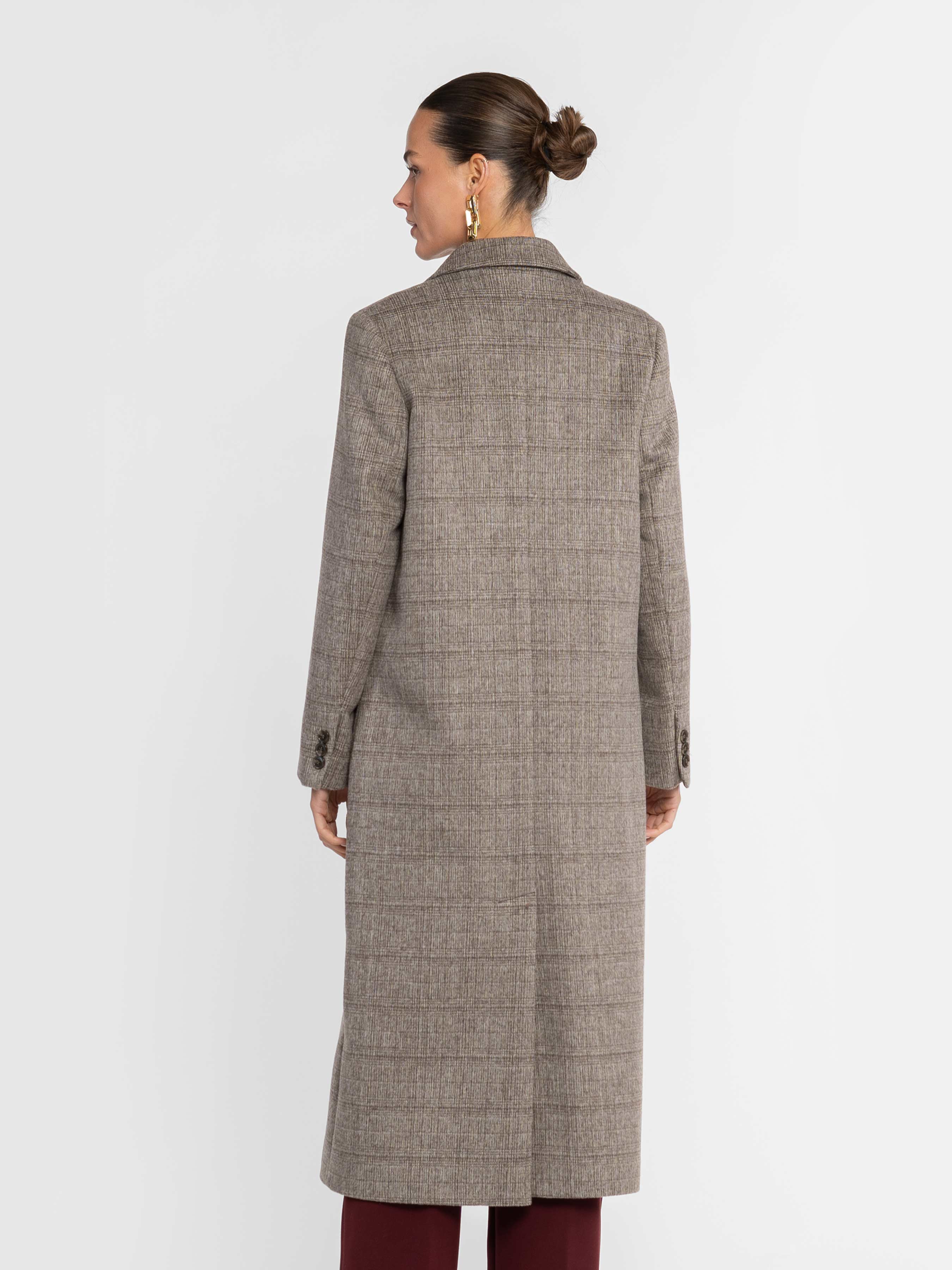Жіноче пальто Arber бежеве у клітину. Вовняна тканина дарує м’якість і тепло, зберігаючи бездоганну форму. Чітка лінія плеча, подовжений двобортний силует і гострі лацкани — класика, що звучить по-новому. Пальто, яке говорить за вас — стримана впевненість, зчитувана з першого погляду. Модель на фото у розмірі 42. Зріст: 178 см. Параметри: 89/60/90