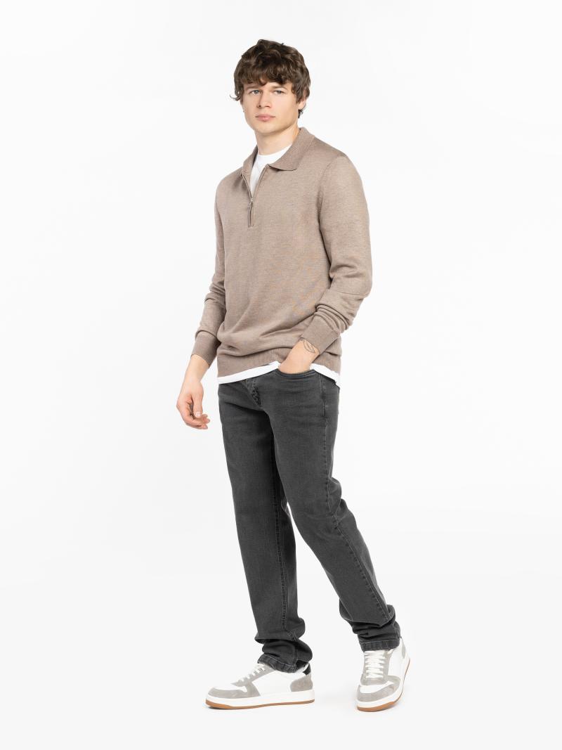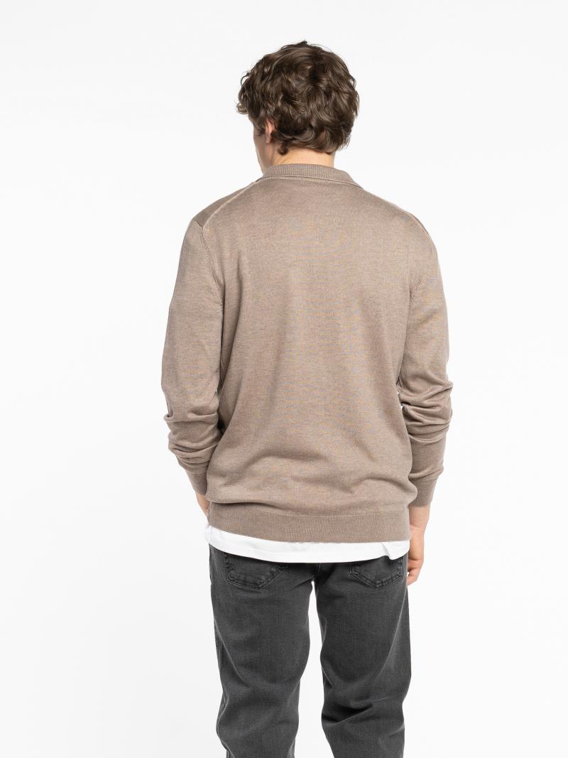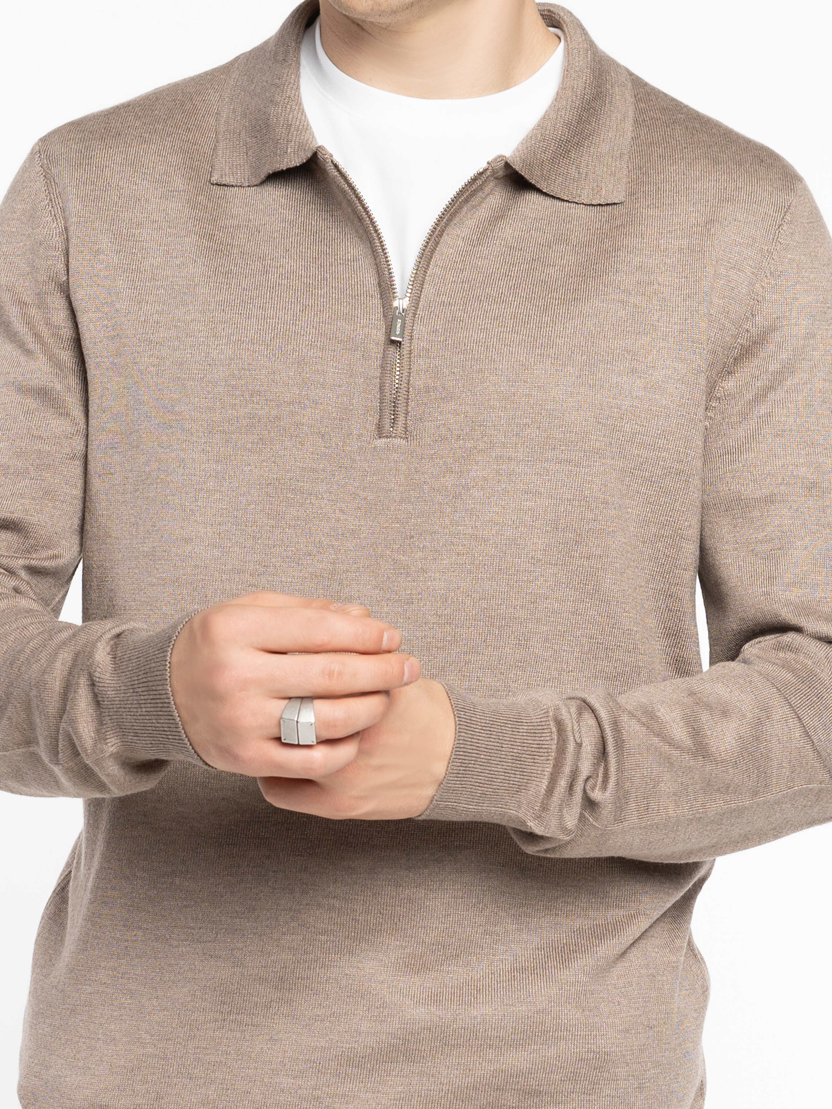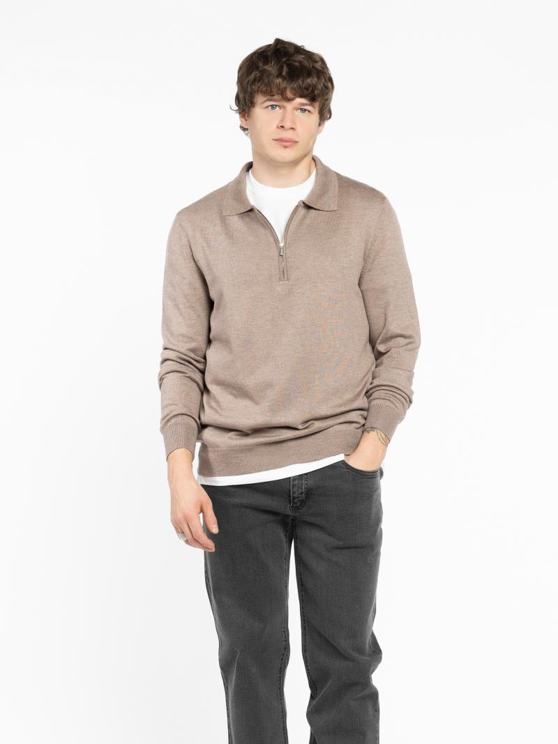 Чоловіче поло Arber бежевого кольору з тонкої бавовняної пряжі з додаванням натуральної вовни. М’яка тканина приємна на дотик, забезпечує комфорт і свободу рухів. Модель із довгими рукавами та застібкою на блискавку додає сучасного акценту. Легко поєднується з джинсами або брюками для стильного, лаконічного образу. Модель на фото: розмір 48, зріст 188 см, параметри 97/78/96