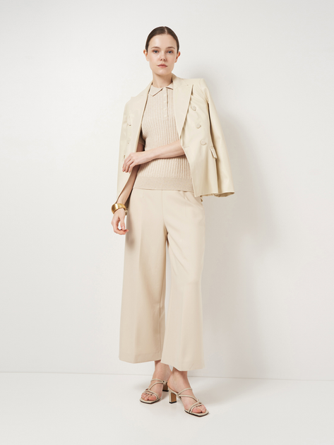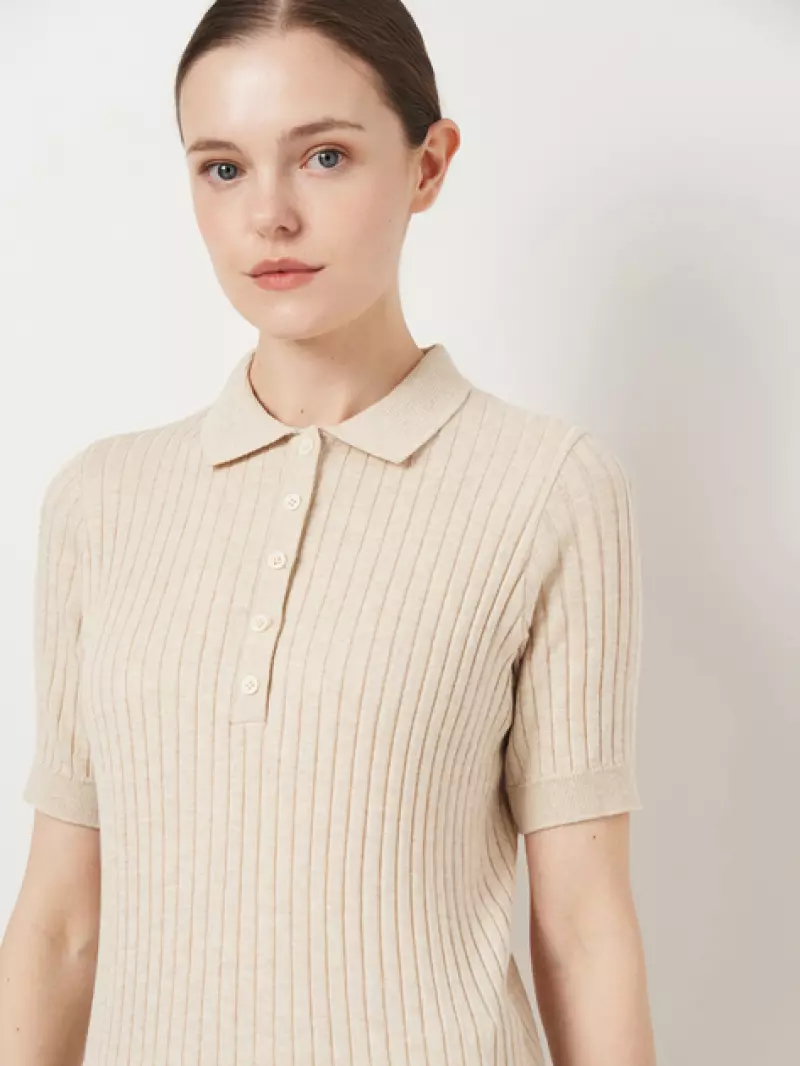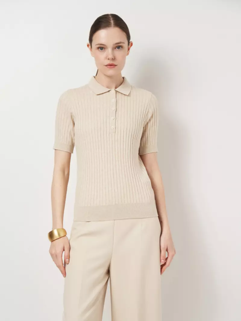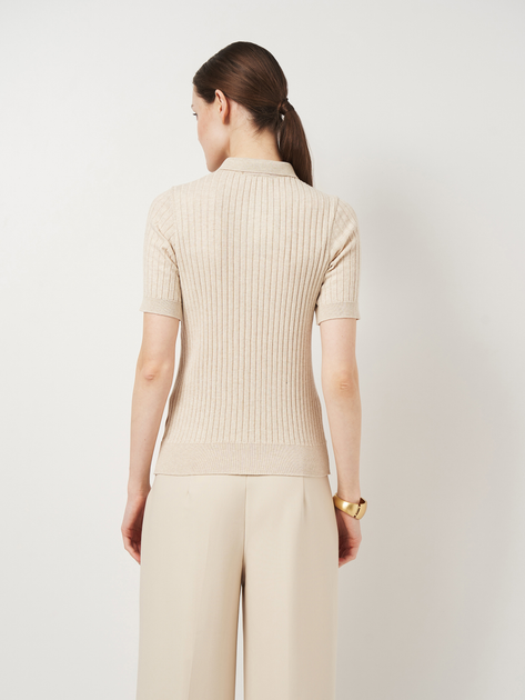 Жіноче поло бежевого кольору, пов'язане з м’якого 100% бавовняного трикотажу з рельєфною смужкою. Модель має рукав до плеча та застібку на п’ять ґудзиків. Еластична структура тканини забезпечує комфортну посадку по фігурі без обмеження рухів. Мінімалістичний дизайн і нейтральний колір роблять це поло універсальним базовим елементом гардероба для щоденних образів.