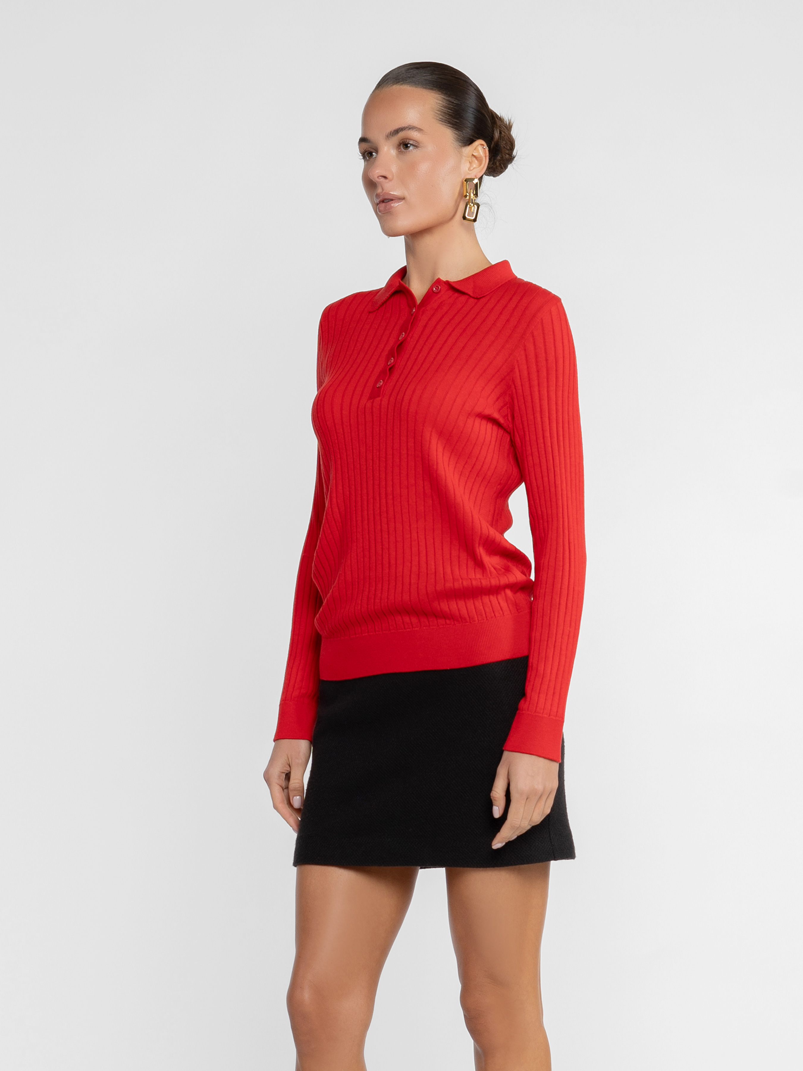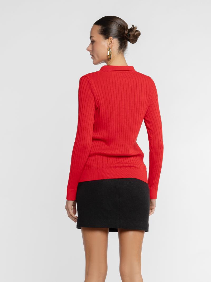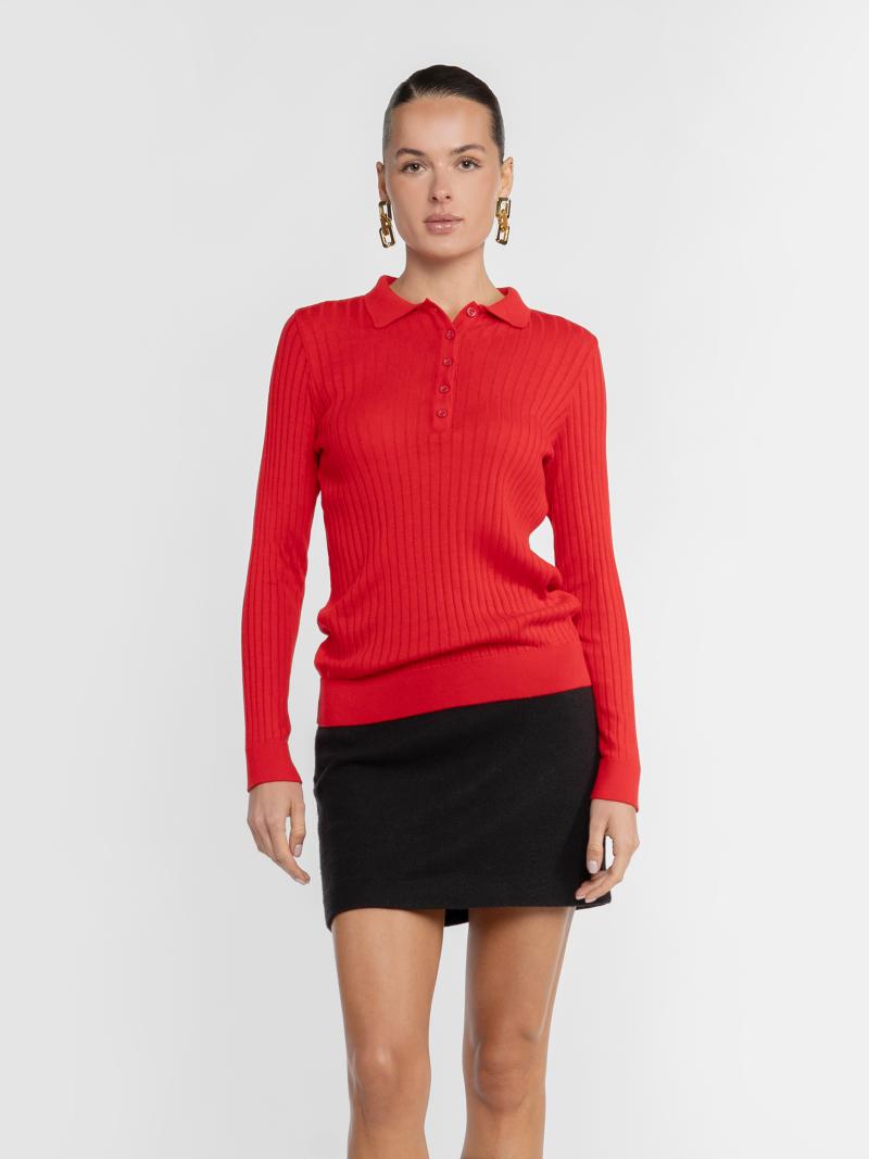 Жіноче поло Arber червоного кольору в рубчик, пов'язане з додаванням натуральної бавовни, м’який трикотаж ніжно облягає фігуру і не сковує рухів. Застібка на п’ять ґудзиків та довгий рукав, створюють лаконічний крій та роблять модель універсальною для щоденних casual-луків або layering-комбінацій. Модель на фото у розмірі 42. Зріст: 178 см. Параметри: 89/60/90