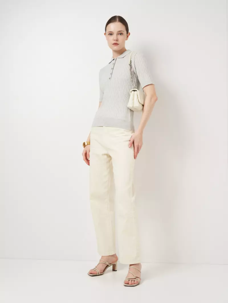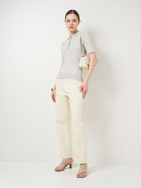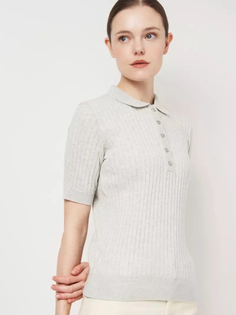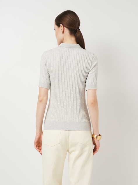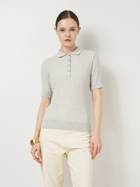 Жіноче поло сірого кольору, пов'язане з м’якого 100% бавовняного трикотажу з рельєфною смужкою. Модель має рукав до плеча та застібку на п’ять ґудзиків. Еластична структура тканини забезпечує комфортну посадку по фігурі без обмеження рухів. Мінімалістичний дизайн і нейтральний колір роблять це поло універсальним базовим елементом гардероба для щоденних образів.